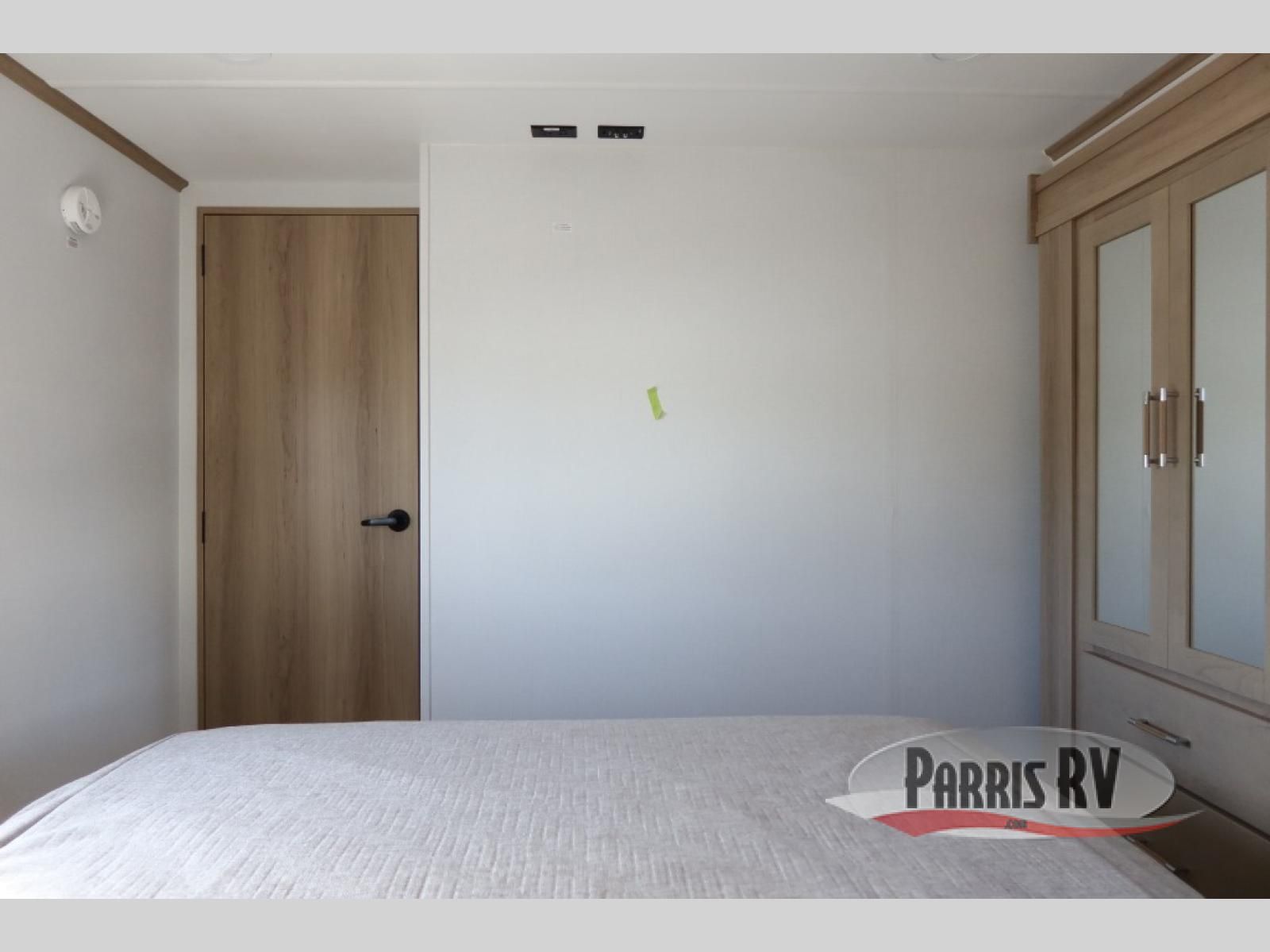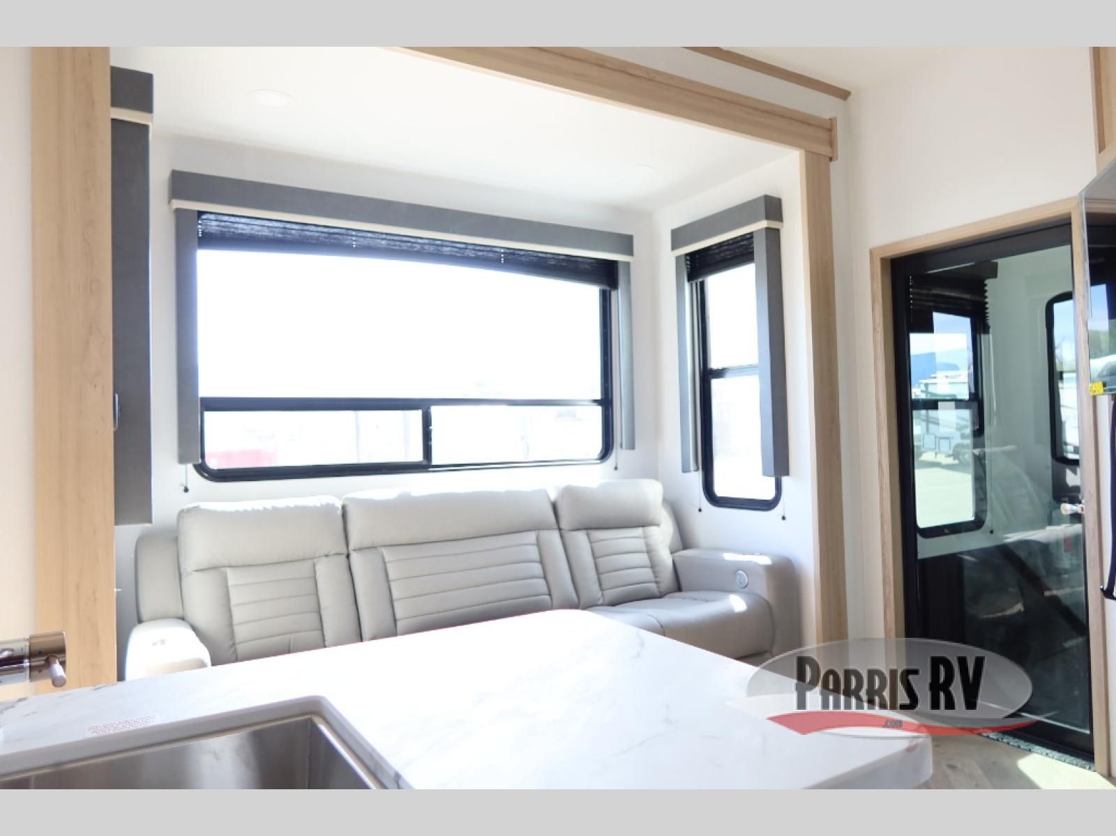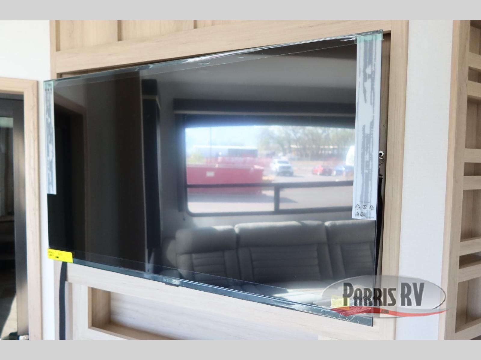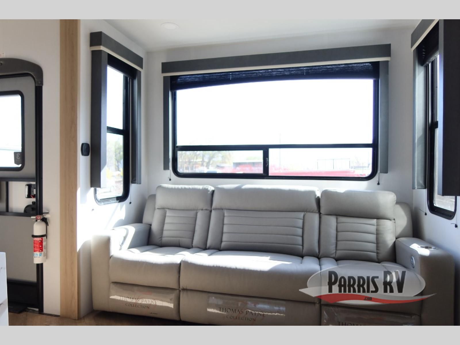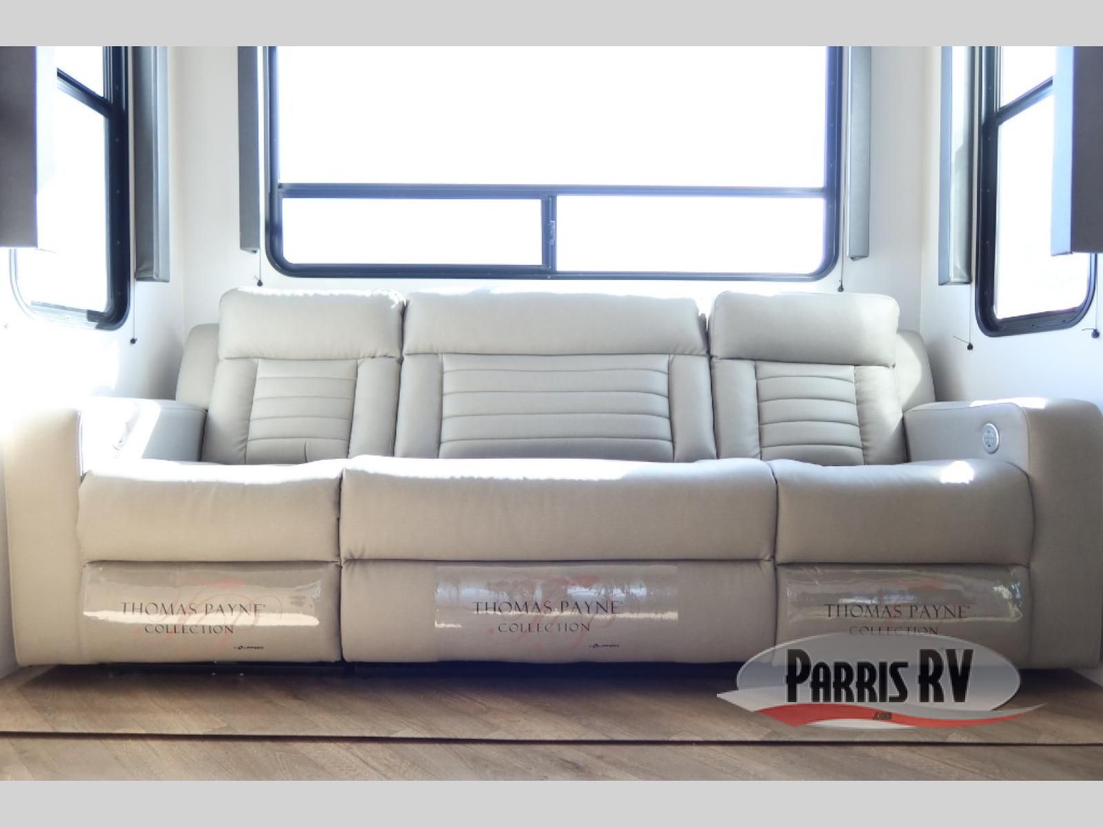 Featuring a spacious king bed with nightstands on each side, this front private bedroom will be your favorite spot to rest! The wardrobe with drawers provides ample storage for your clothes and personal items, helping you stay organized on the road. The bath and a half layout provides convenience and flexibility, ensuring that everyone has their own space to get ready in the morning. The living area is a vibrant hub of entertainment, featuring a reclining sofa with lumbar support and a tilting headrest. The state-of-the-art entertainment center with smart LED TV provides endless hours of fun, while the microwave and sink make meal prep a snap. Further, the garage is designed for ultimate adventure, with ample space for your favorite toys and an electric bed with dual opposing sofas that convert into a comfortable sleeping area.
