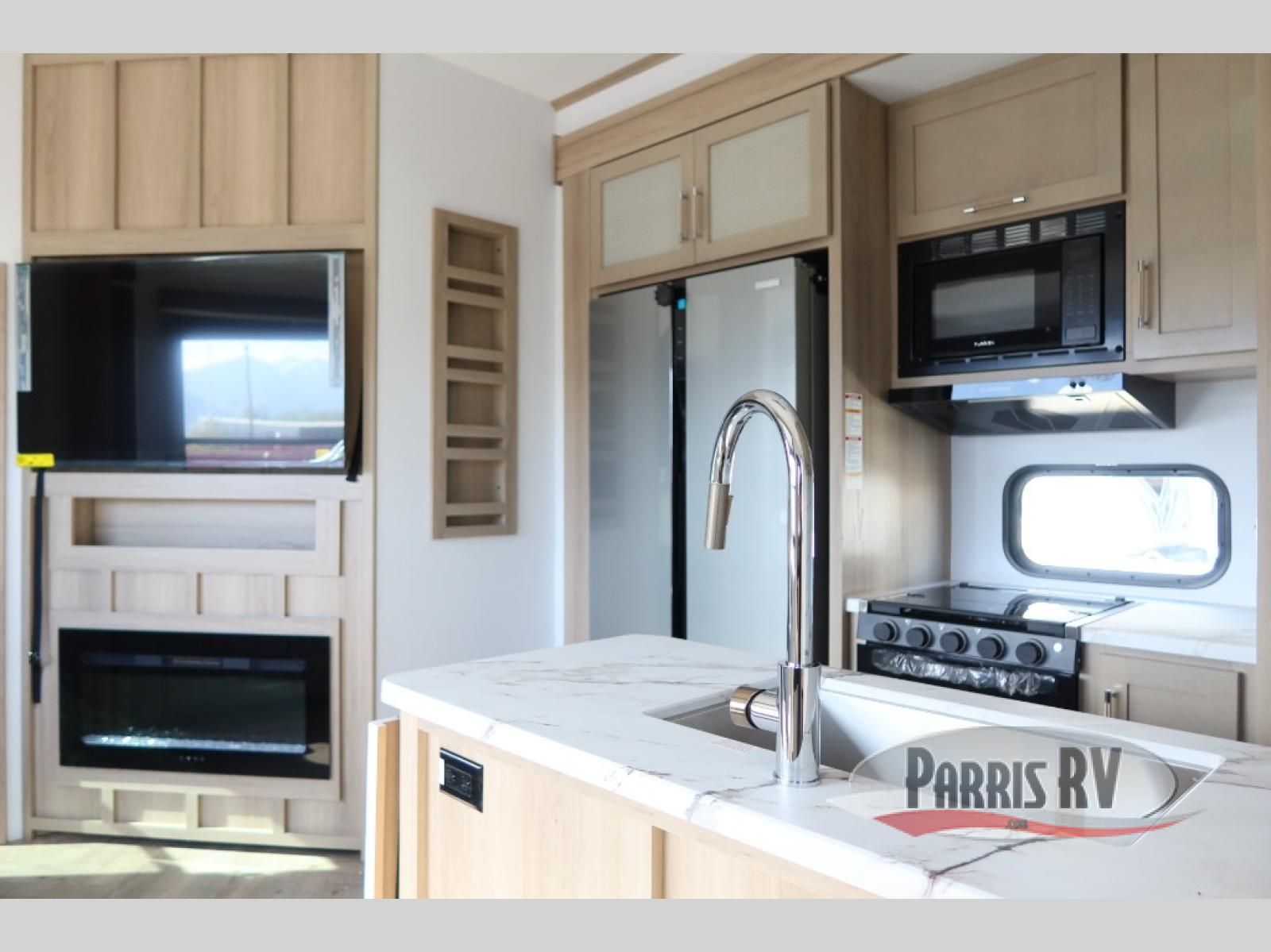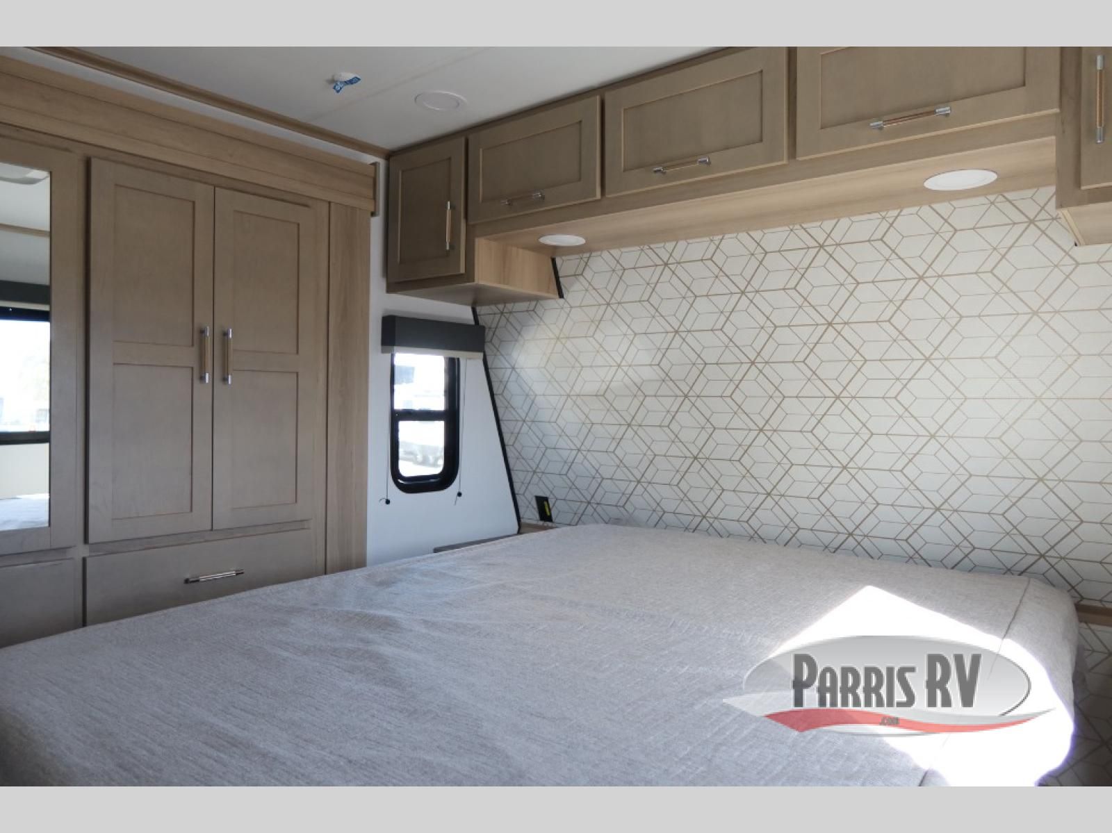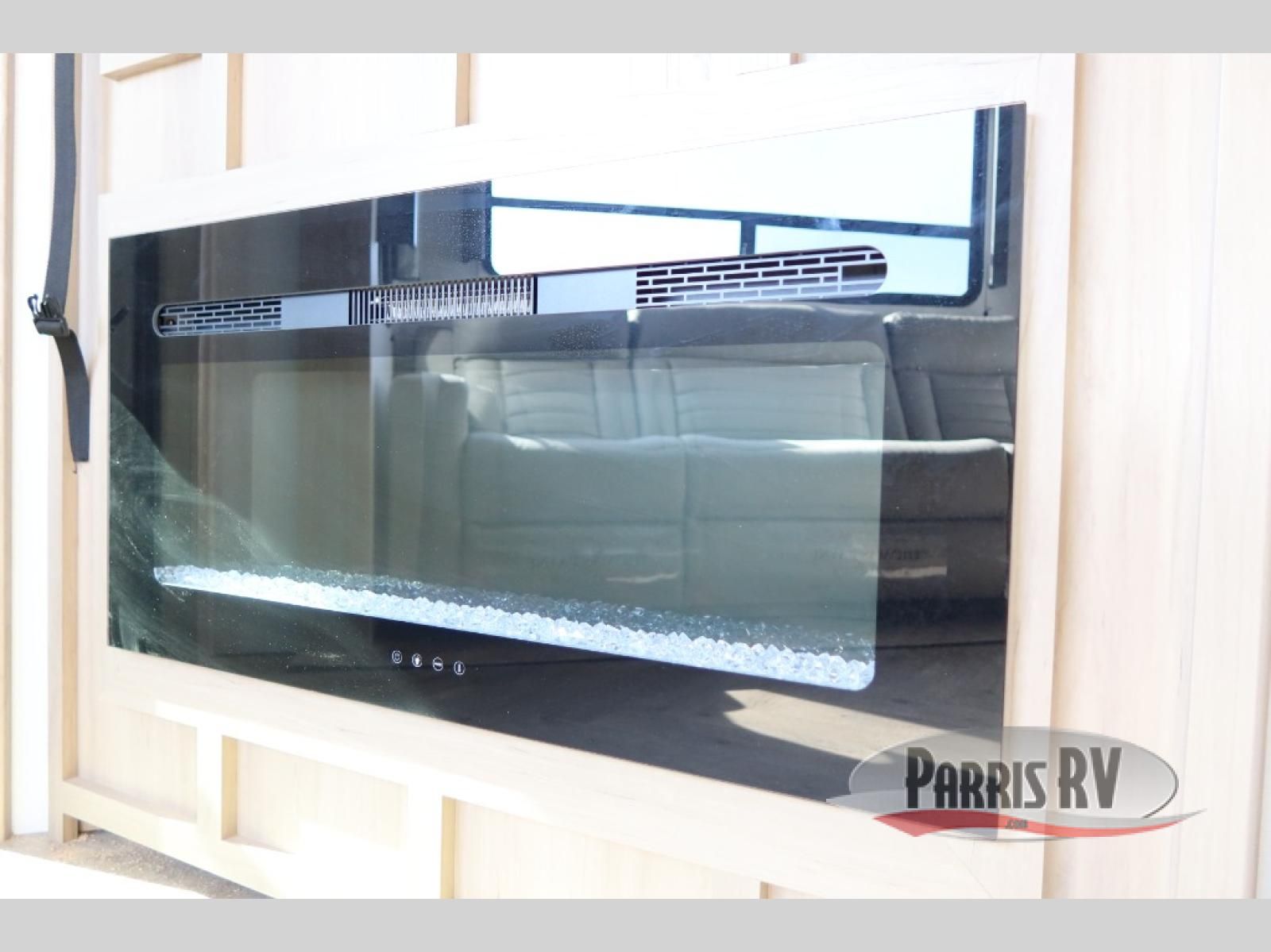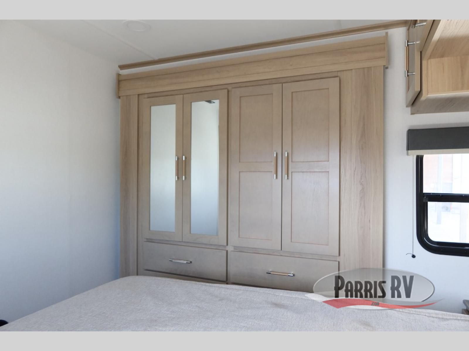 Featuring a spacious king bed with nightstands on each side, this front private bedroom will be your favorite spot to rest! The wardrobe with drawers provides ample storage for your clothes and personal items, helping you stay organized on the road. The bath and a half layout provides convenience and flexibility, ensuring that everyone has their own space to get ready in the morning. The living area is a vibrant hub of entertainment, featuring a reclining sofa with lumbar support and a tilting headrest. The state-of-the-art entertainment center with smart LED TV provides endless hours of fun, while the microwave and sink make meal prep a snap. Further, the garage is designed for ultimate adventure, with ample space for your favorite toys and an electric bed with dual opposing sofas that convert into a comfortable sleeping area.