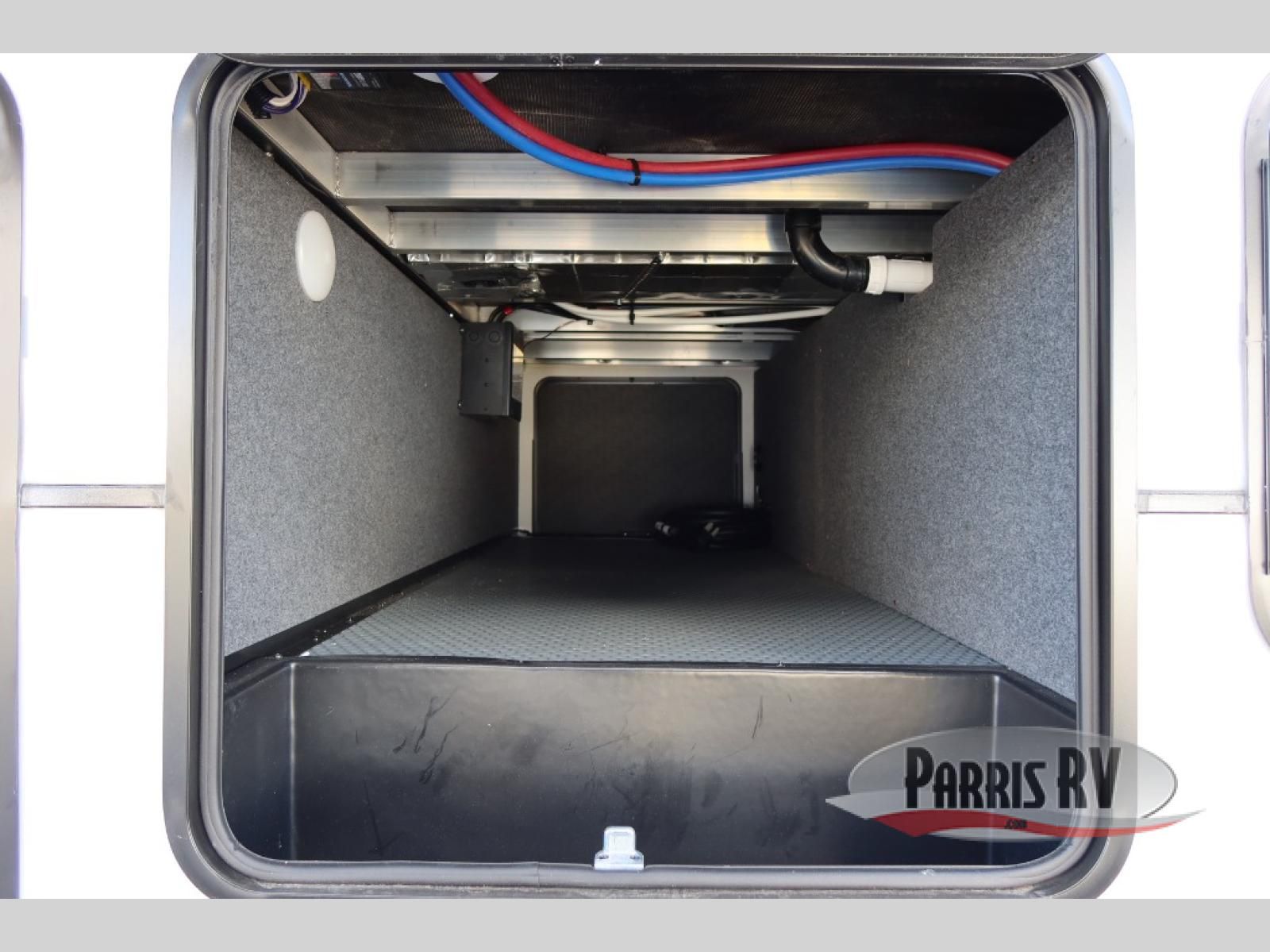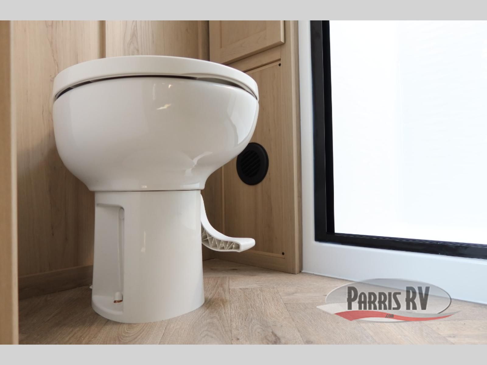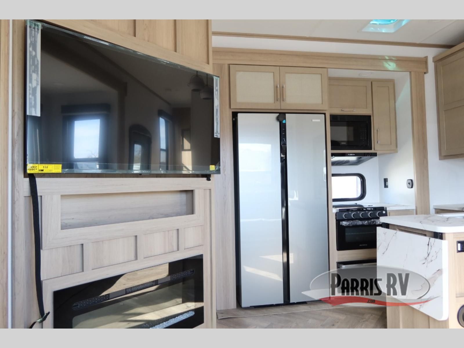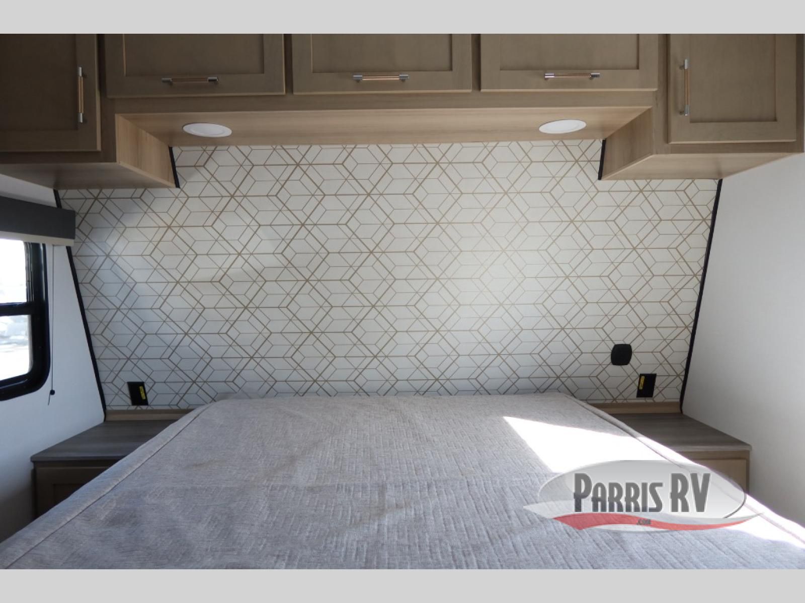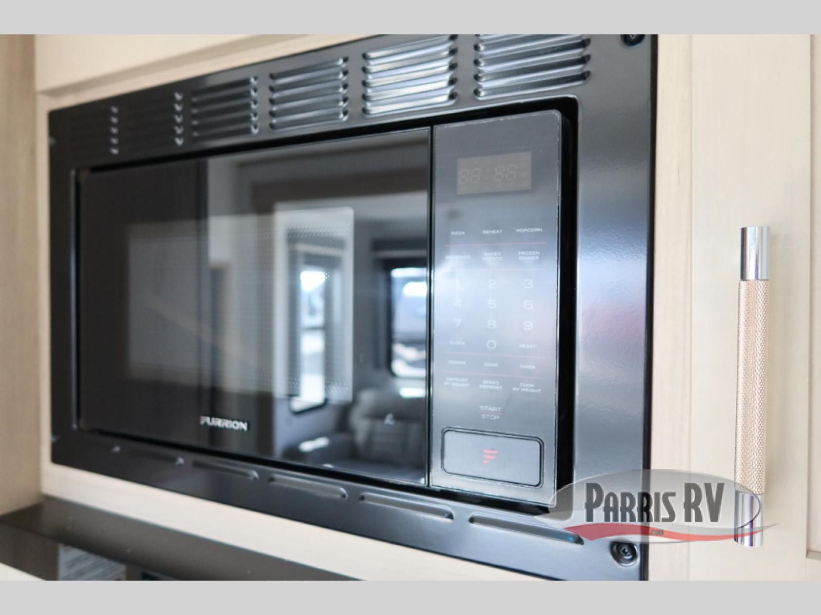 Featuring a spacious king bed with nightstands on each side, this front private bedroom will be your favorite spot to rest! The wardrobe with drawers provides ample storage for your clothes and personal items, helping you stay organized on the road. The bath and a half layout provides convenience and flexibility, ensuring that everyone has their own space to get ready in the morning. The living area is a vibrant hub of entertainment, featuring a reclining sofa with lumbar support and a tilting headrest. The state-of-the-art entertainment center with smart LED TV provides endless hours of fun, while the microwave and sink make meal prep a snap. Further, the garage is designed for ultimate adventure, with ample space for your favorite toys and an electric bed with dual opposing sofas that convert into a comfortable sleeping area.