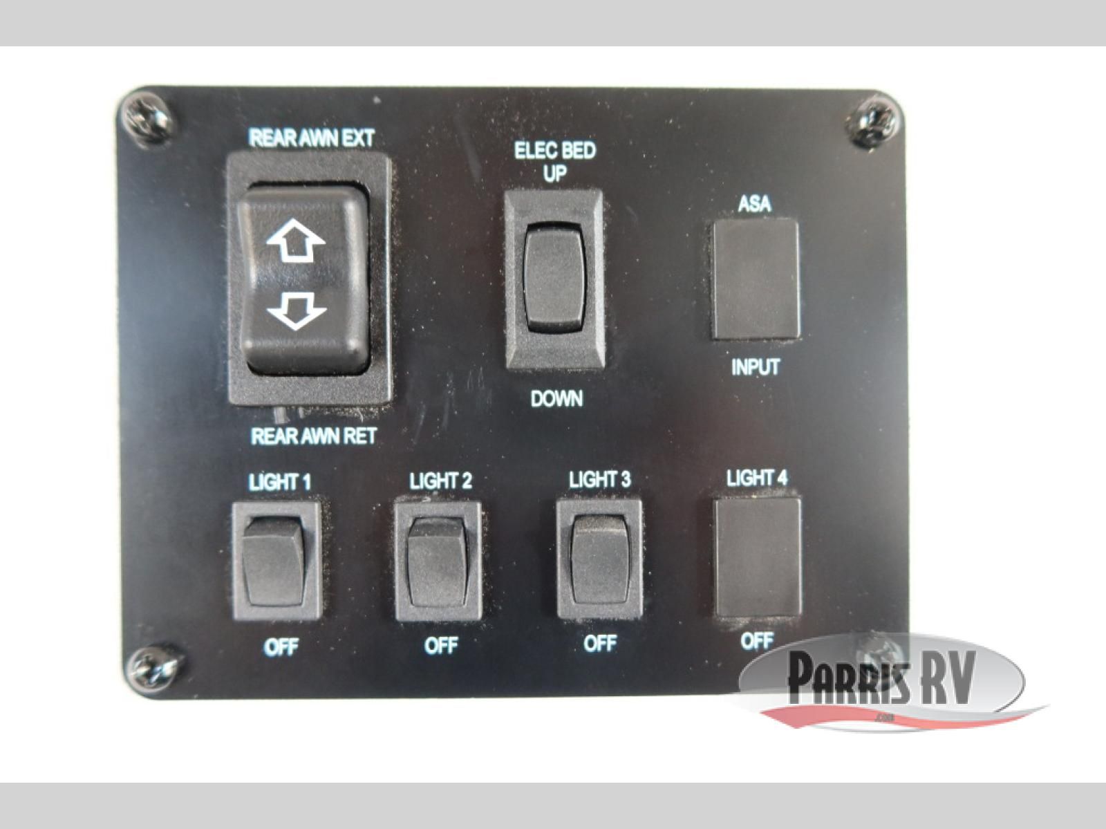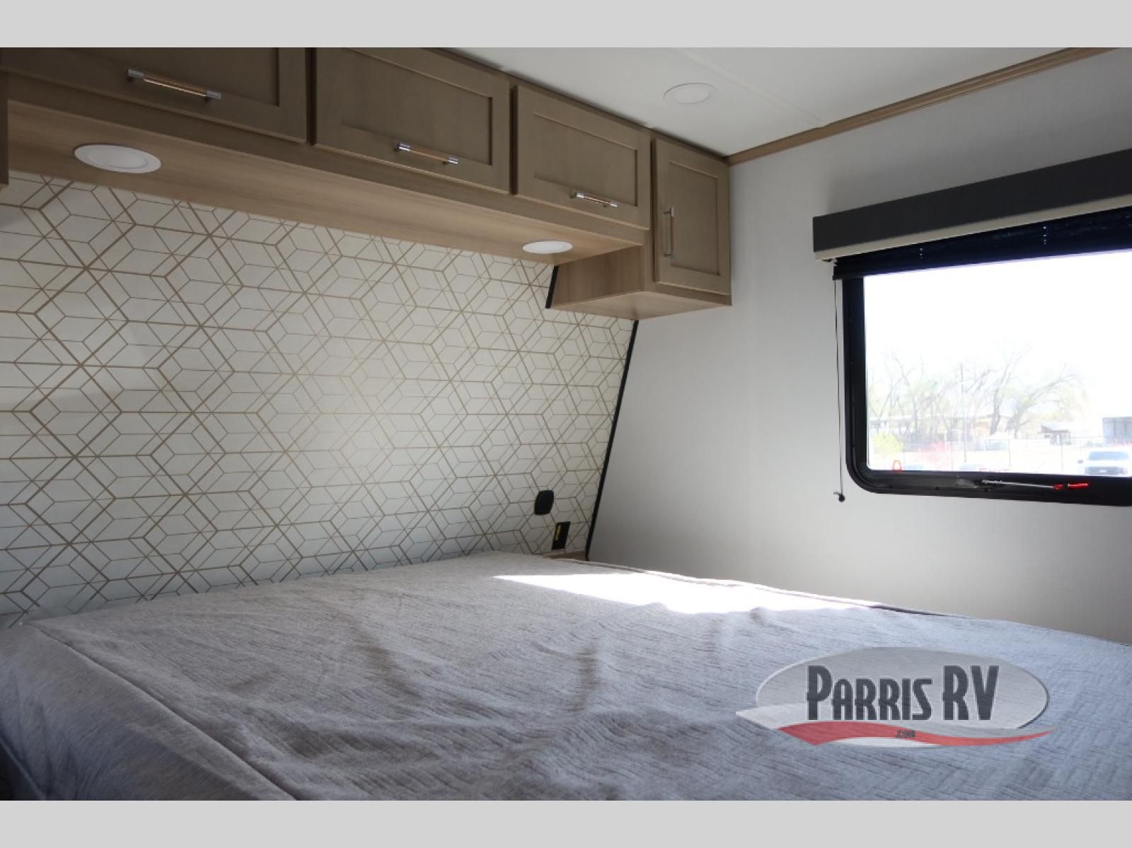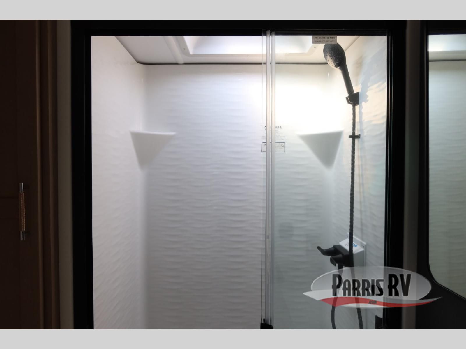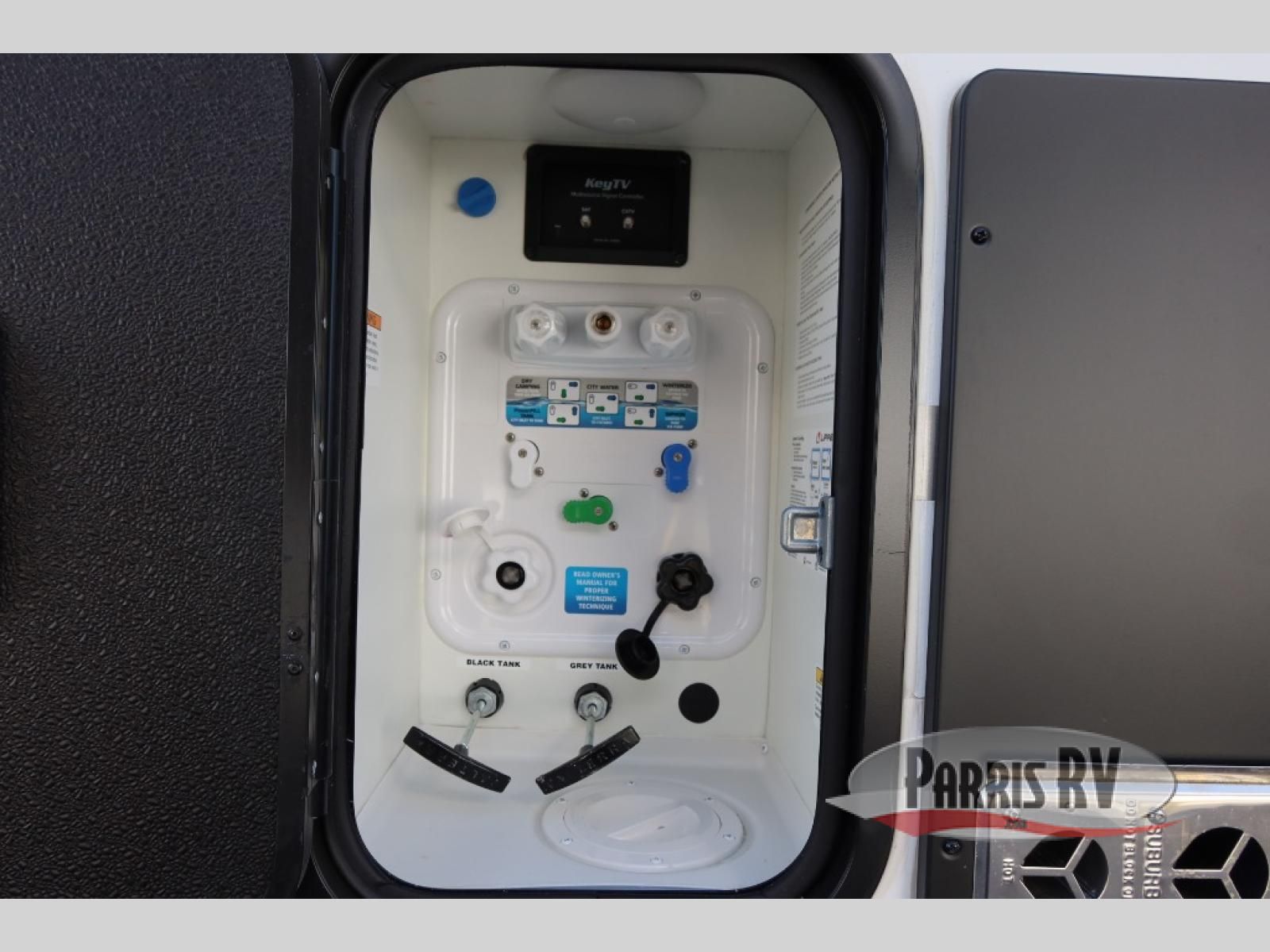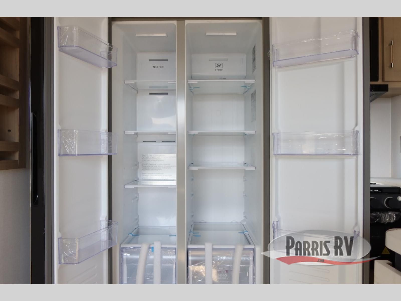 Featuring a spacious king bed with nightstands on each side, this front private bedroom will be your favorite spot to rest! The wardrobe with drawers provides ample storage for your clothes and personal items, helping you stay organized on the road. The bath and a half layout provides convenience and flexibility, ensuring that everyone has their own space to get ready in the morning. The living area is a vibrant hub of entertainment, featuring a reclining sofa with lumbar support and a tilting headrest. The state-of-the-art entertainment center with smart LED TV provides endless hours of fun, while the microwave and sink make meal prep a snap. Further, the garage is designed for ultimate adventure, with ample space for your favorite toys and an electric bed with dual opposing sofas that convert into a comfortable sleeping area.