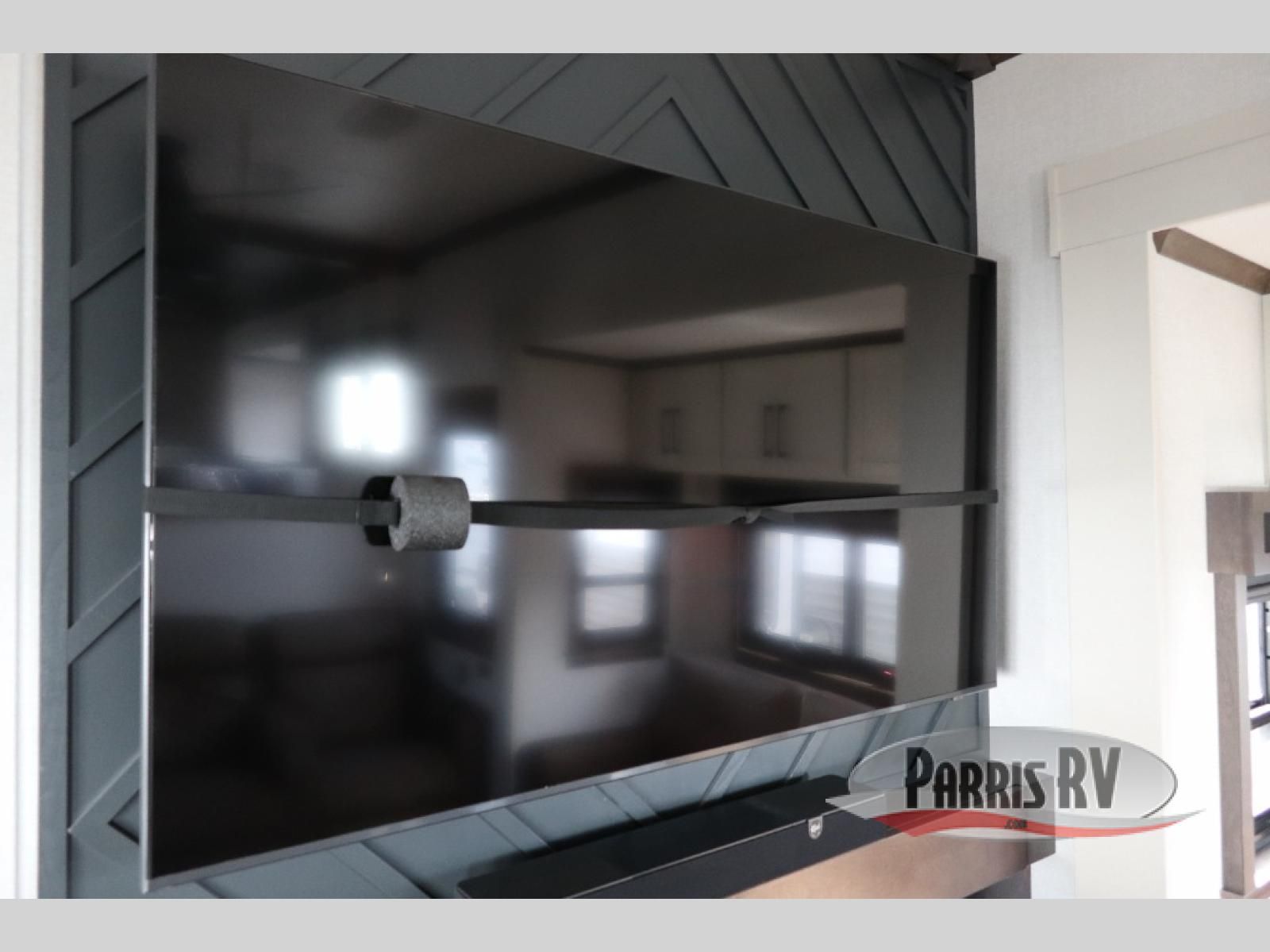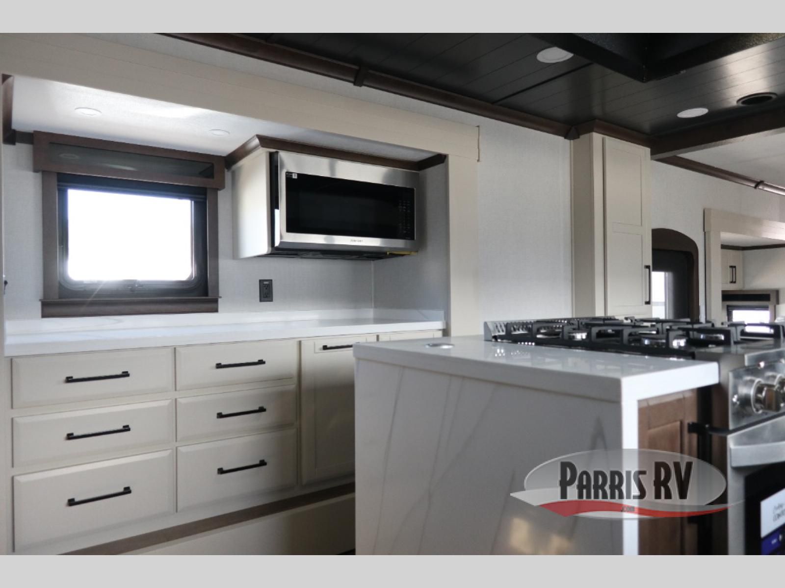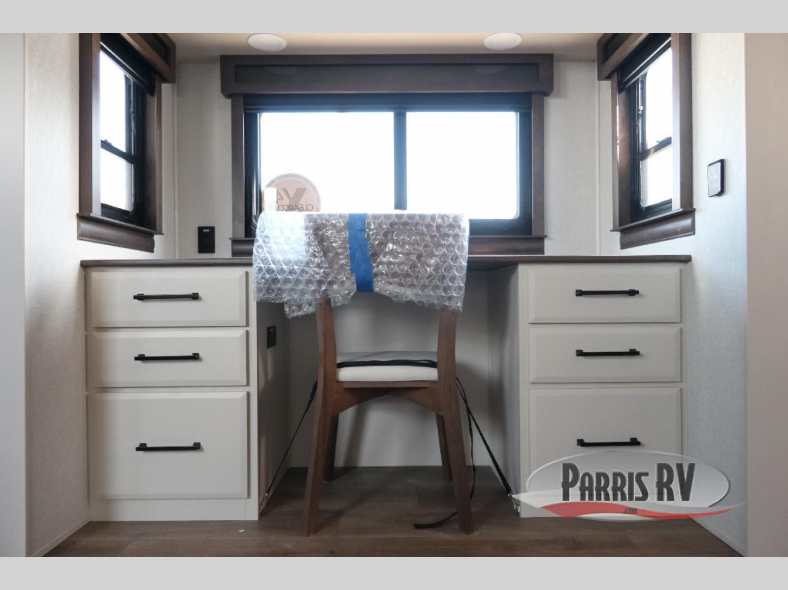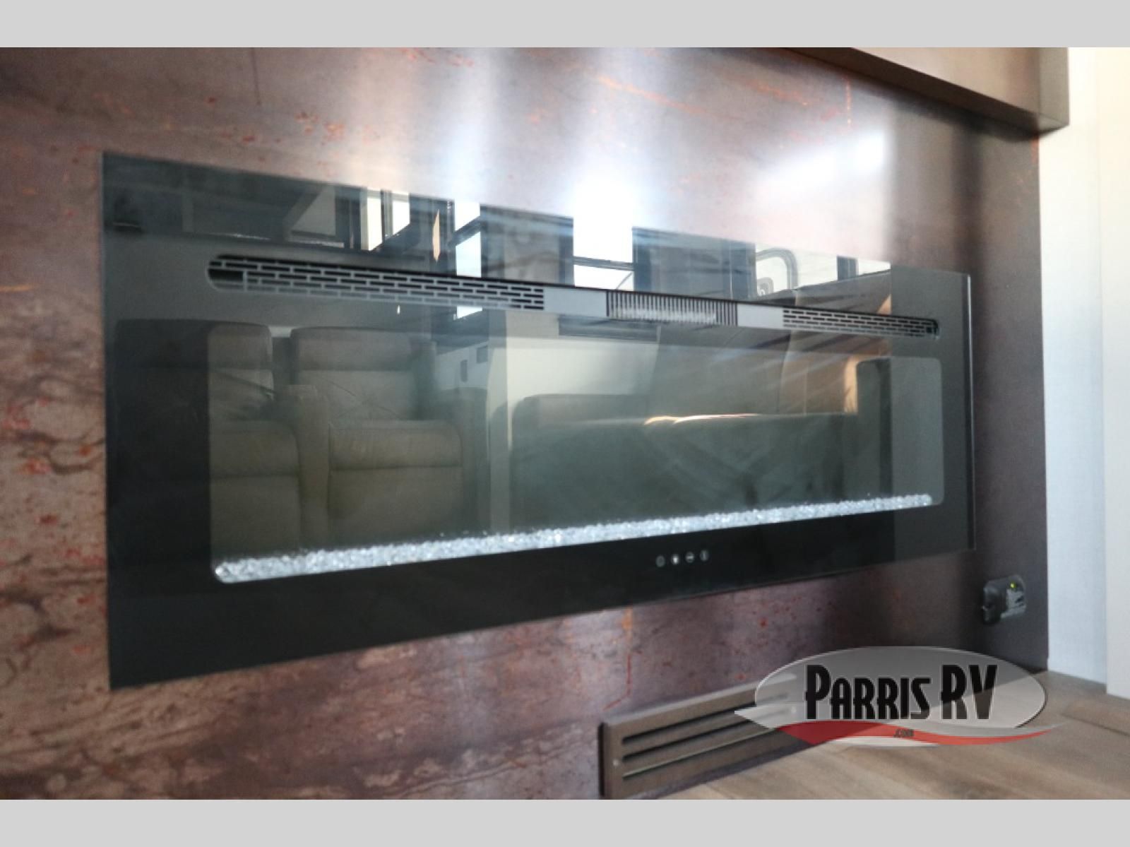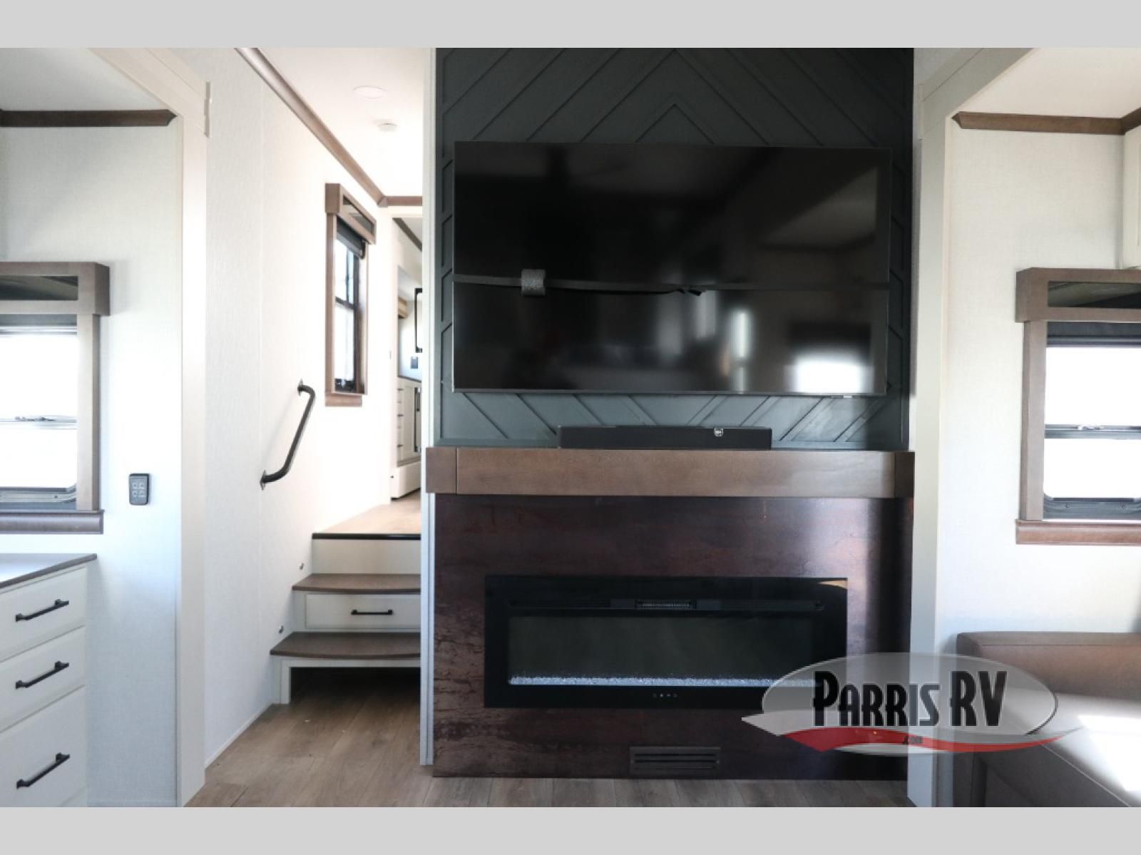 You will feel right at home in this fifth wheel! The rear private bedroom has a 72" x 80" king bed slide for a good night's rest, a rear large wardrobe with the washer and dryer next to it, and even a dresser with a 40" LED TV. And two can get ready at once in the full bathroom with the dual sink vanity. You can then head to either the desk slide to get some work done or whip up some scrambled eggs on the three burner cooktop at the island in the front kitchen. The kitchen even has a dishwasher for easy clean up and two bar stools at the high top dinette that overlooks the middle living area. Relax each night in true comfort on either the E-Z Glide sofa bed slide or the theater seating across from the entertainment center which has a fireplace and 65" Samsung LED Smart TV to watch your favorite movies!