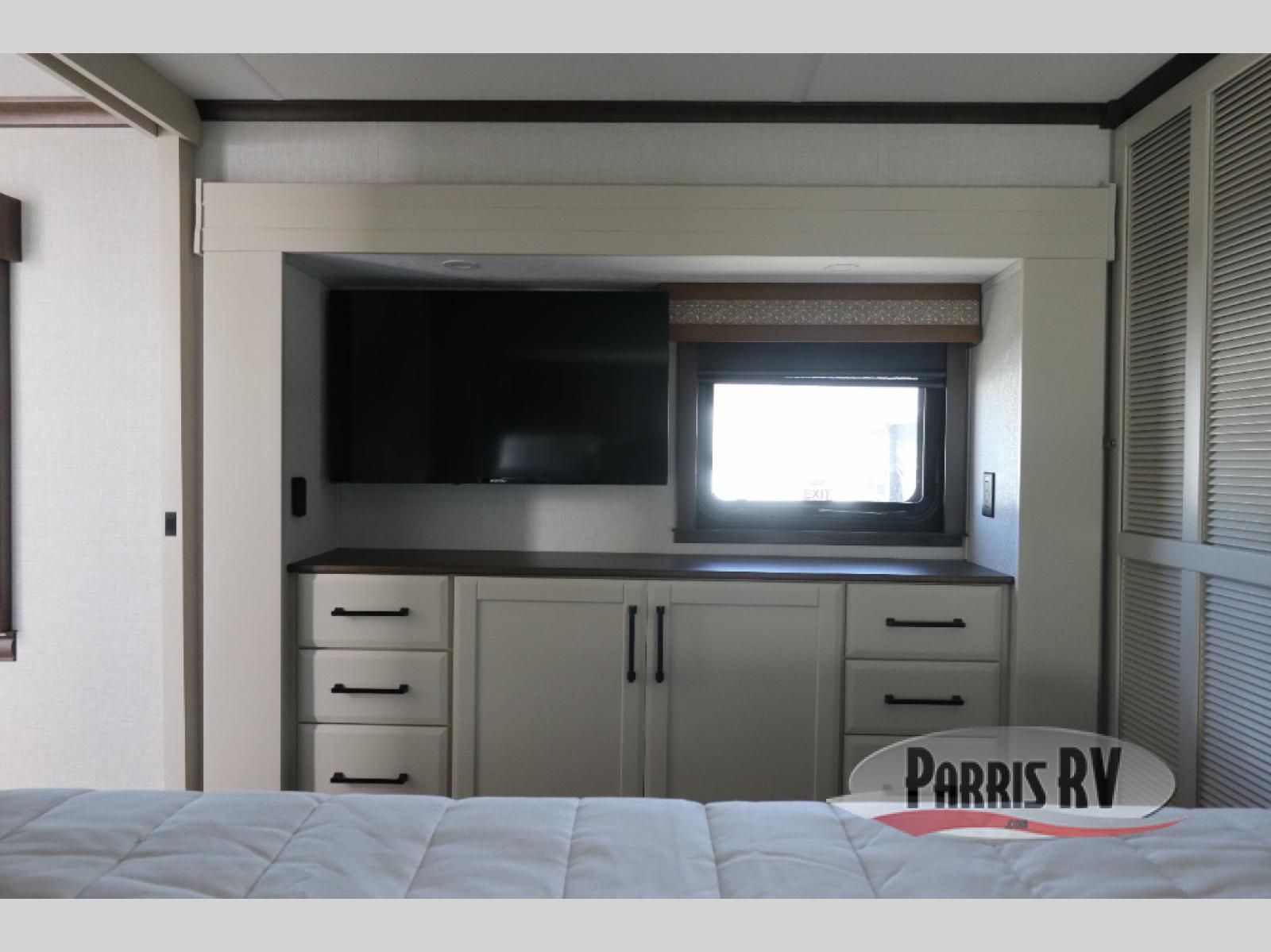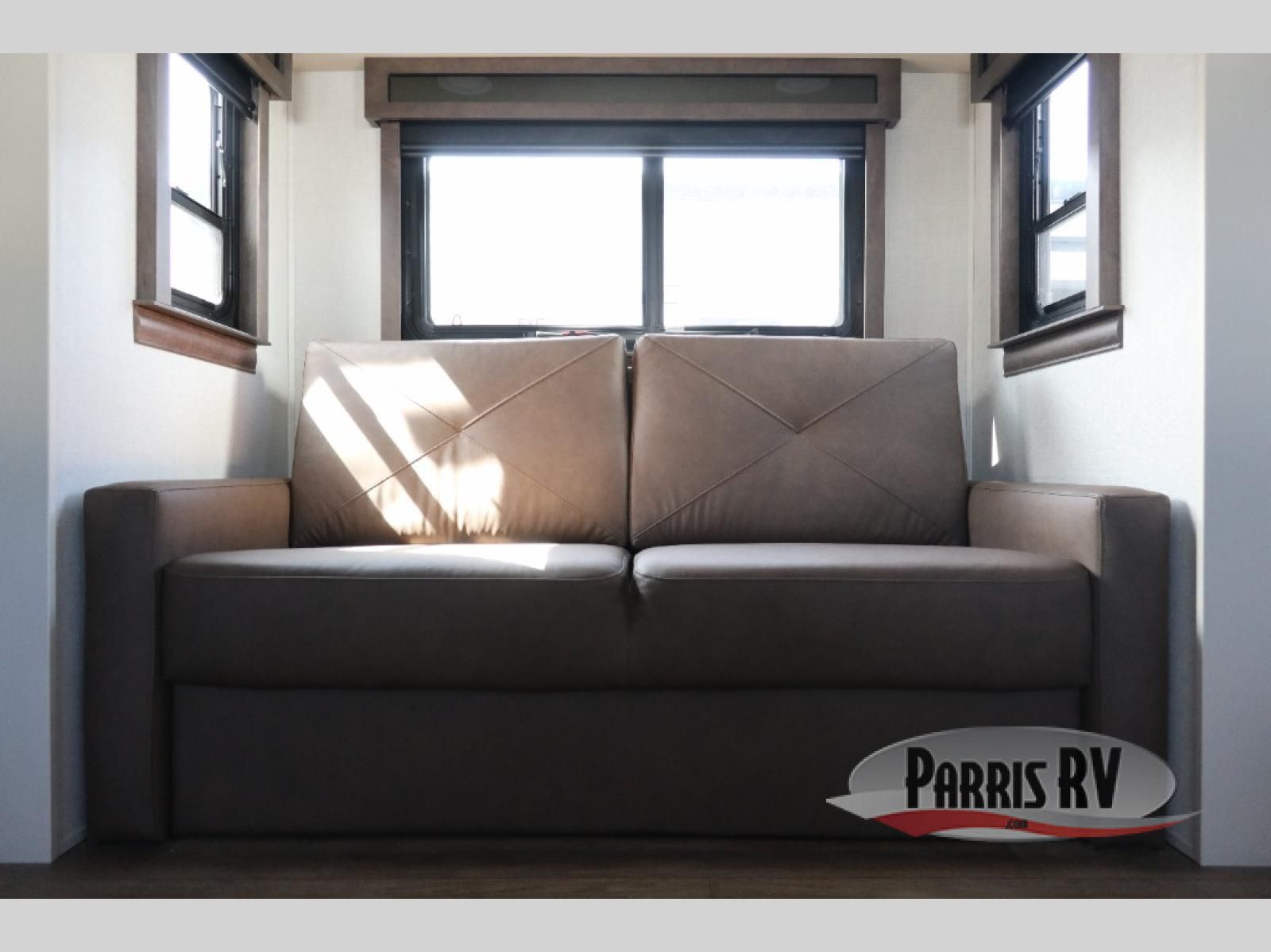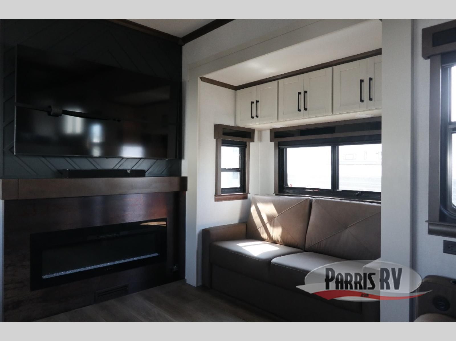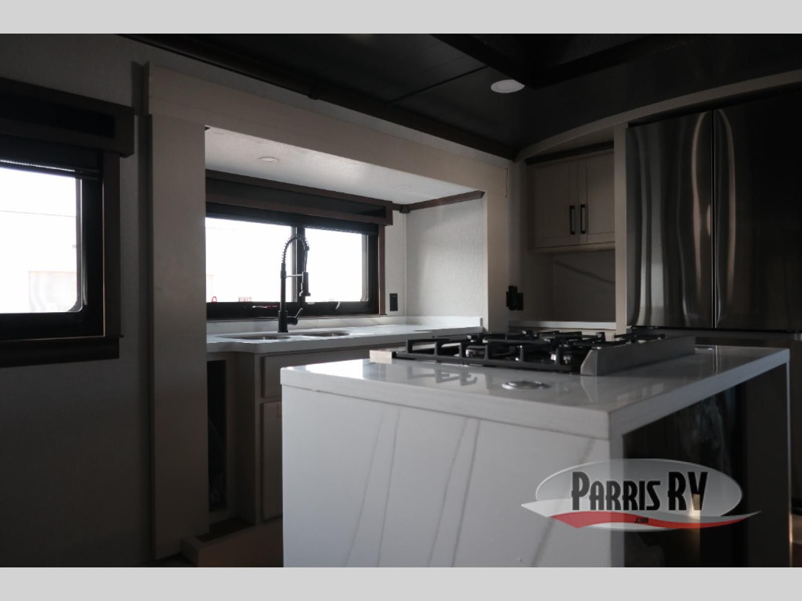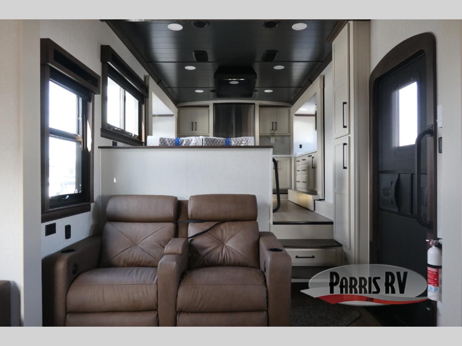 You will feel right at home in this fifth wheel! The rear private bedroom has a 72" x 80" king bed slide for a good night's rest, a rear large wardrobe with the washer and dryer next to it, and even a dresser with a 40" LED TV. And two can get ready at once in the full bathroom with the dual sink vanity. You can then head to either the desk slide to get some work done or whip up some scrambled eggs on the three burner cooktop at the island in the front kitchen. The kitchen even has a dishwasher for easy clean up and two bar stools at the high top dinette that overlooks the middle living area. Relax each night in true comfort on either the E-Z Glide sofa bed slide or the theater seating across from the entertainment center which has a fireplace and 65" Samsung LED Smart TV to watch your favorite movies!