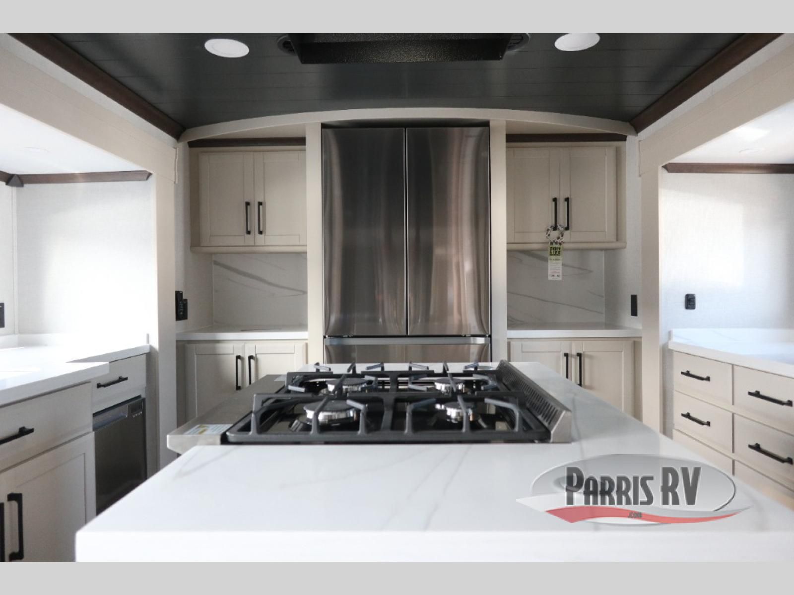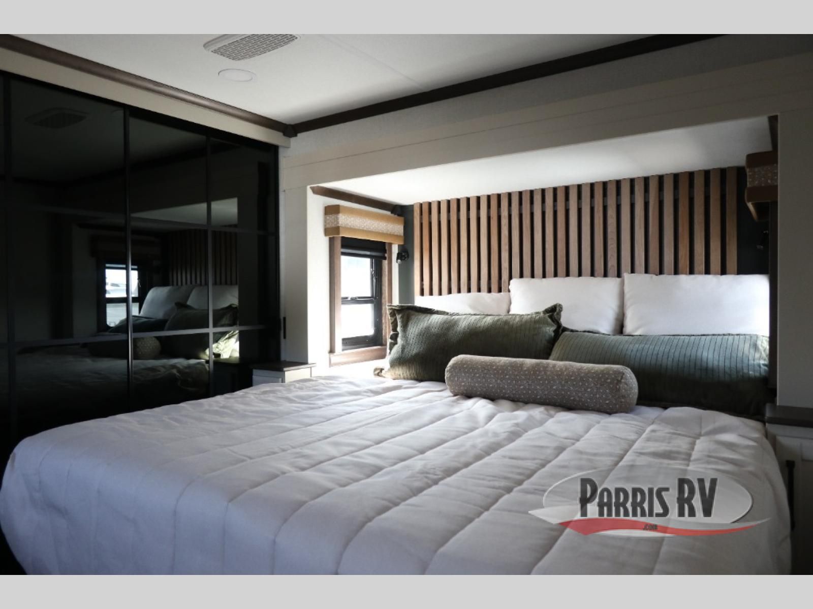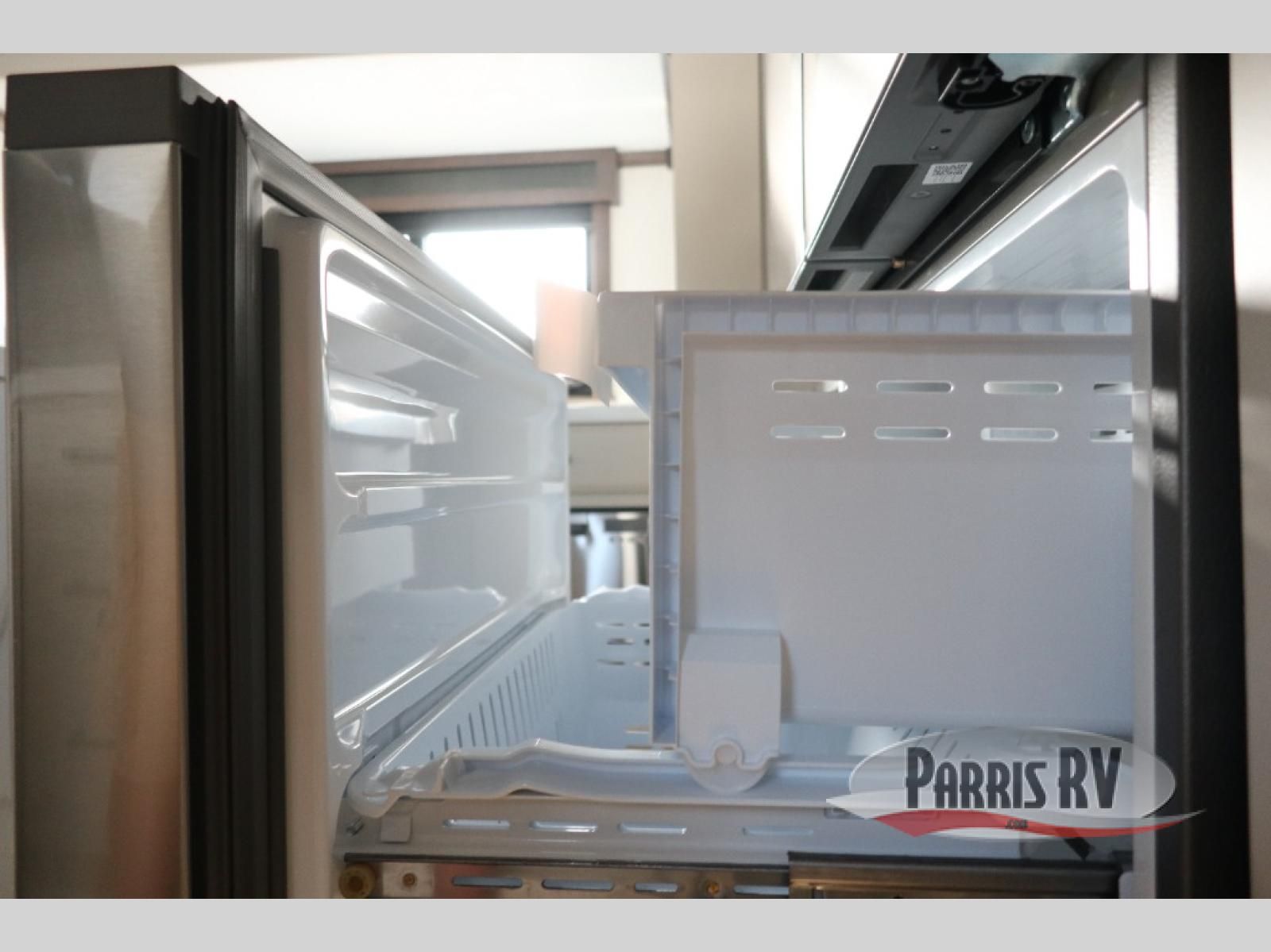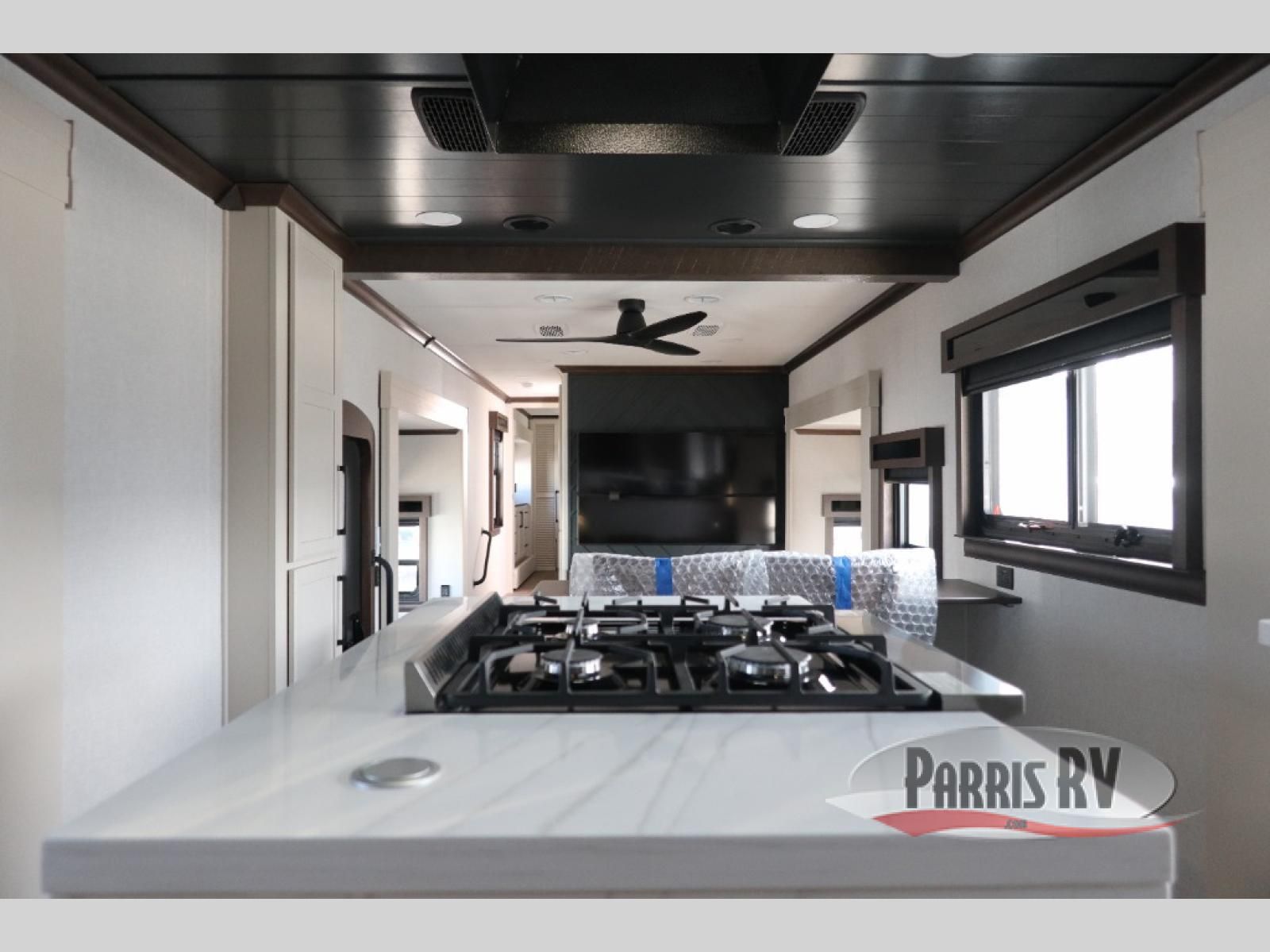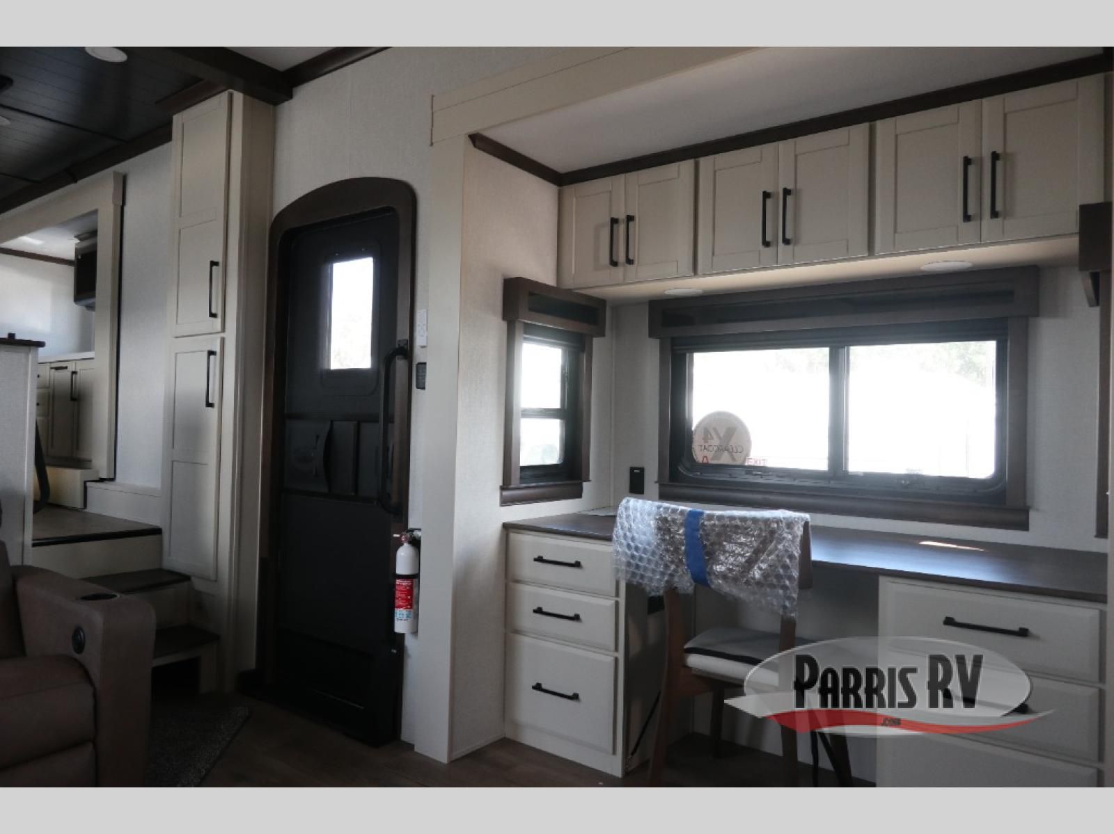 You will feel right at home in this fifth wheel! The rear private bedroom has a 72" x 80" king bed slide for a good night's rest, a rear large wardrobe with the washer and dryer next to it, and even a dresser with a 40" LED TV. And two can get ready at once in the full bathroom with the dual sink vanity. You can then head to either the desk slide to get some work done or whip up some scrambled eggs on the three burner cooktop at the island in the front kitchen. The kitchen even has a dishwasher for easy clean up and two bar stools at the high top dinette that overlooks the middle living area. Relax each night in true comfort on either the E-Z Glide sofa bed slide or the theater seating across from the entertainment center which has a fireplace and 65" Samsung LED Smart TV to watch your favorite movies!