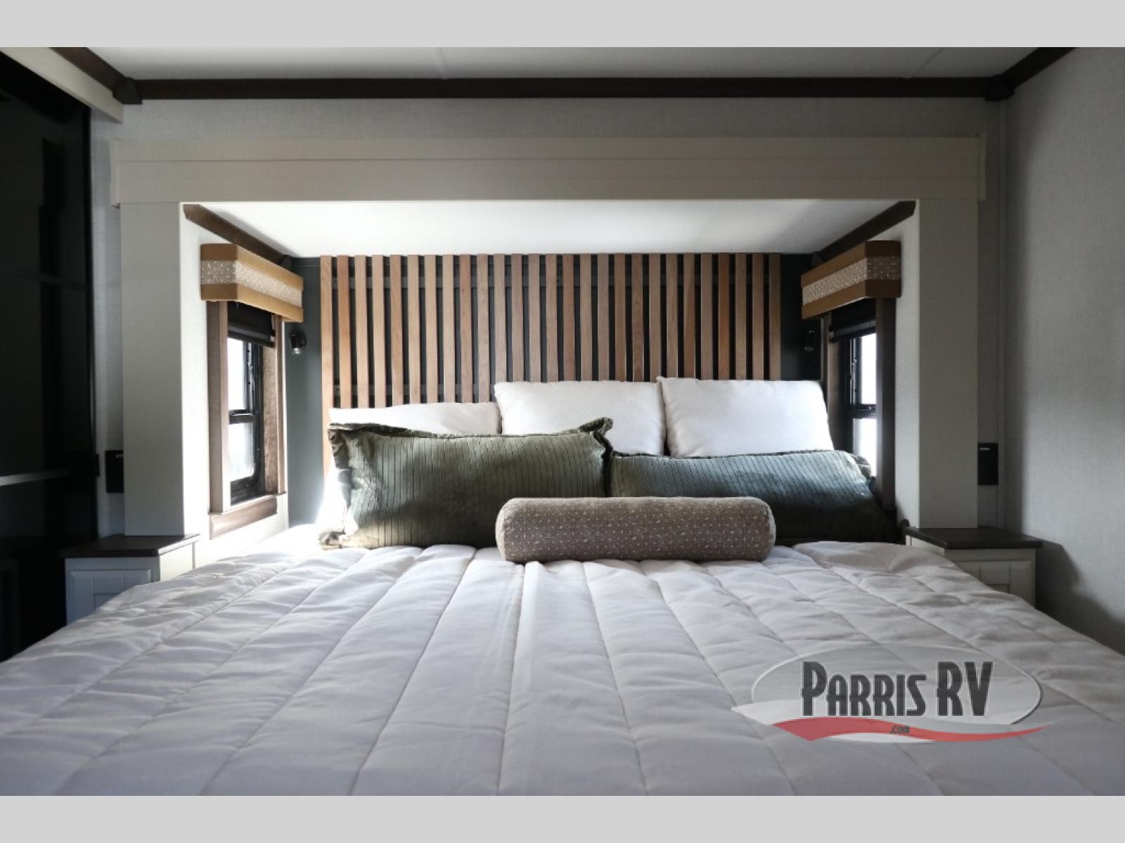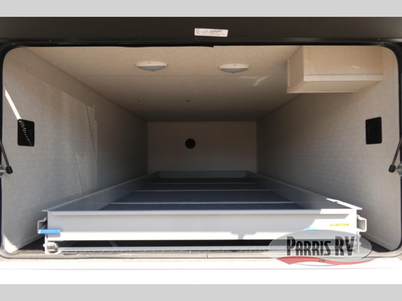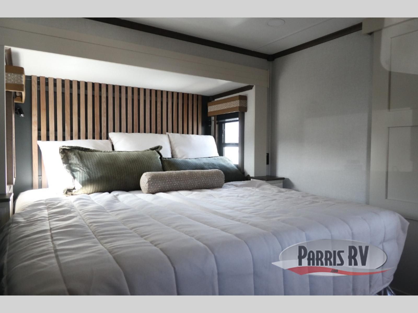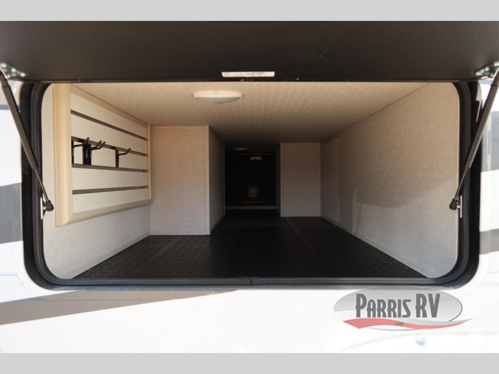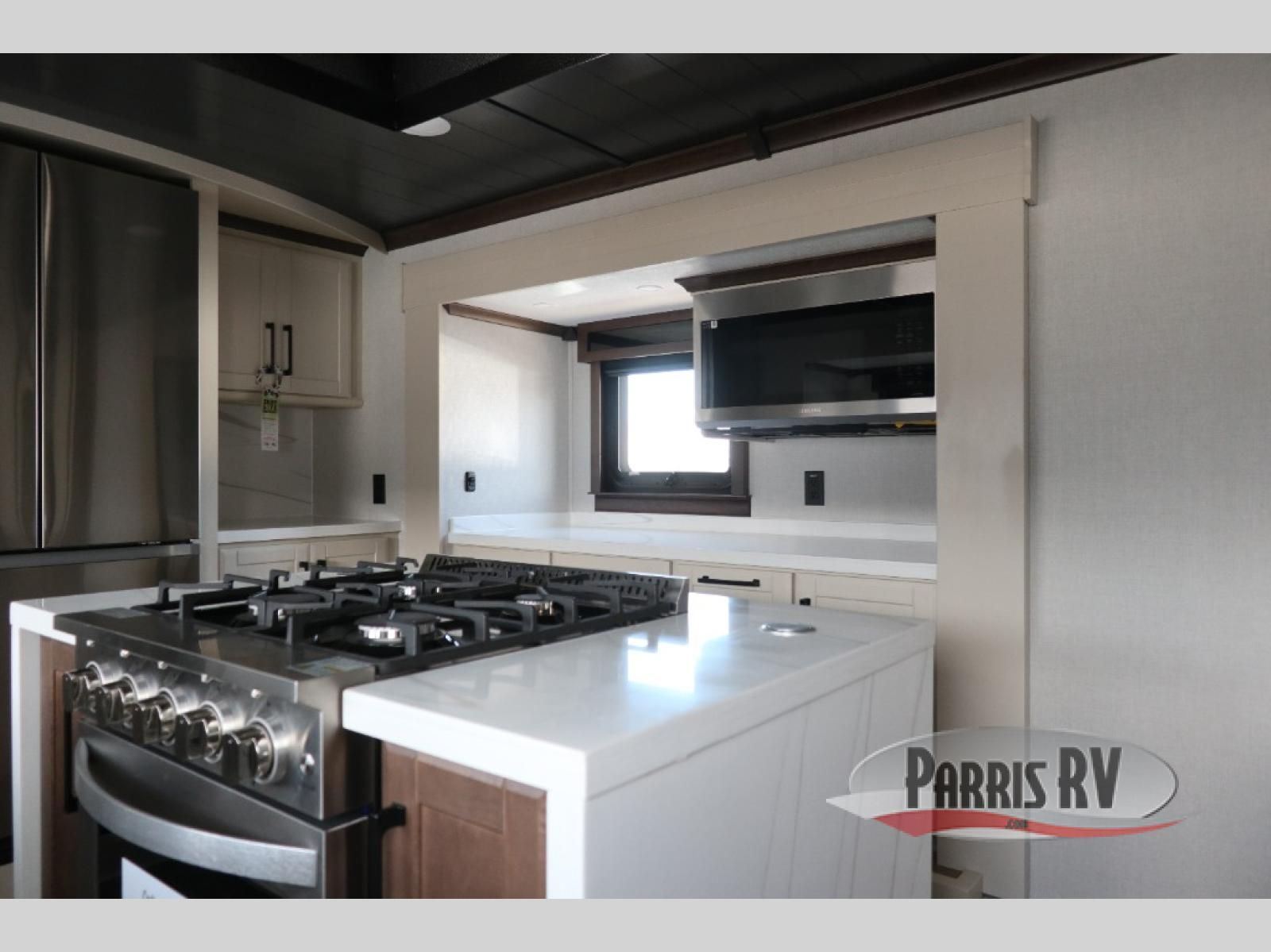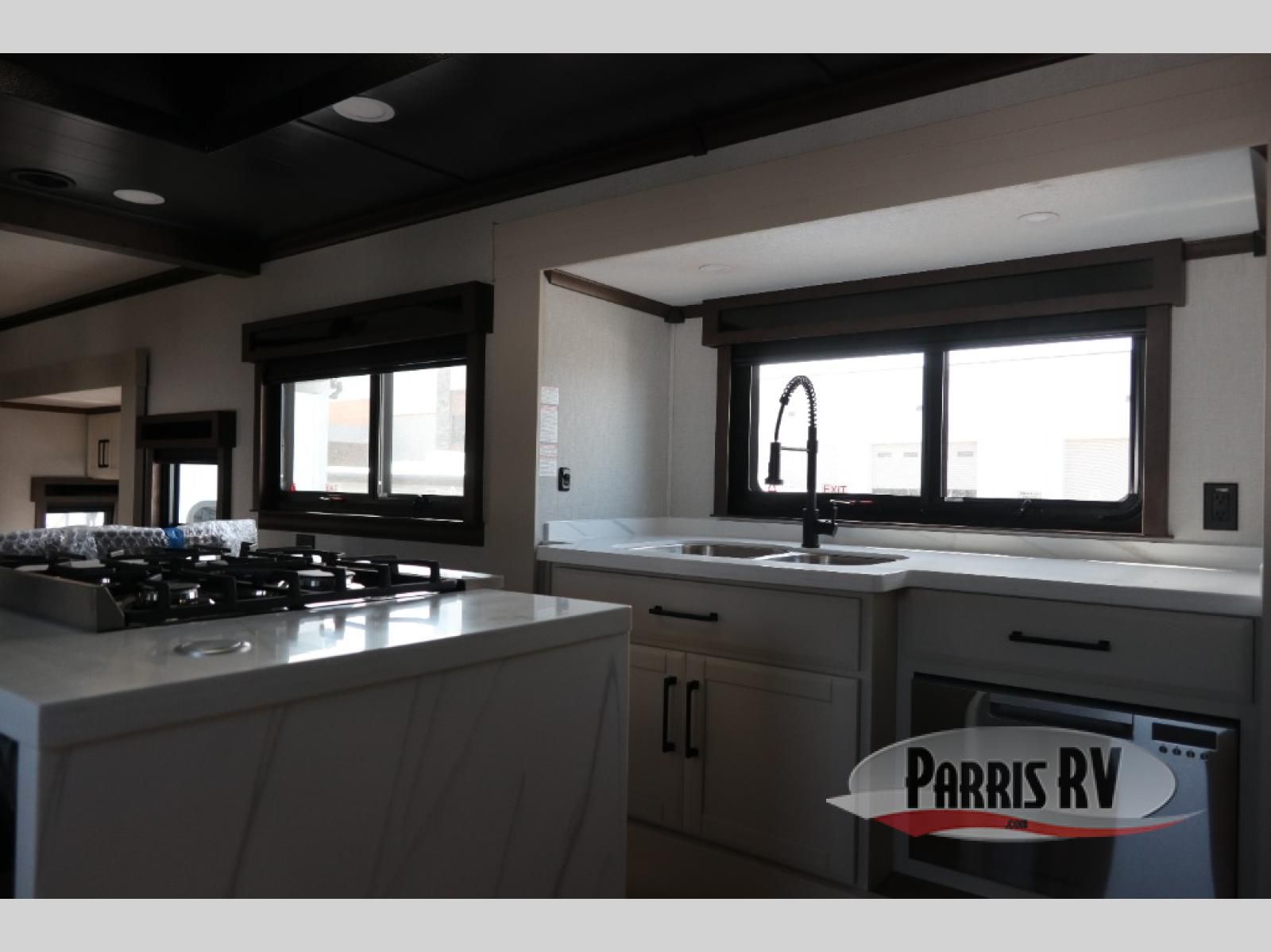 You will feel right at home in this fifth wheel! The rear private bedroom has a 72" x 80" king bed slide for a good night's rest, a rear large wardrobe with the washer and dryer next to it, and even a dresser with a 40" LED TV. And two can get ready at once in the full bathroom with the dual sink vanity. You can then head to either the desk slide to get some work done or whip up some scrambled eggs on the three burner cooktop at the island in the front kitchen. The kitchen even has a dishwasher for easy clean up and two bar stools at the high top dinette that overlooks the middle living area. Relax each night in true comfort on either the E-Z Glide sofa bed slide or the theater seating across from the entertainment center which has a fireplace and 65" Samsung LED Smart TV to watch your favorite movies!