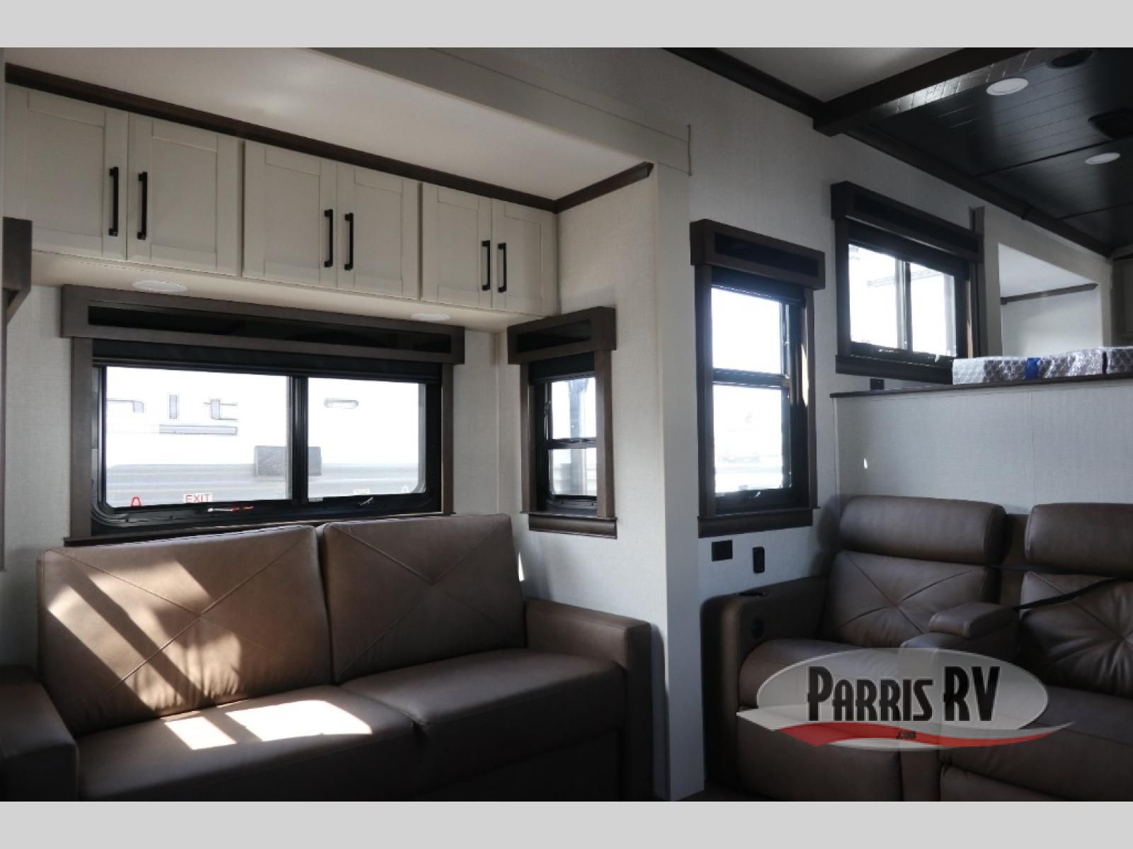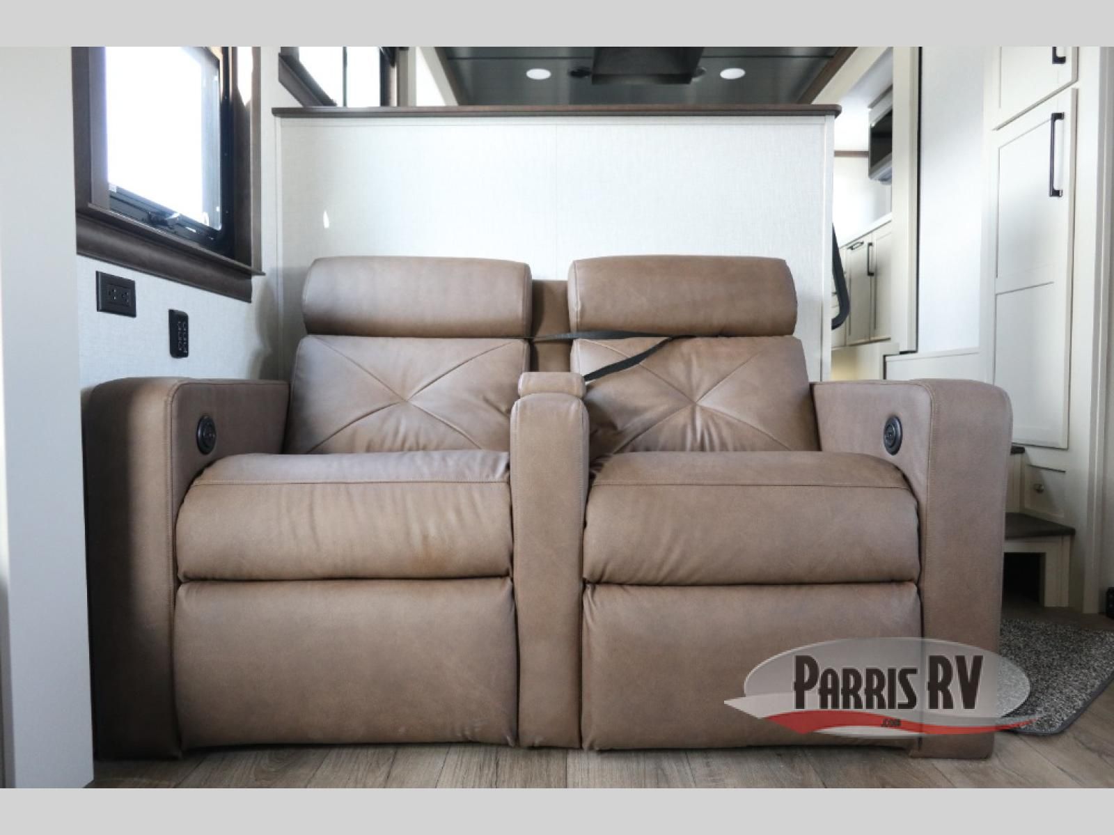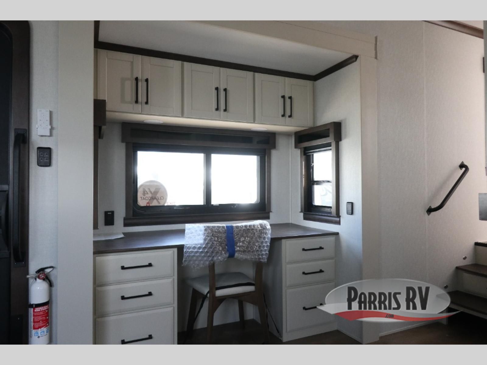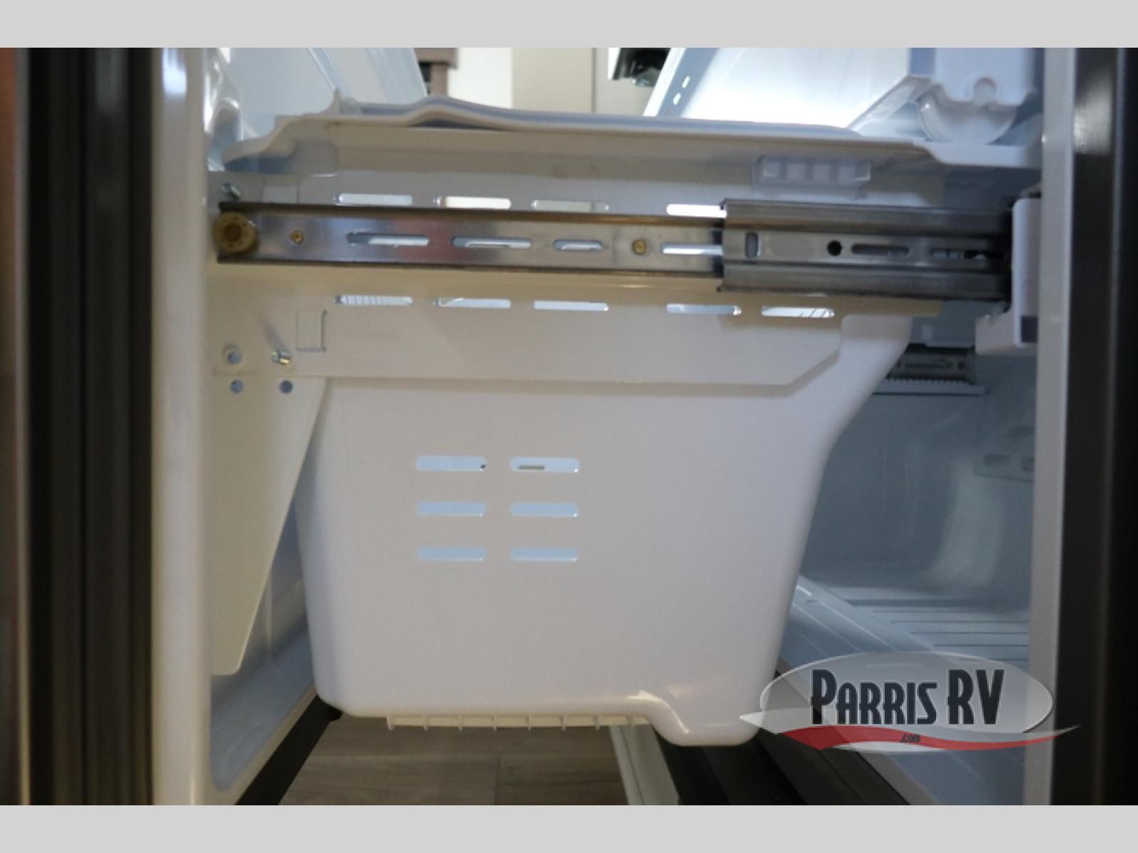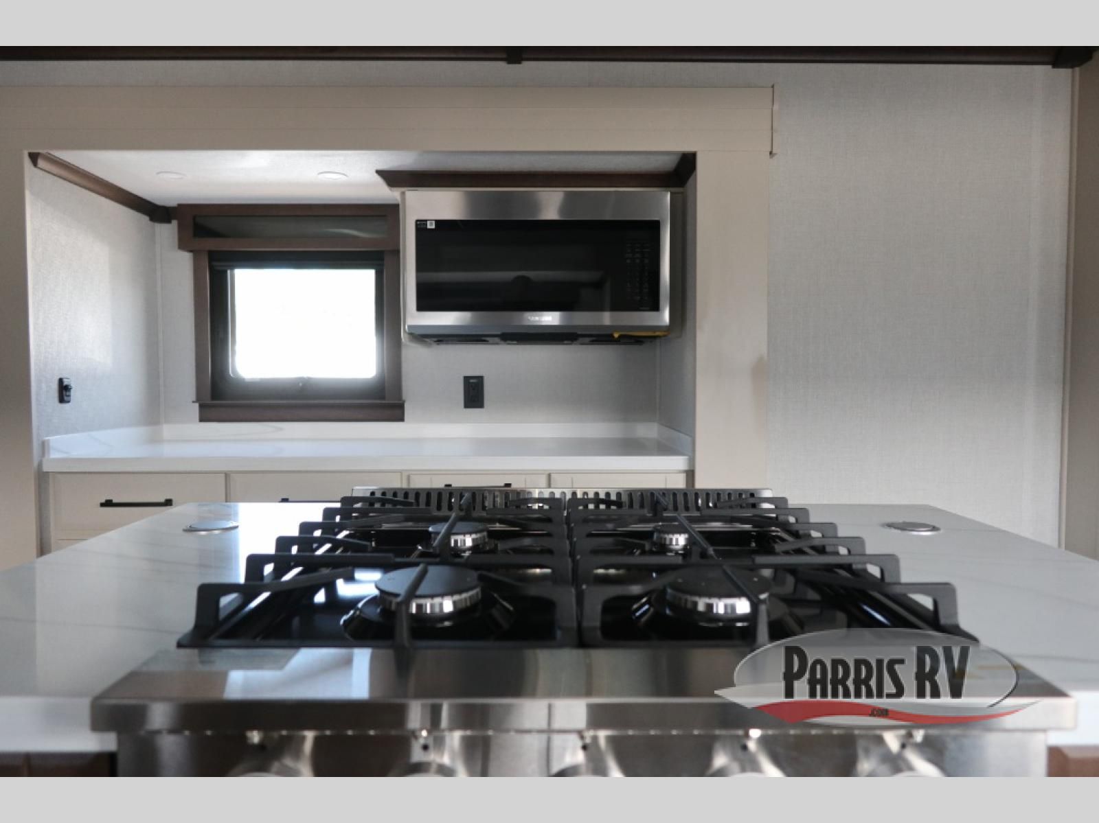 You will feel right at home in this fifth wheel! The rear private bedroom has a 72" x 80" king bed slide for a good night's rest, a rear large wardrobe with the washer and dryer next to it, and even a dresser with a 40" LED TV. And two can get ready at once in the full bathroom with the dual sink vanity. You can then head to either the desk slide to get some work done or whip up some scrambled eggs on the three burner cooktop at the island in the front kitchen. The kitchen even has a dishwasher for easy clean up and two bar stools at the high top dinette that overlooks the middle living area. Relax each night in true comfort on either the E-Z Glide sofa bed slide or the theater seating across from the entertainment center which has a fireplace and 65" Samsung LED Smart TV to watch your favorite movies!