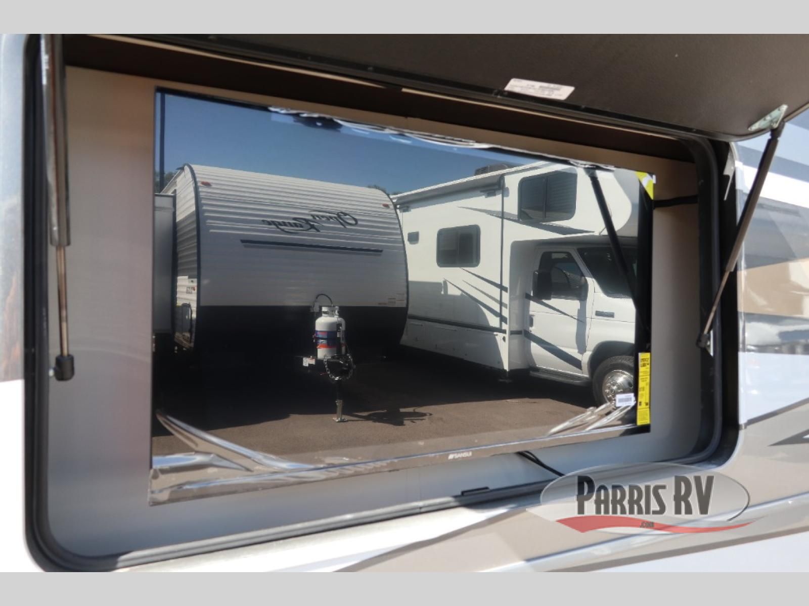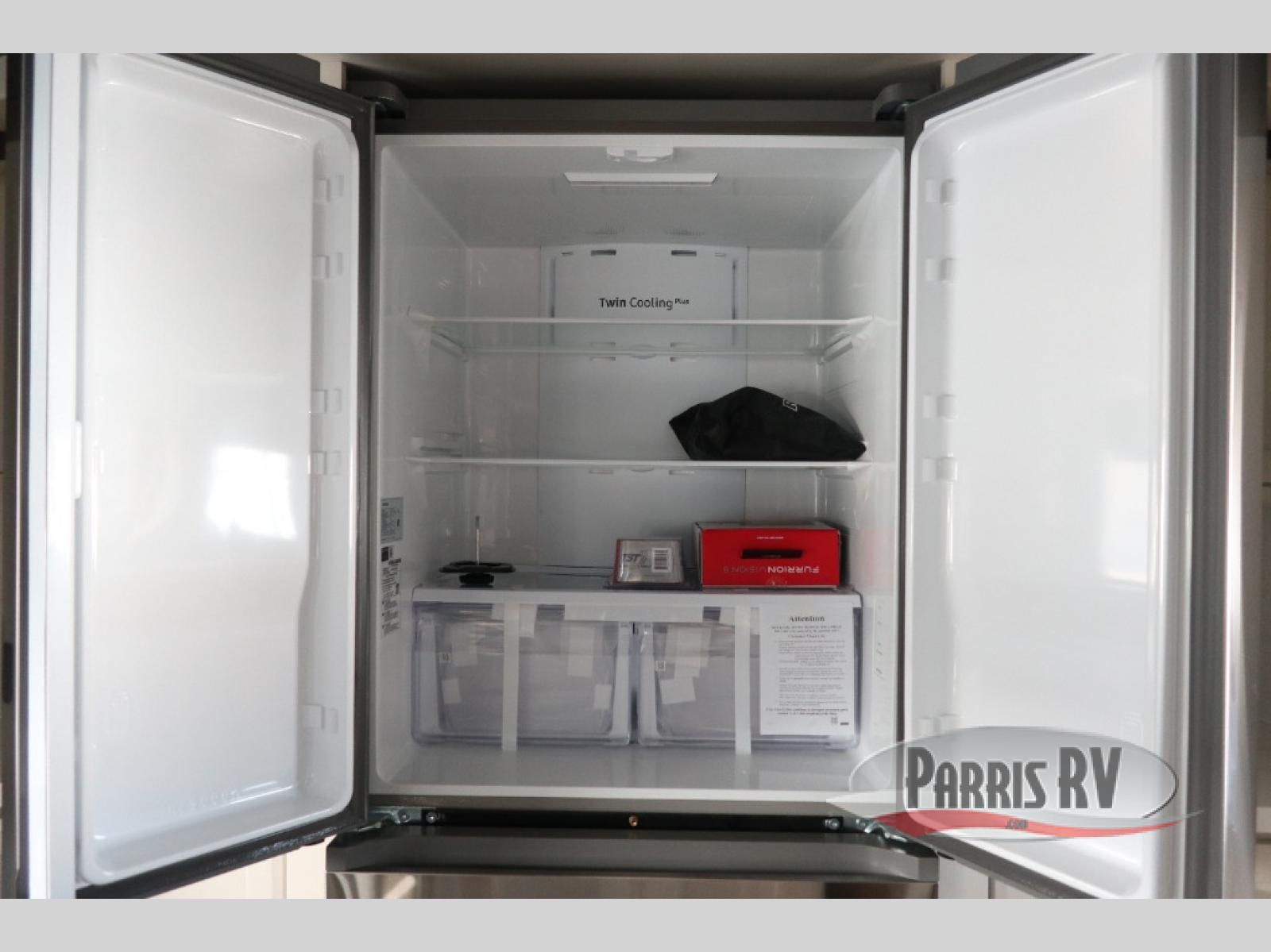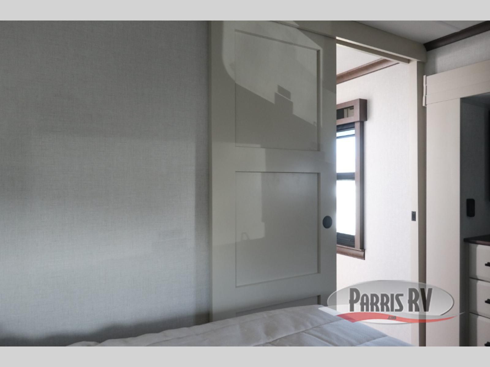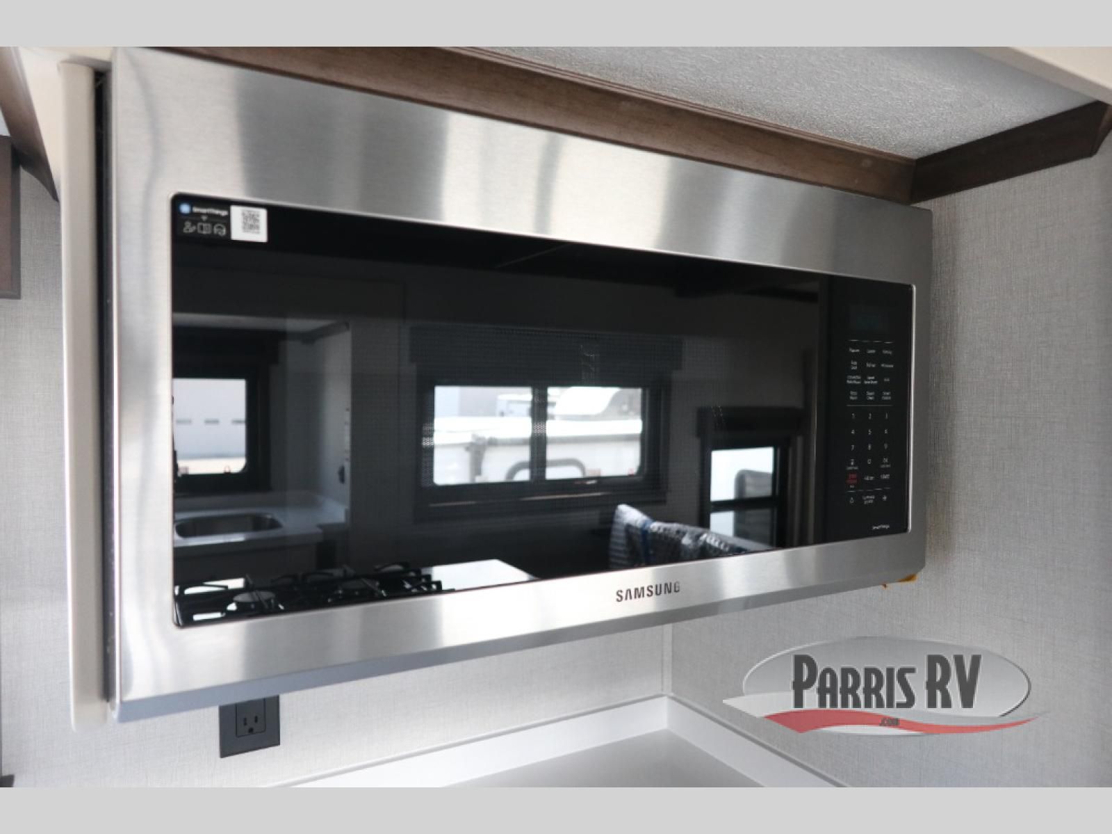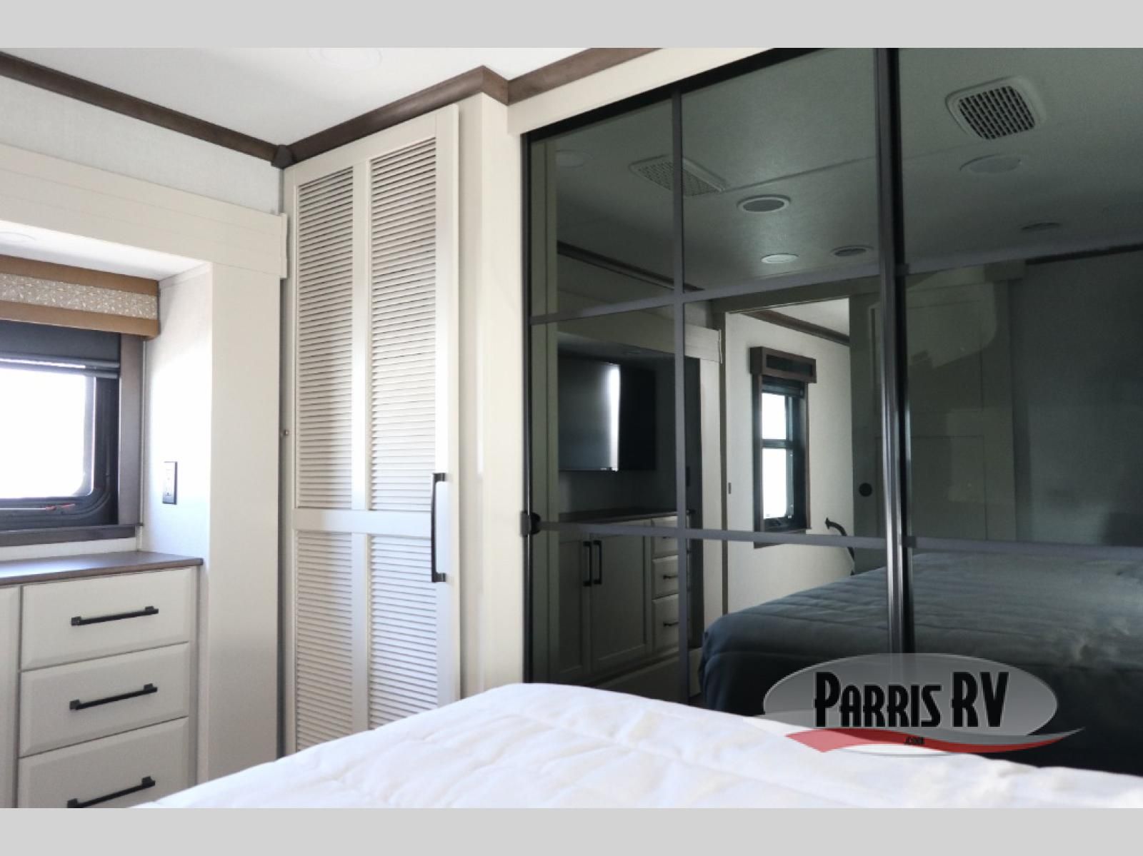 You will feel right at home in this fifth wheel! The rear private bedroom has a 72" x 80" king bed slide for a good night's rest, a rear large wardrobe with the washer and dryer next to it, and even a dresser with a 40" LED TV. And two can get ready at once in the full bathroom with the dual sink vanity. You can then head to either the desk slide to get some work done or whip up some scrambled eggs on the three burner cooktop at the island in the front kitchen. The kitchen even has a dishwasher for easy clean up and two bar stools at the high top dinette that overlooks the middle living area. Relax each night in true comfort on either the E-Z Glide sofa bed slide or the theater seating across from the entertainment center which has a fireplace and 65" Samsung LED Smart TV to watch your favorite movies!