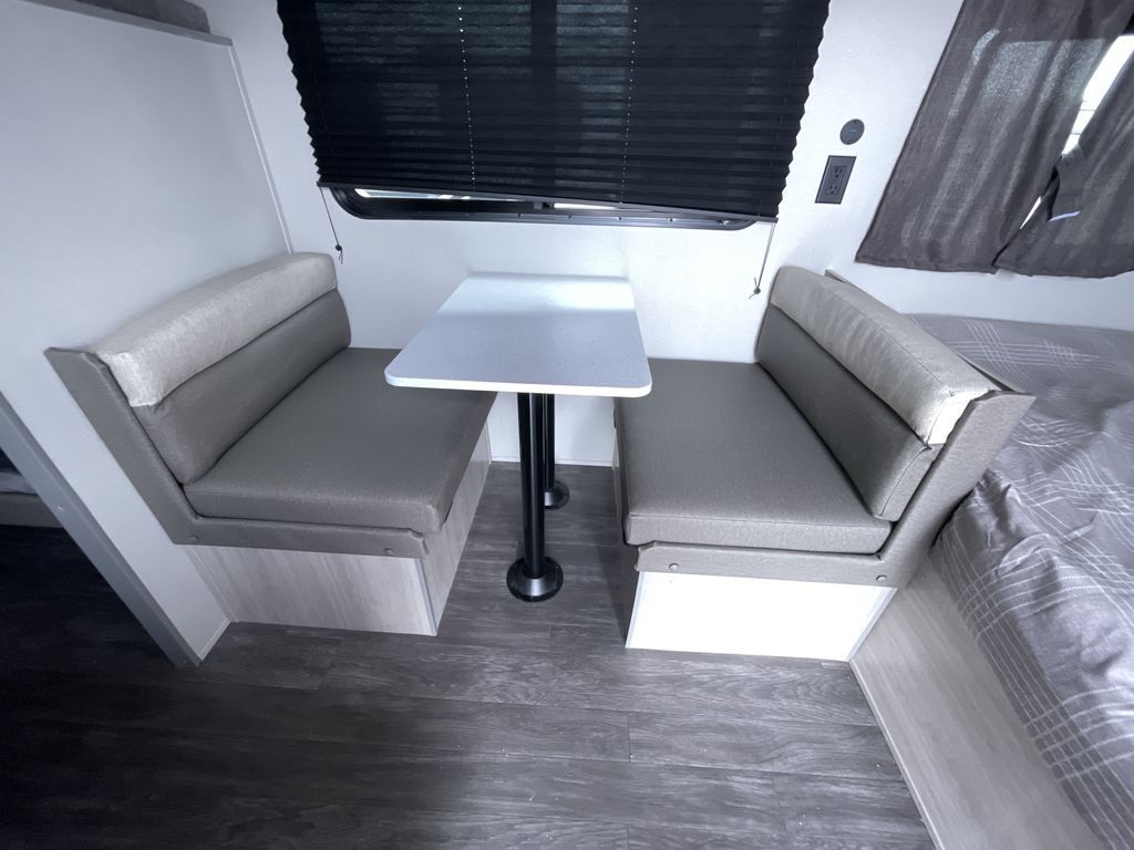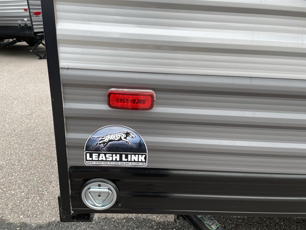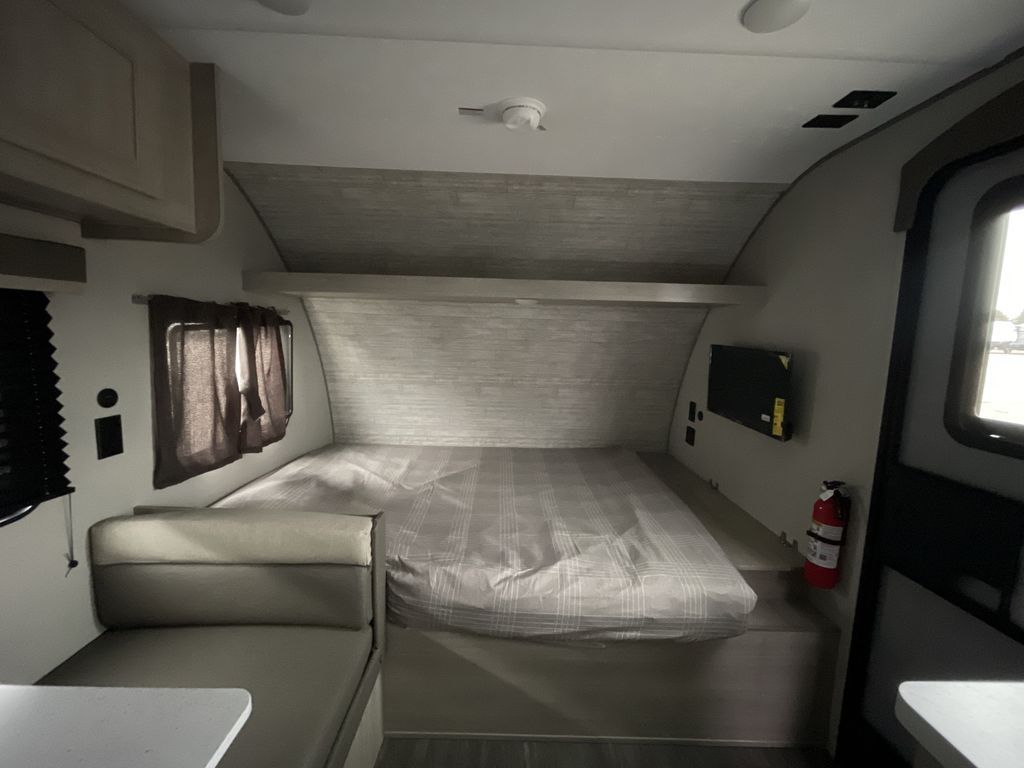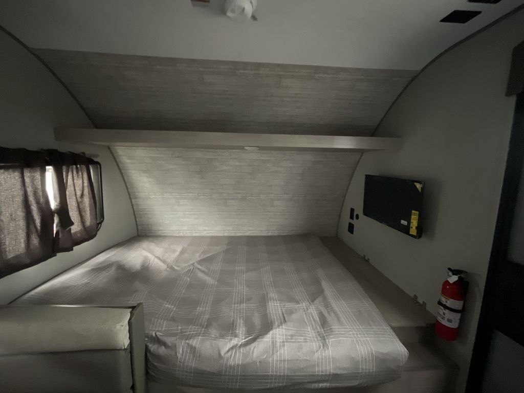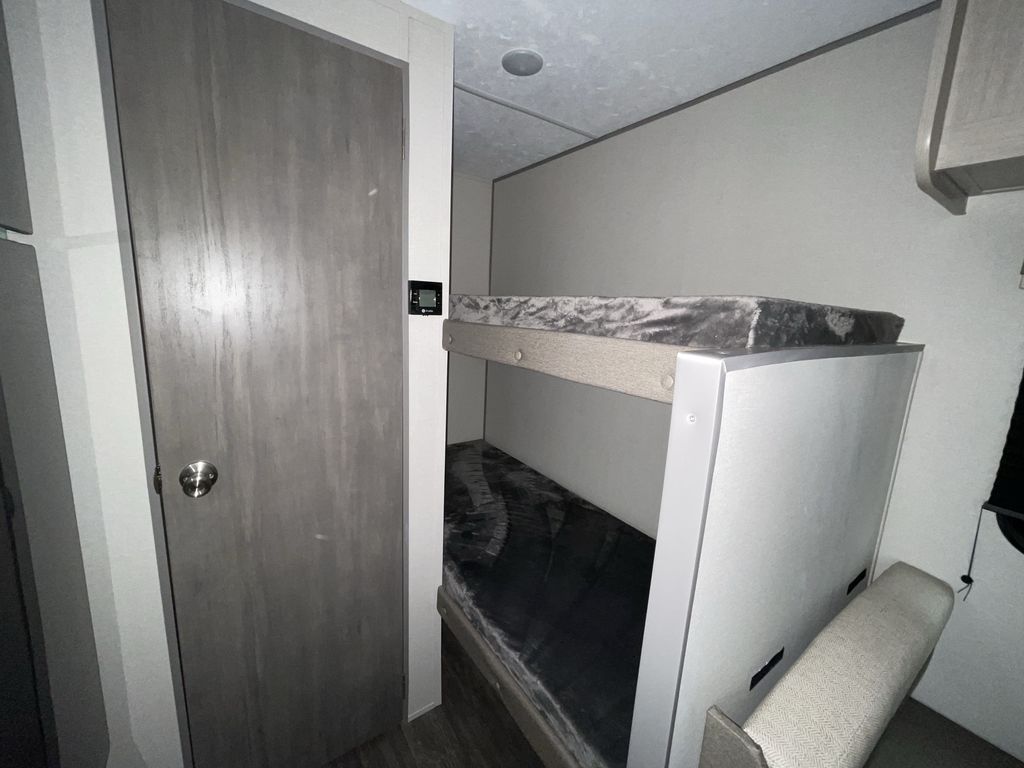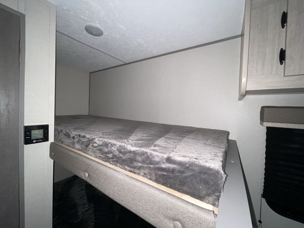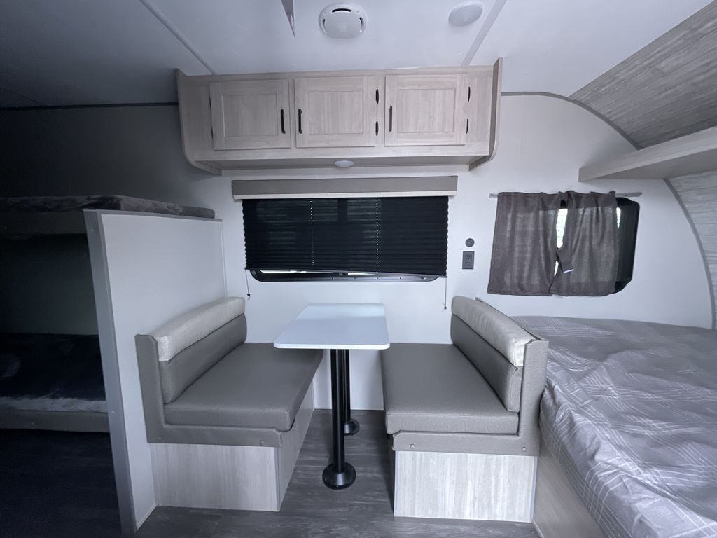 This cozy travel trailer can sleep five, so pack up and head out! You will have a queen bed up front to sleep on each night instead of an air mattress, and the little ones can take the 28" x 70" bunk beds! There is also a booth dinette here that can sleep an additional guest and is perfect for sharing meals during the day. The two burner cooktop and microwave oven means you won't have to cook over a campfire, and the private toilet and shower lets you clean up after a day outdoors. This model includes plenty of storage space, including bedroom storage, an exterior pass-through, plus additional outside storage beneath the bunks for hiking gear!