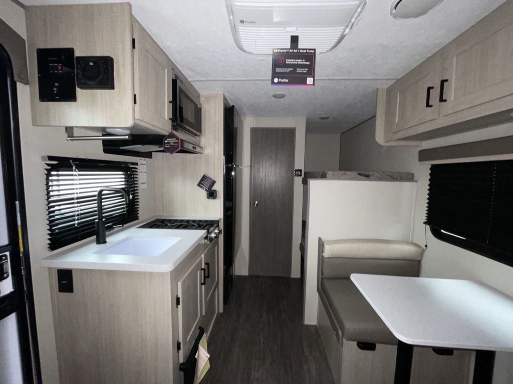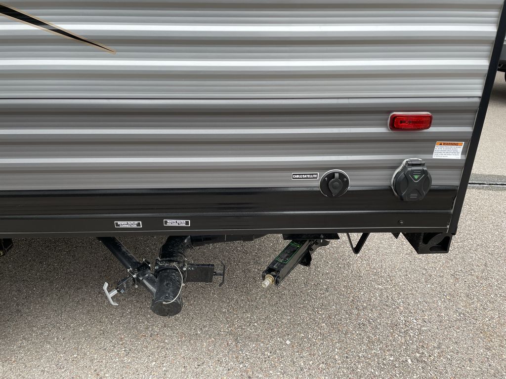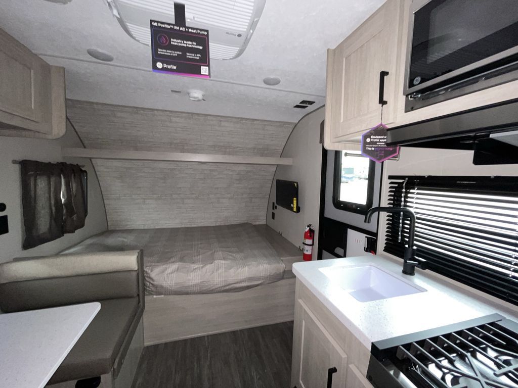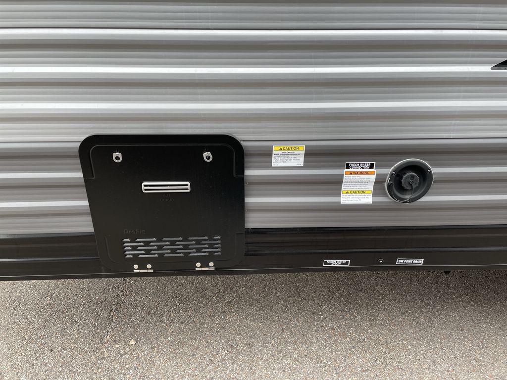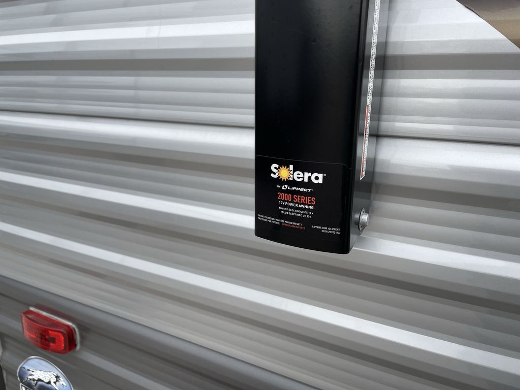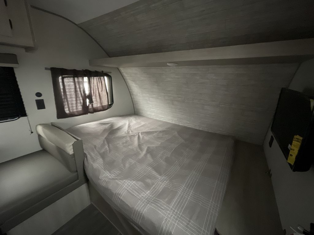 This cozy travel trailer can sleep five, so pack up and head out! You will have a queen bed up front to sleep on each night instead of an air mattress, and the little ones can take the 28" x 70" bunk beds! There is also a booth dinette here that can sleep an additional guest and is perfect for sharing meals during the day. The two burner cooktop and microwave oven means you won't have to cook over a campfire, and the private toilet and shower lets you clean up after a day outdoors. This model includes plenty of storage space, including bedroom storage, an exterior pass-through, plus additional outside storage beneath the bunks for hiking gear!