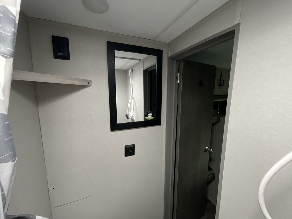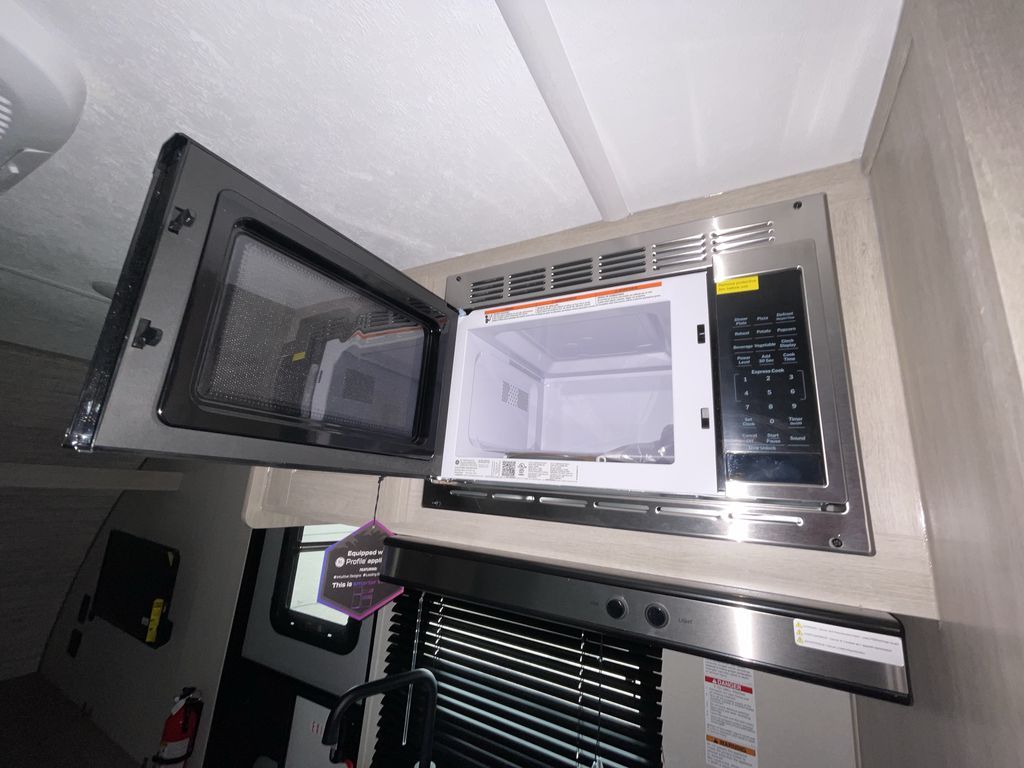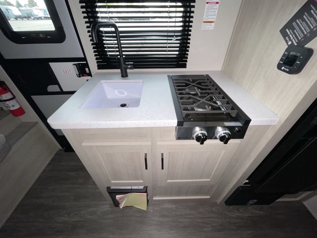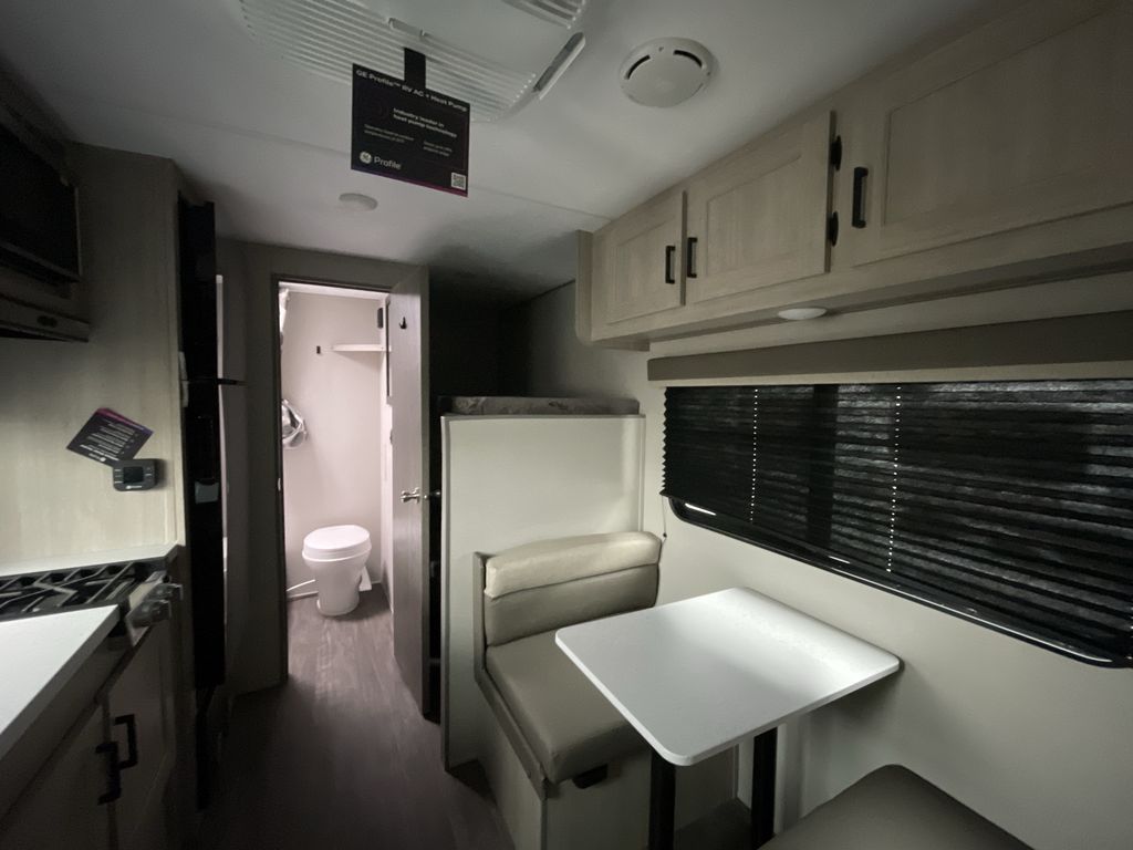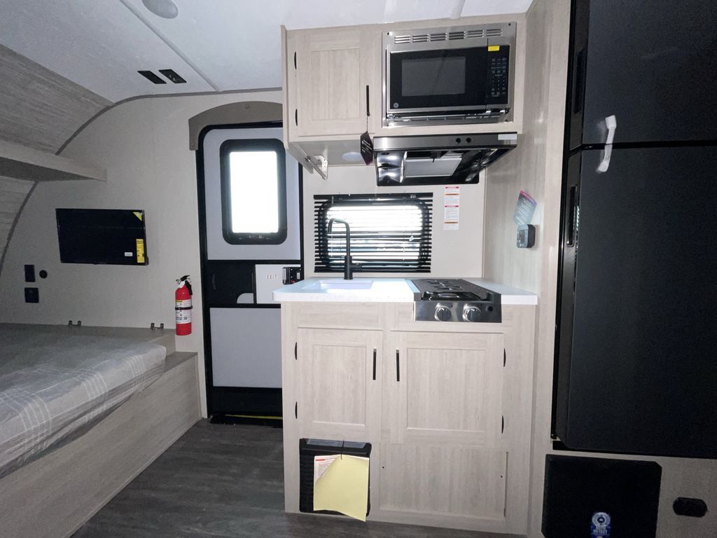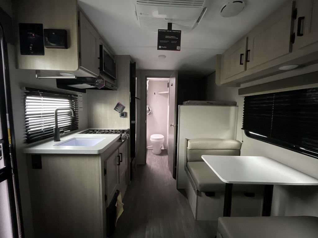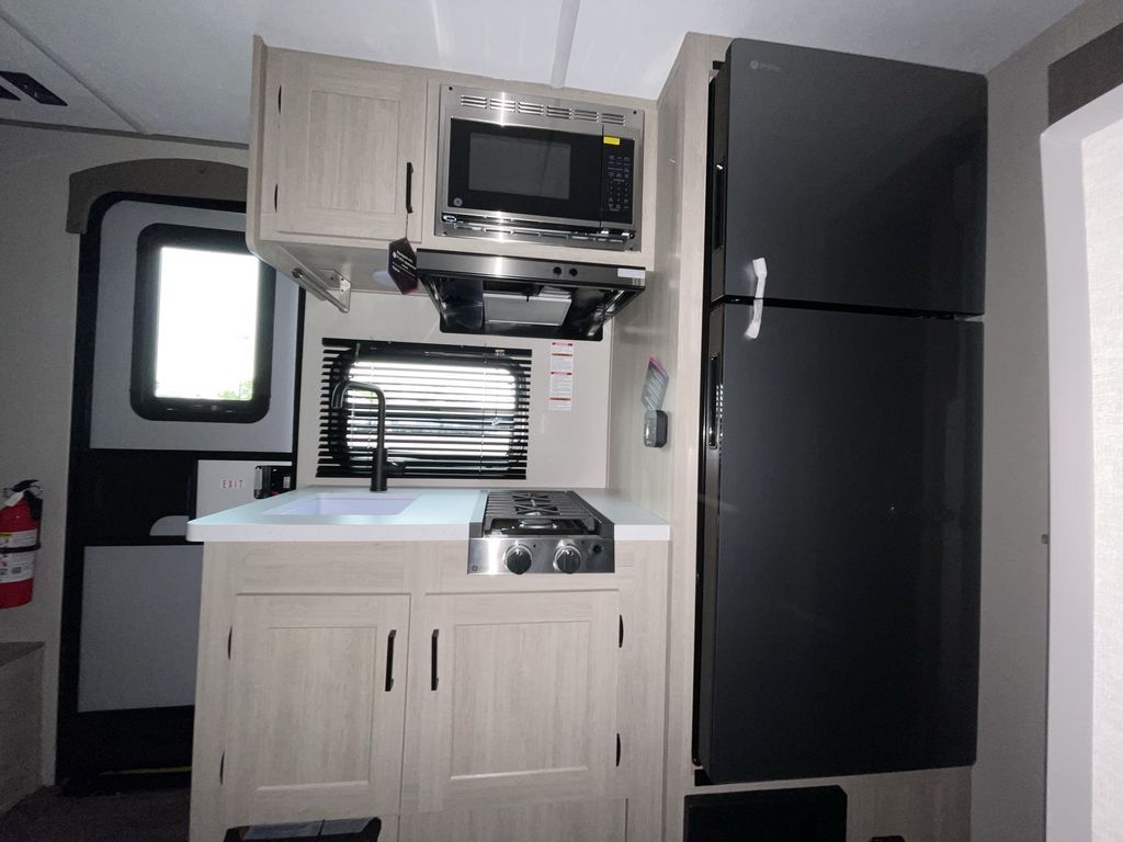 This cozy travel trailer can sleep five, so pack up and head out! You will have a queen bed up front to sleep on each night instead of an air mattress, and the little ones can take the 28" x 70" bunk beds! There is also a booth dinette here that can sleep an additional guest and is perfect for sharing meals during the day. The two burner cooktop and microwave oven means you won't have to cook over a campfire, and the private toilet and shower lets you clean up after a day outdoors. This model includes plenty of storage space, including bedroom storage, an exterior pass-through, plus additional outside storage beneath the bunks for hiking gear!