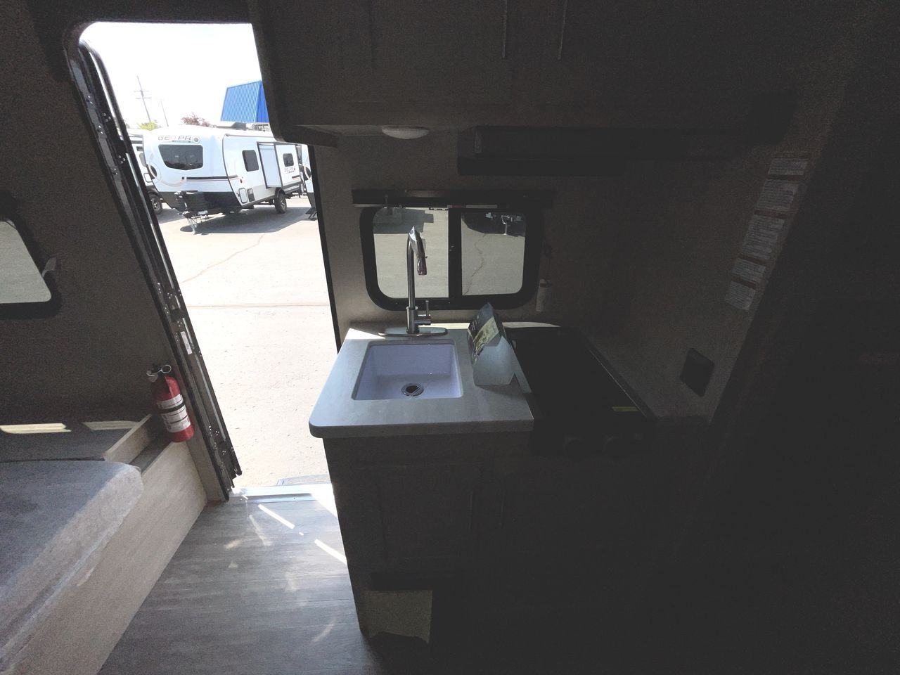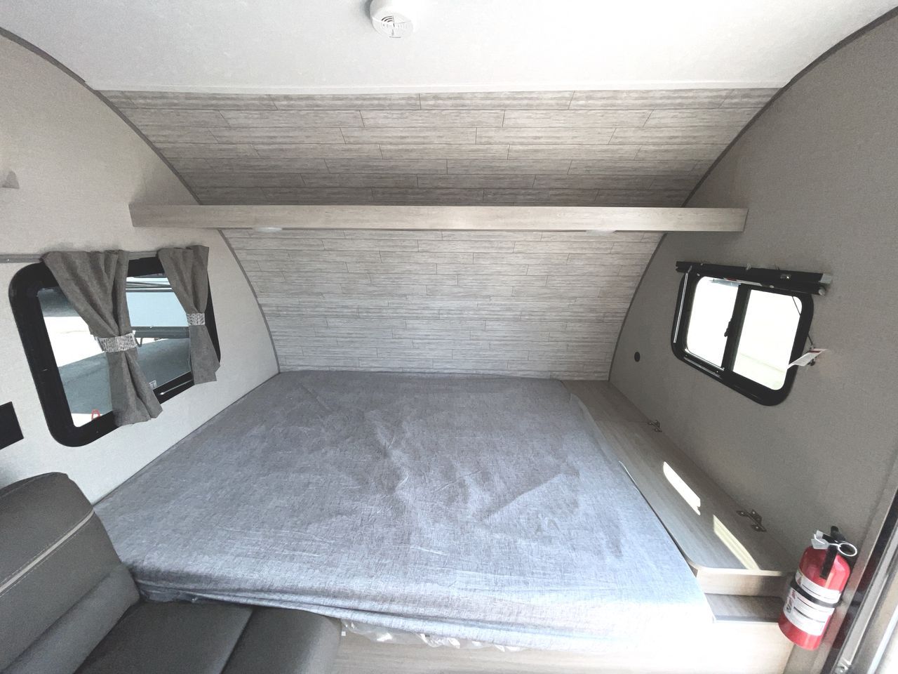 This cozy travel trailer can sleep five, so pack up and head out! You will have a queen bed up front to sleep on each night instead of an air mattress, and the little ones can take the 28" x 70" bunk beds! There is also a booth dinette here that can sleep an additional guest and is perfect for sharing meals during the day. The two burner cooktop and microwave oven means you won't have to cook over a campfire, and the private toilet and shower lets you clean up after a day outdoors. This model includes plenty of storage space, including bedroom storage, an exterior pass-through, plus additional outside storage beneath the bunks for hiking gear!
