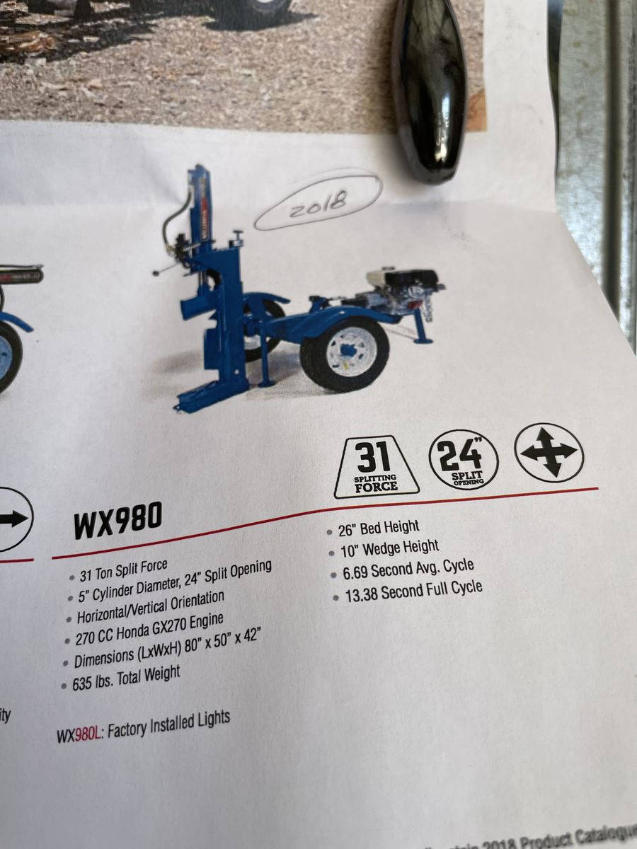 31 ton Wallenstein log splitter, made in Canada. 2018 year model, 9 hp Honda motor. Operates excellent.