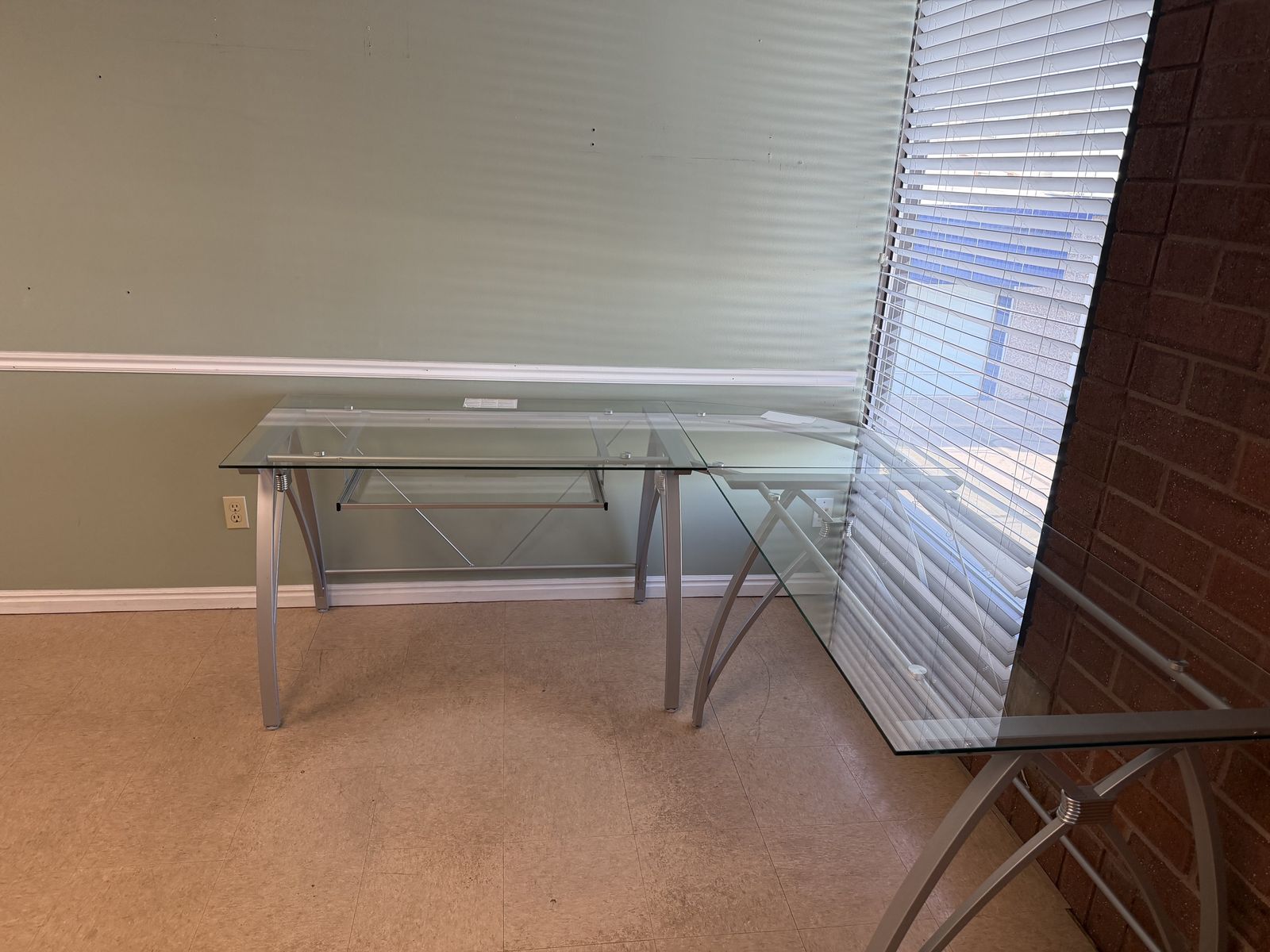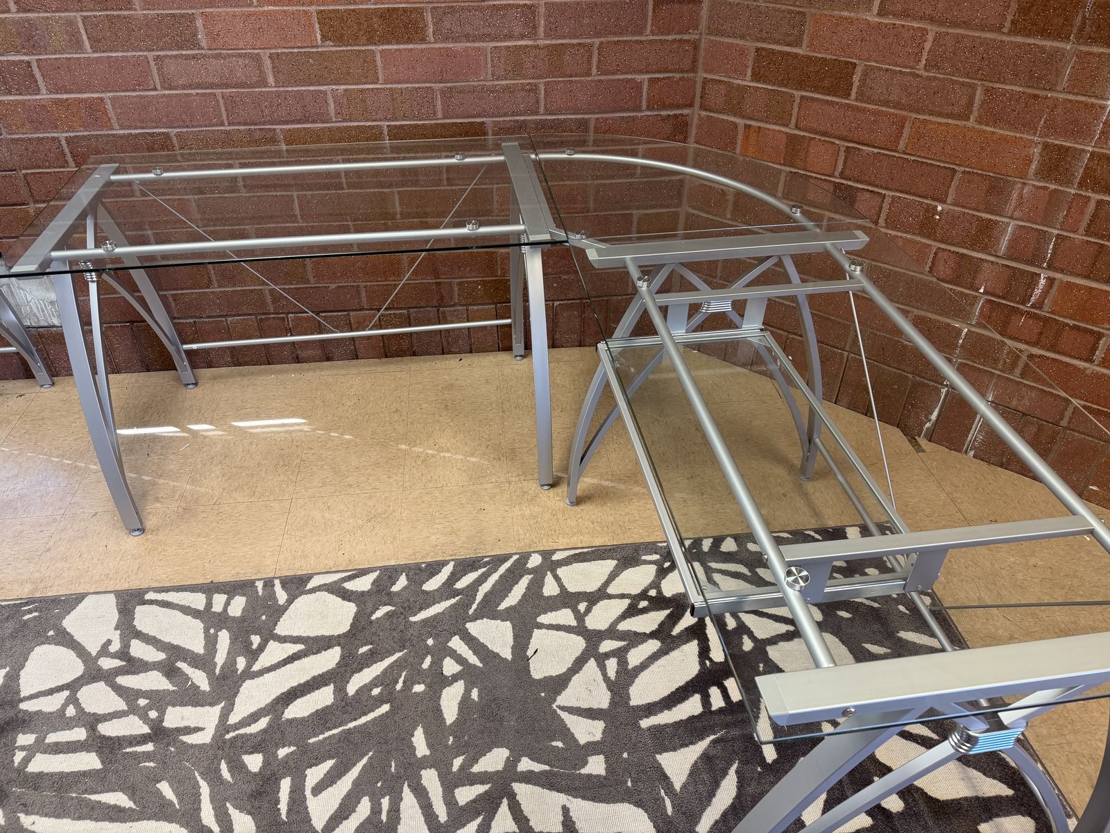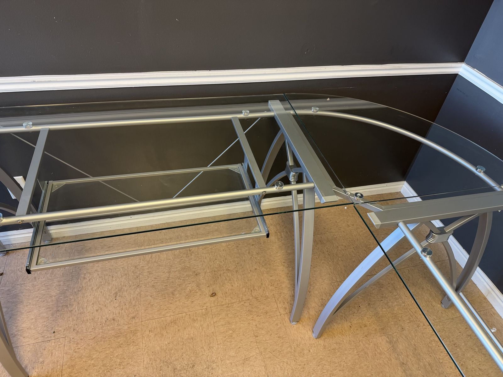 Details: • 76” L-shape corner desk • Tempered glass surfaces • Silver metal frame • Pull-out keyboard tray • Excellent condition