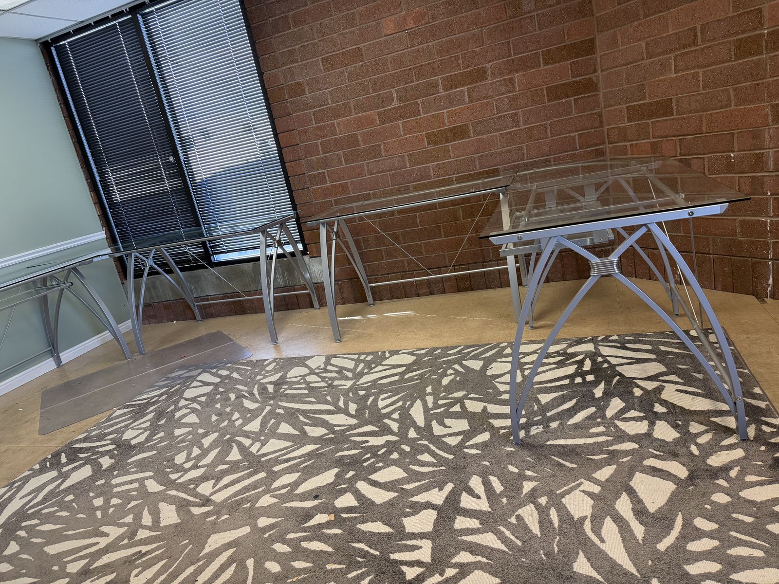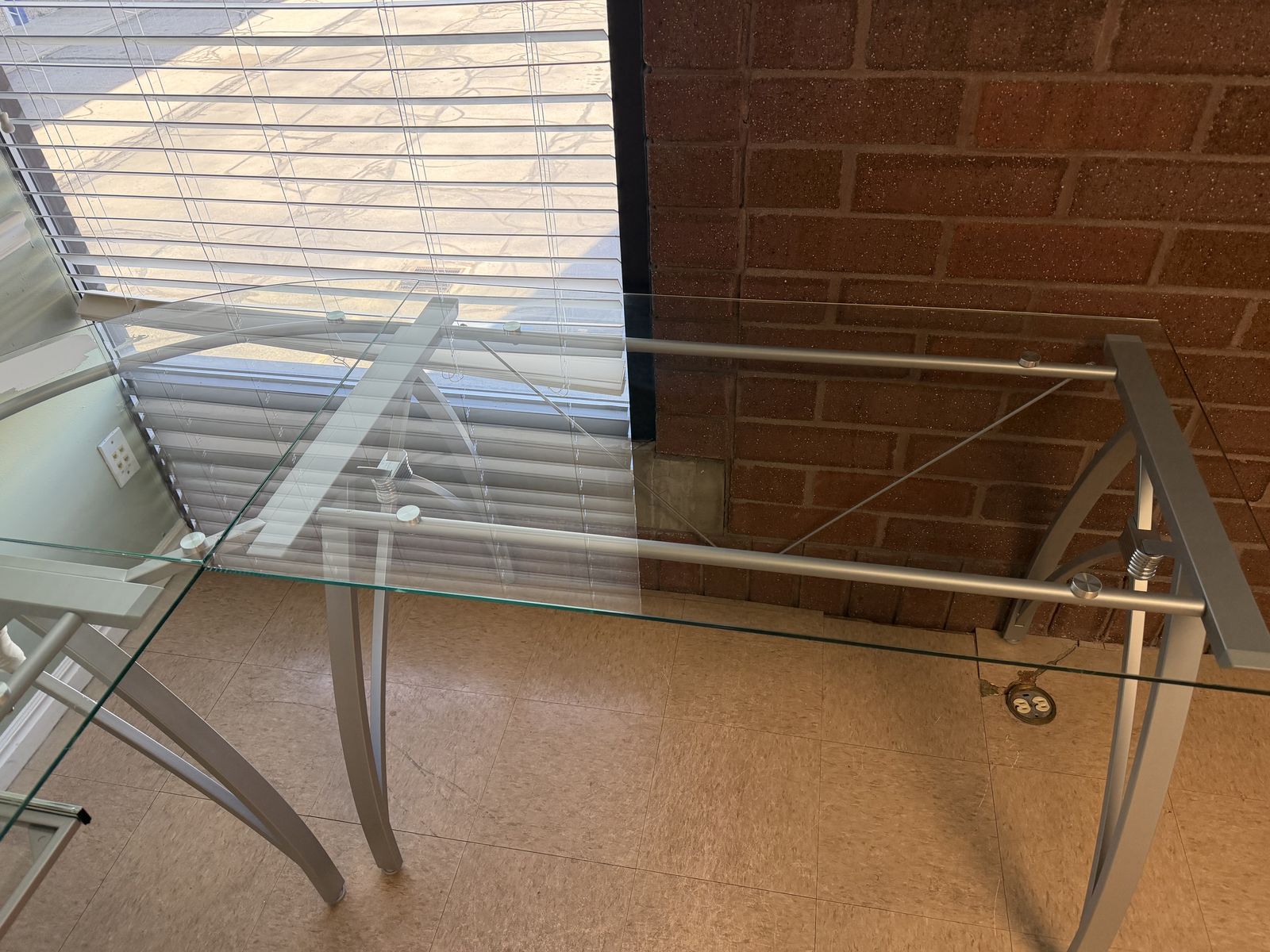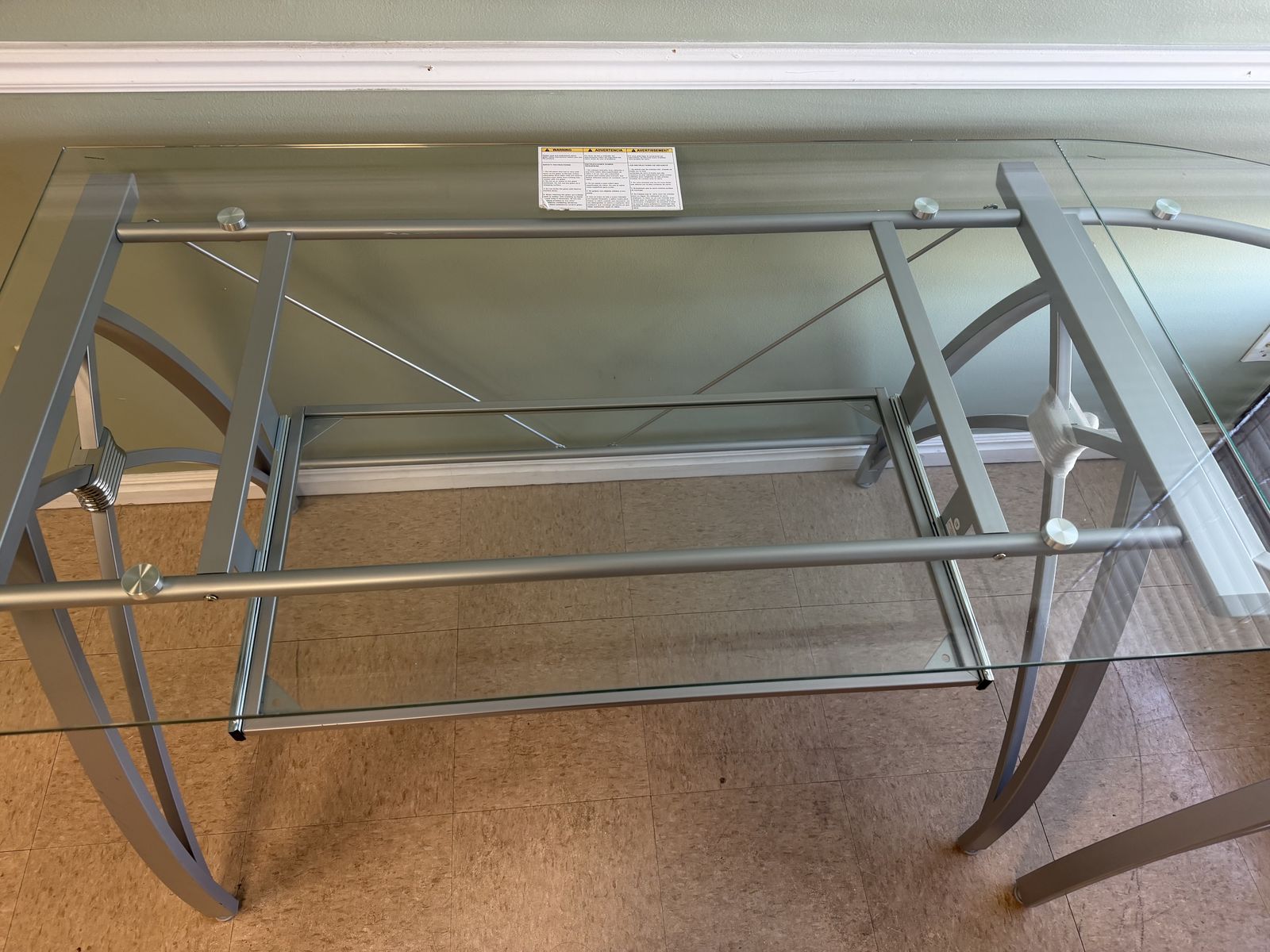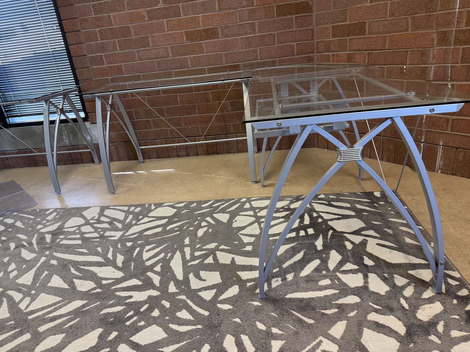 Details: • 76” L-shape corner desk • Tempered glass surfaces • Silver metal frame • Pull-out keyboard tray • Excellent condition
