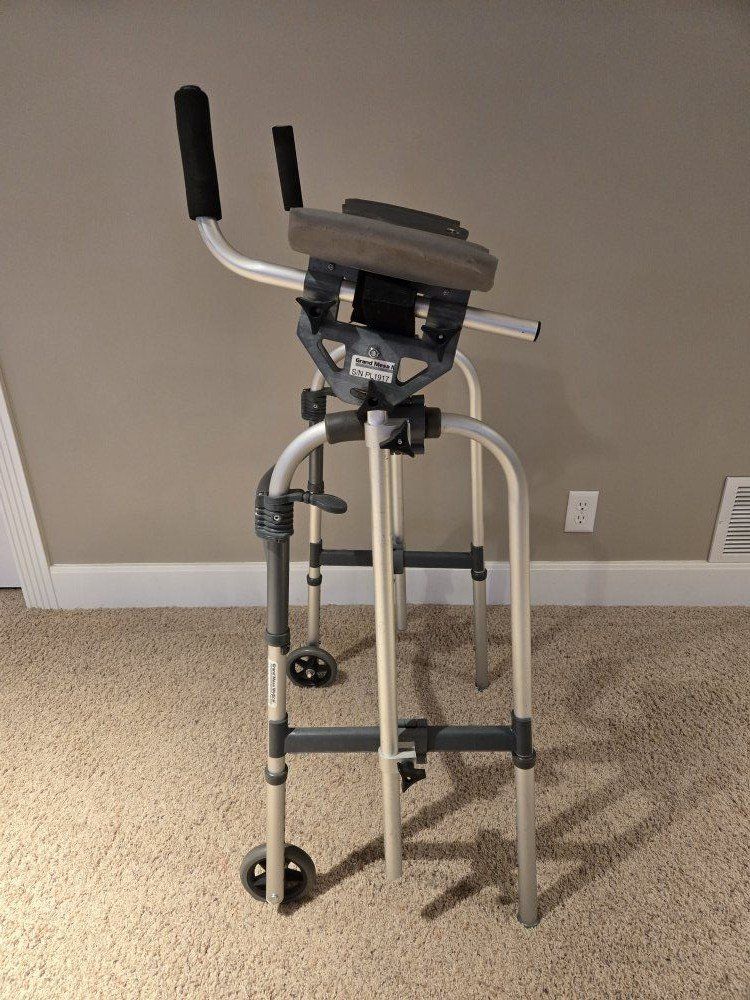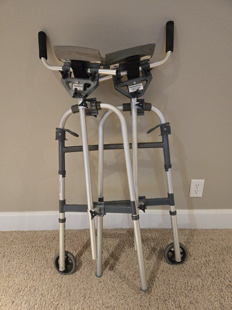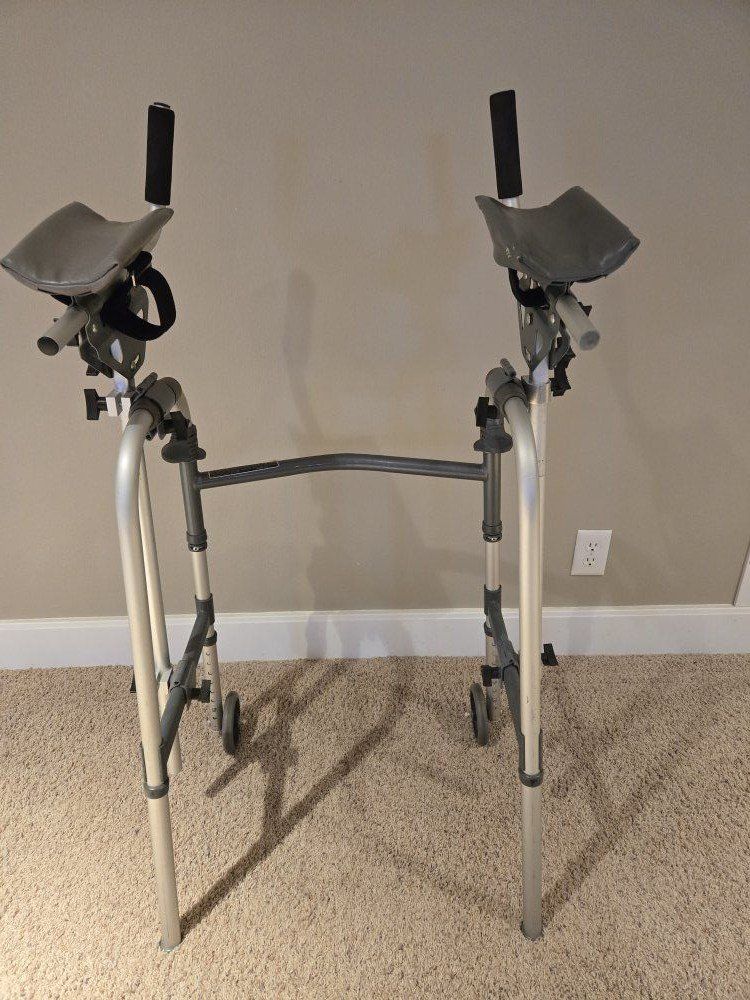 Aluminum walker with arm rests. Armrests are so you can use your arms more for support and reduce weight on legs. Armrests are removable.