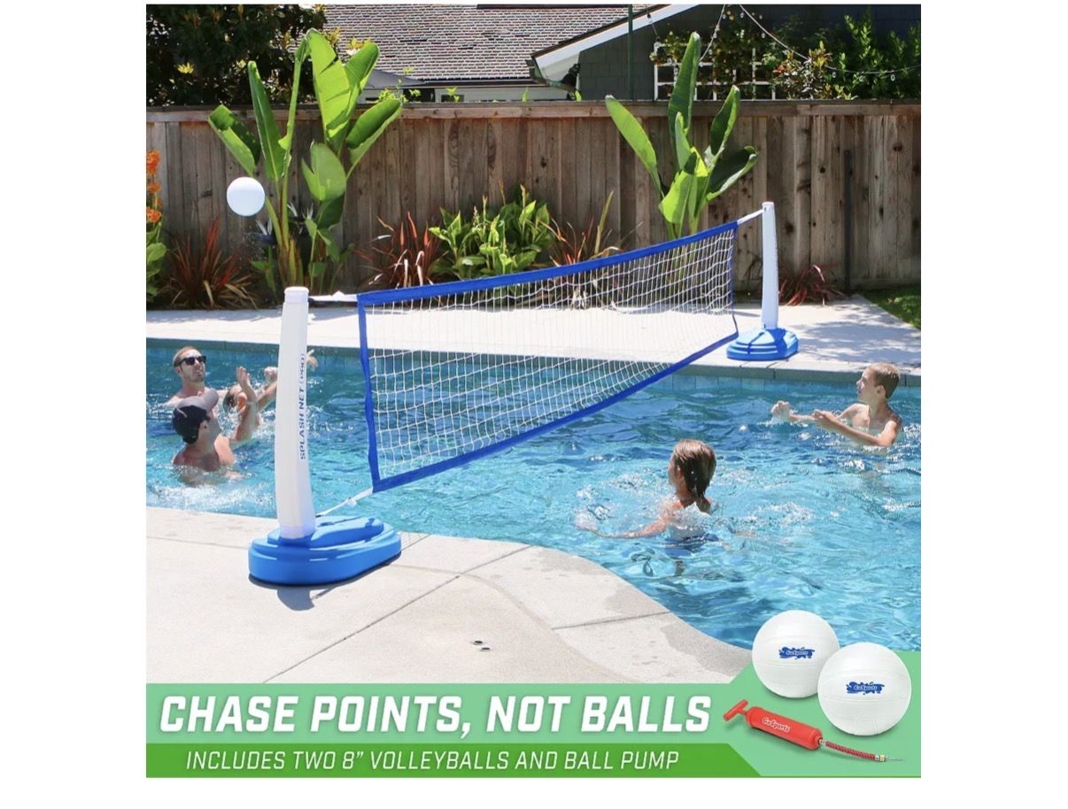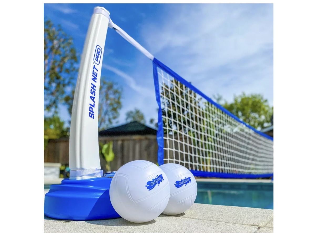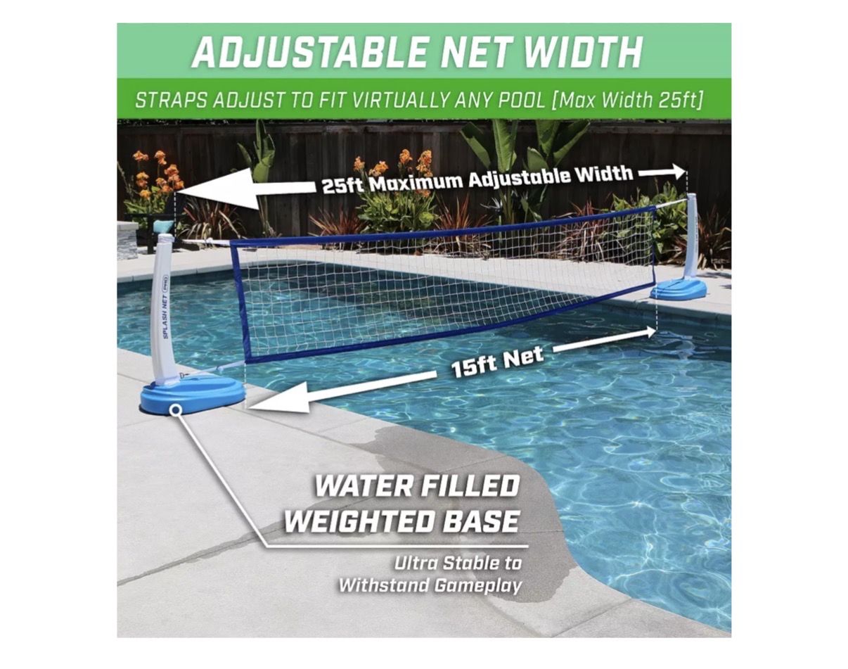Transform your pool into a volleyball court for some splash-tastic fun with the GoSports® Splash Net PRO Pool Volleyball Net Set! The adjustable net can be used with virtually any in-ground pool up to 25' wide. Water-weighted bases keep the net upright and prevent tipping. Includes net, 2 posts, 2 volleyballs, and pump. Imported. Set up your own water volleyball court Adjustable net accommodates in-ground pools up to 25' Water-weighted bases keep the net upright Net, 2 posts, 2 volleyballs, and pump included.