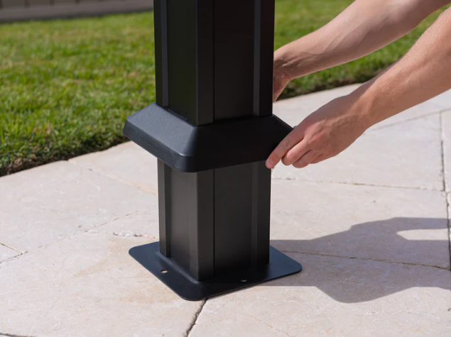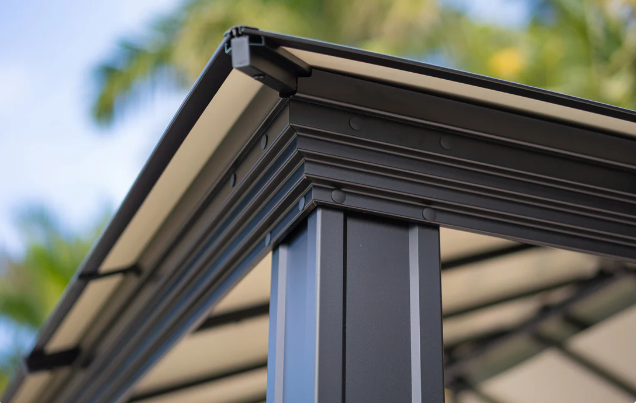 The decorative square posts and sturdy frame are constructed of heavy-gauge aluminum with a powder-coated black finish to ensure years of worry-free use. The solid roof panels are made of a multi-layered aluminum composite for maximum durability and protection from the sun.