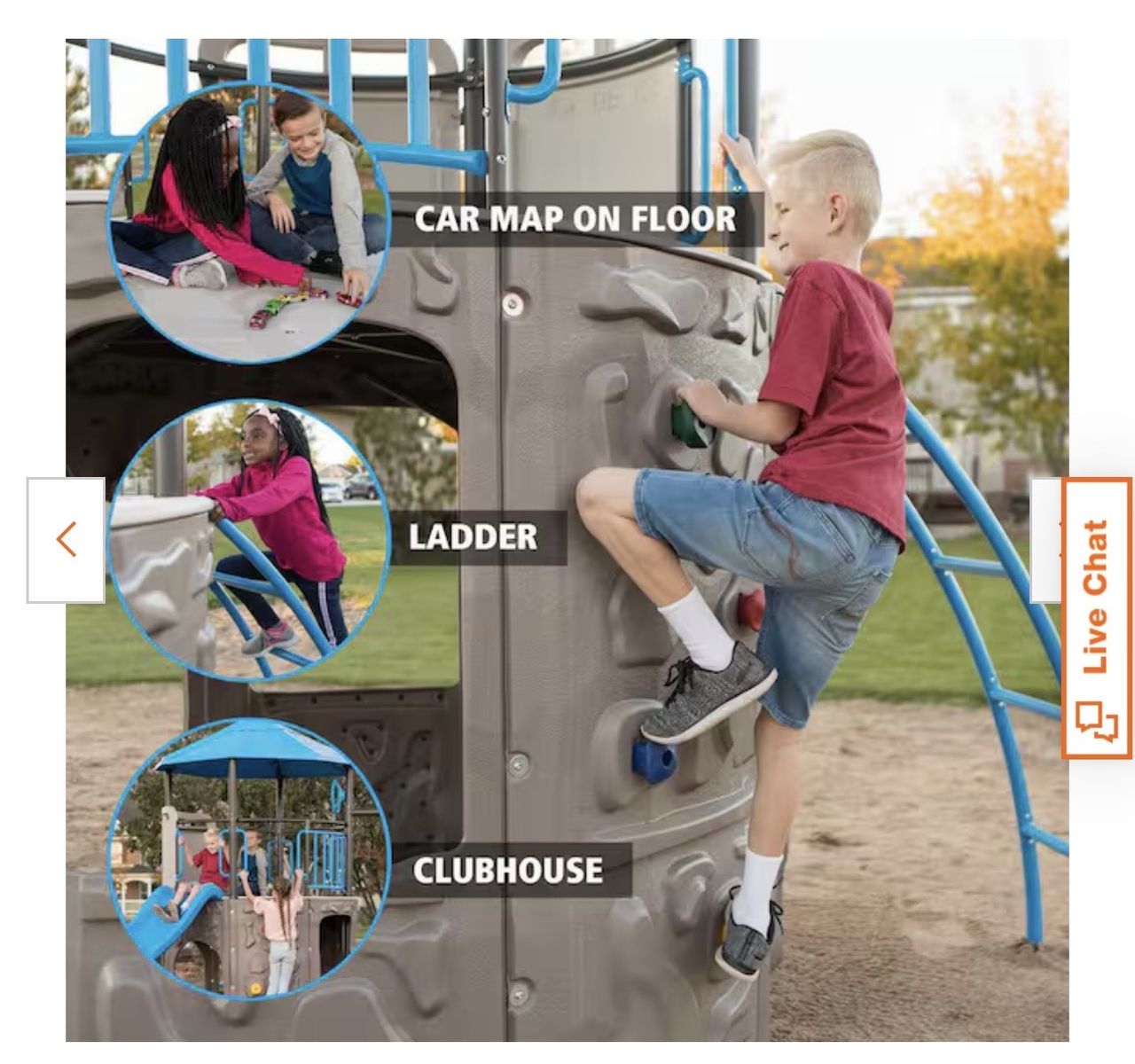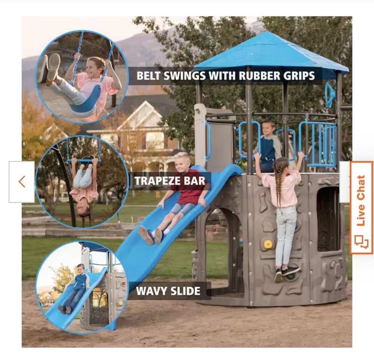 Clubhouse with hardtop roof Low maintenance - no staining or painting required Passes playground performance and safety standards Soft rubber grips on swing chains to prevent pinching or snagging Integrated car map on tower floor UV-resistant - retains strength and maintains color Free-standing - no need for cement 1 trapeze bar and 2 swings All-weather resistant - will not crack, warp, rot or split 2 sturdy 3-D climbing walls Hard edges are rounded or covered with plastic caps No lead-based material Steering wheel
