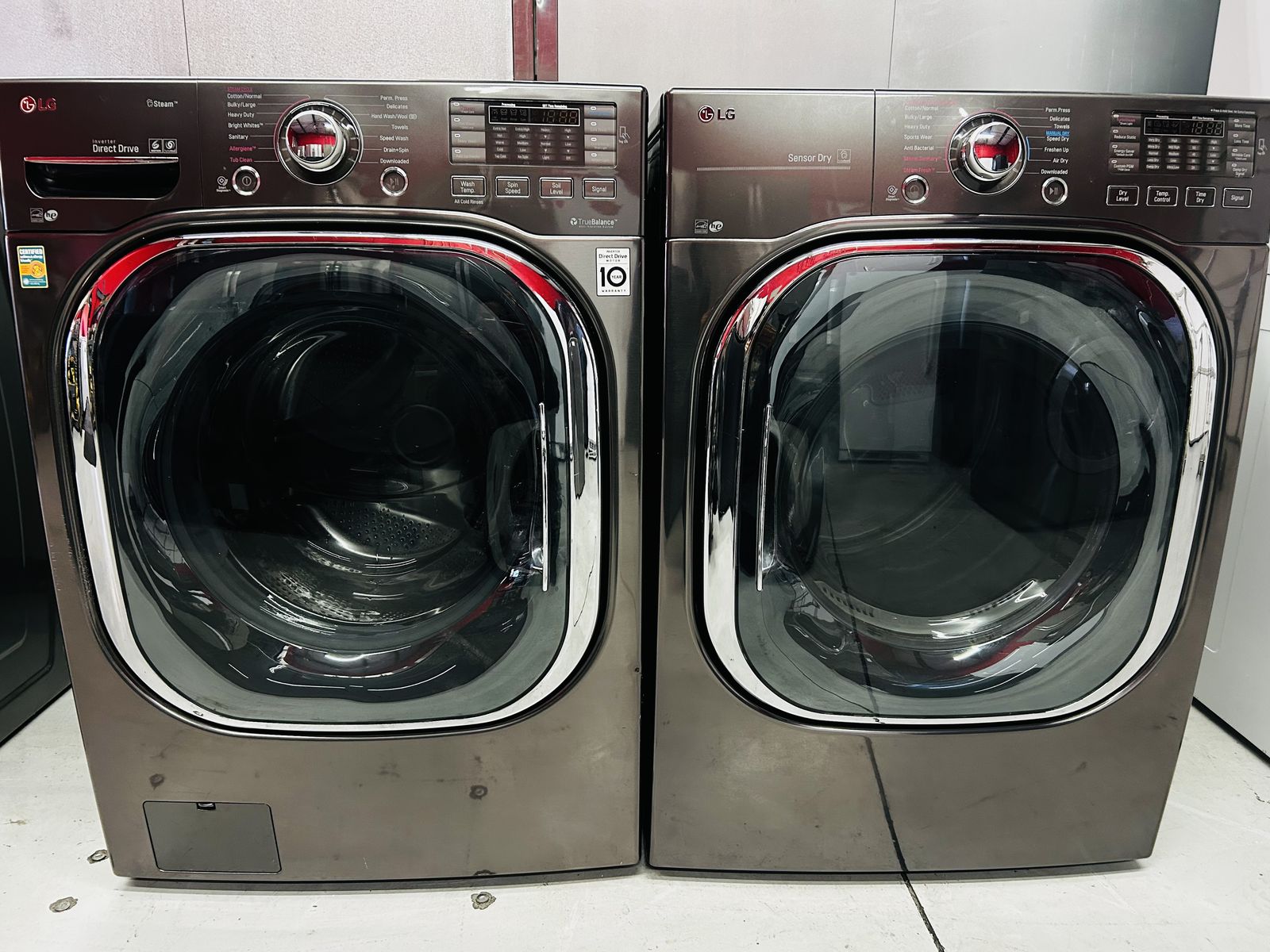 Lg Steam washer 4.5 cu ft inverter direct HE energy star turbo wash stainless steel drum heavy duty bedding steam sanitary steam allergiene tub clean speed wash downloaded steam fresh care prewash delay wash add item extra rinse rinse plus spin etc.. Lg Steam electric Dryer sensor dry energy star turbo steam Stainless Steel drum heavy duty bedding small load anti bacterial steam sanitary steam fresh speed dry air dry remote start reduce static WiFi etc..They work great, no issues, 45 day warranty, clean, delivery/install available.