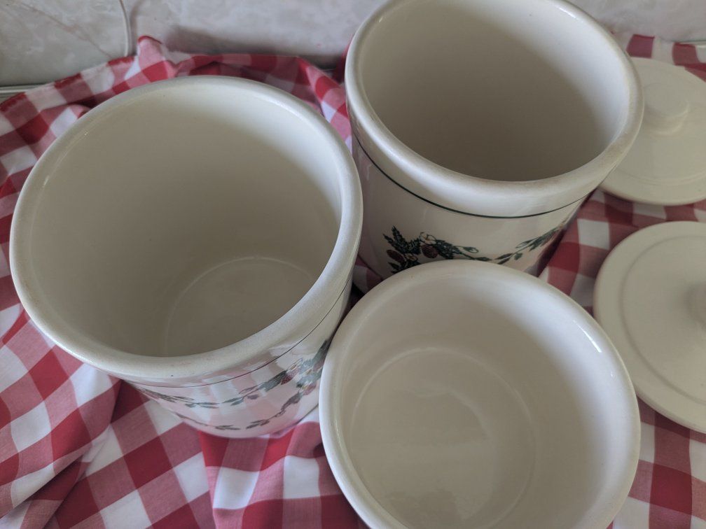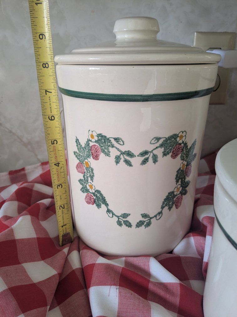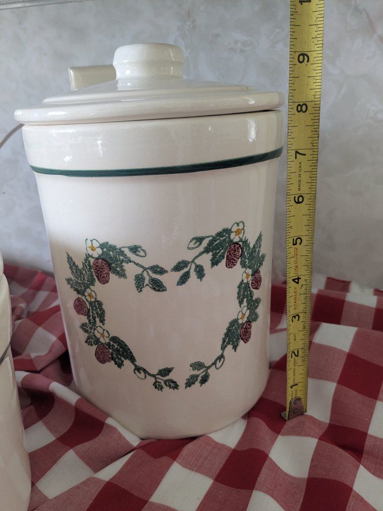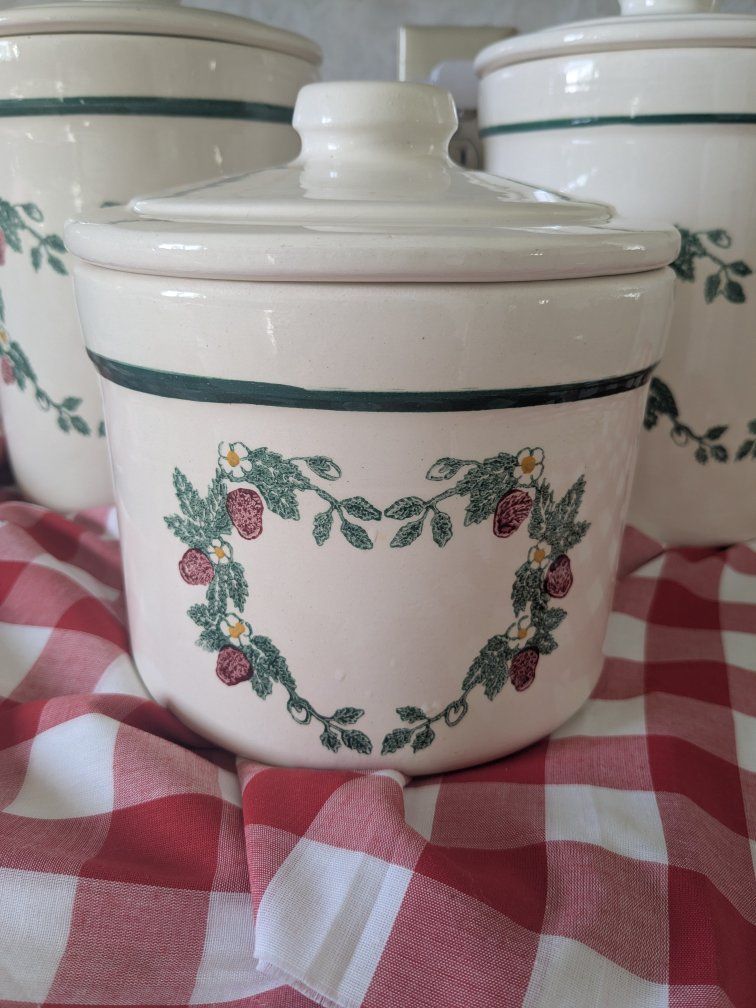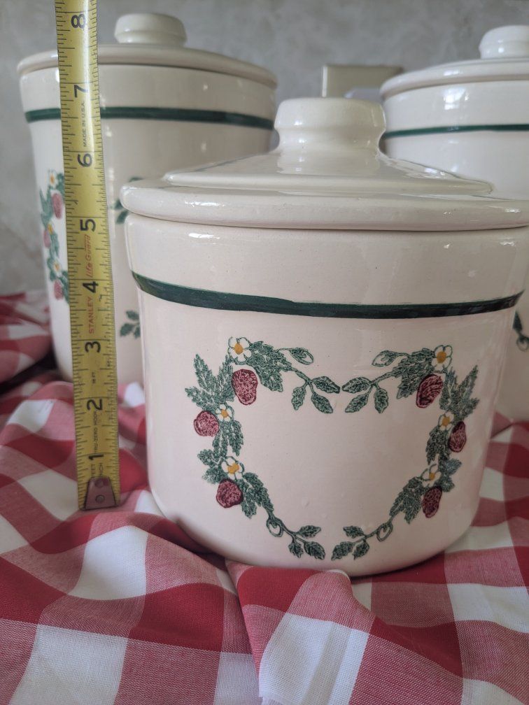 VenmoThree Beautiful vintage Crock Shop strawberry canisters, they are heavy duty and in great condition. One of the lids has tiny tiny cracks in the glaze but they are so hard to see, everything else looks great.