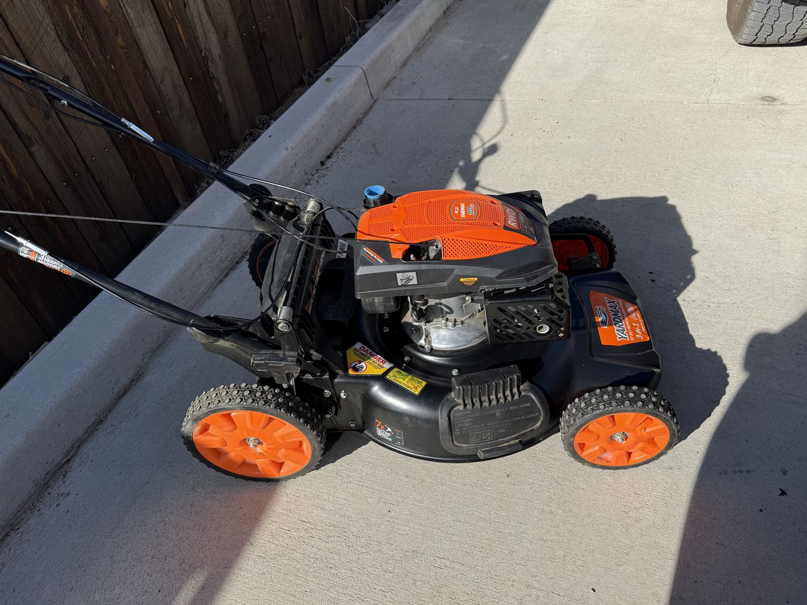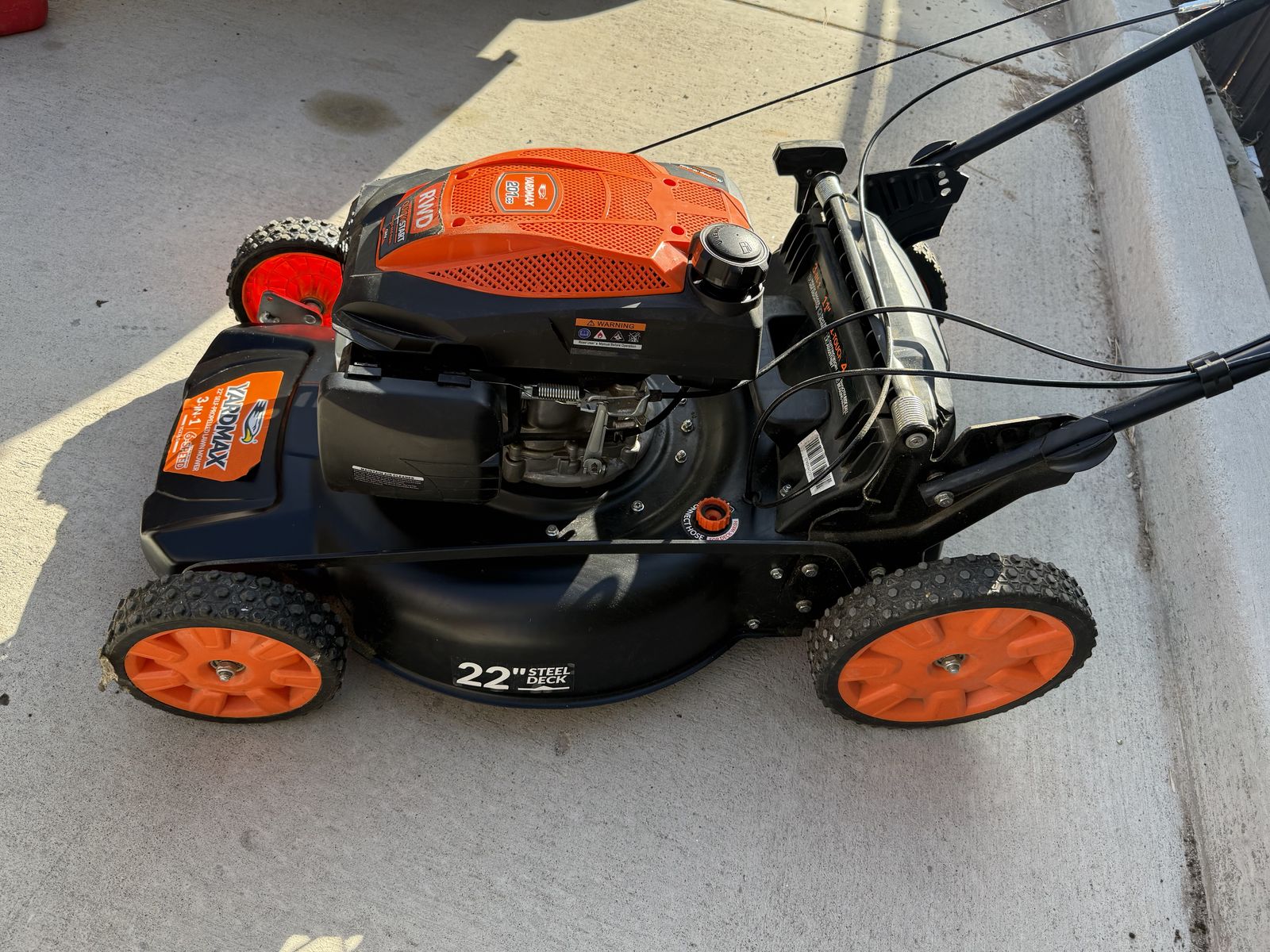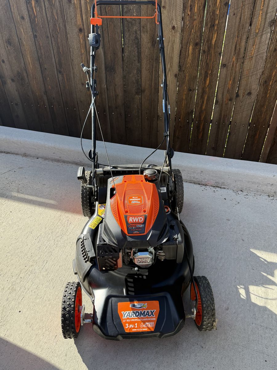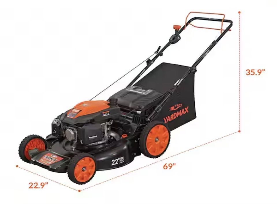 The YARDMAX 22 in. 3-in-1 rear wheel drive (RWD) Self Propelled Lawn Mower features mulching, side discharge and rear bagging options for disposing of grass clippings. Equipped with a durable 201cc OHV YARDMAX engine with automatic choke system for an easy start, no priming or choking required. This mower features exclusive and industry leading continuously variable transmission (CVT) offering superior speed variability which allows you to mow at a suitable and comfortable pace, adapting to your walking speed. Cut the lawn to your specifications with 7 cutting positions from 1.38 in. to 3.55 in., using a convenient single lever. The 8 in. front wheels and 11-in rear wheels offer smooth rolling and reduced vibration. All wheels are equipped with double ball bearings and exclusive aggressive spiked tread rubber tires for an increased traction and maneuverability. The MaxFlow volute deck is designed to keep grass clippings airborne longer for superior mulching or for flowing into the rear bag when needed. The mower also features a durable 16-gauge seamless stamped steel deck. Convenient way to quickly clean the underside of the cutting deck with the deck clean-out port, simply attach a hose to the port. Space saver, the entire mower can be compactly folded for storing in limited garage spaces. Fully assembled, just unfold the handle and you're ready to go. The YARDMAX YG2760 will make your yardwork job easy and will provide clean-even cut season after season.