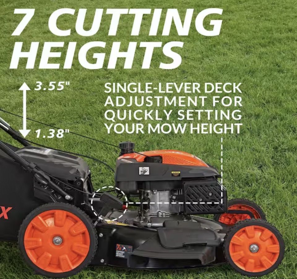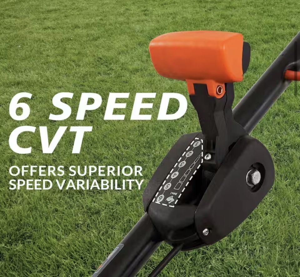 Exclusive and industry-leading CVT (Continuously variable transmission) offers superior speed variability to adjust the mower pace to your walking speed by simply selecting the 6-speed shift lever Exclusive rubber tires with aggressive spike tread pattern significantly increases overall traction and maneuverability Easily clean the underside of the cutting deck with the deck cleanout port Single-lever deck adjustment for quickly setting your mow height 7 cutting heights from 1.38 in. to 3.55 in. Double ball bearing wheels for an easy and smooth rolling and an extended durability Maxflow deck technology - volute spiral deck design for better airflow and mulching Heavy-duty, 16-gauge stamped steel deck Durable, 1-piece seamless steel deck reduces vibration Starting made easier with the automatic choke system, no need to prime or choke the engine Folds for space-saving storage Choose side discharge, mulching or rear bagging 8 in. front and 11 in. rear wheels for stability and control Large rear bag capacity Adjustable, durable 3-position handle height Fully assembled
