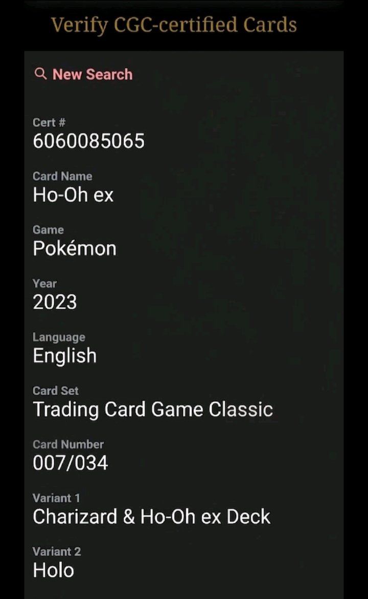 VenmoCGC 10 Gem Mint Ho-Oh ex - Pokémon Item Details: Card: Ho-Oh ex (Holo) Set: Trading Card Game Classic Card Number: 007/034 (Charizard & Ho-Oh ex Deck) Grade: CGC 10 Gem Mint Certification #: 6060085065