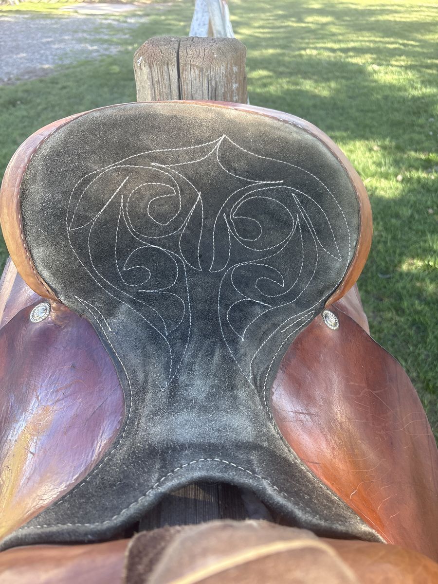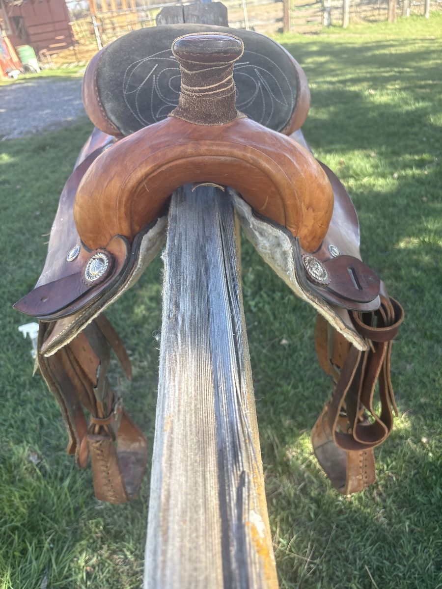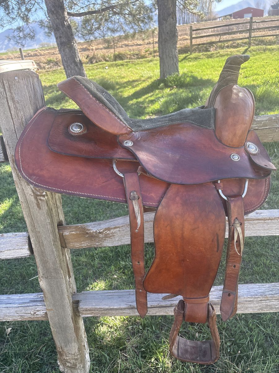 16 inch seat with 7.5 inch gullet. No name saddle with quick change leather covered stirrups. Great condition. Located 7 miles south of Logan. 325.00