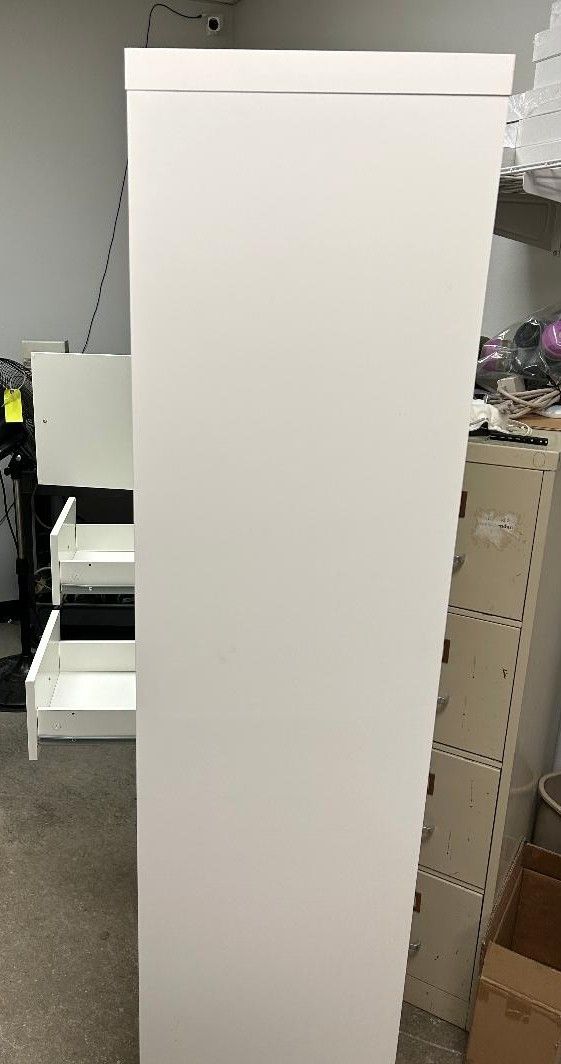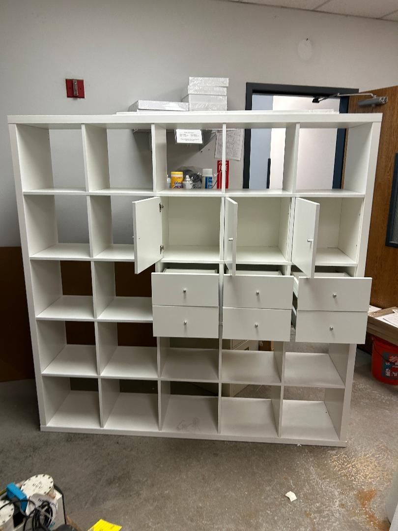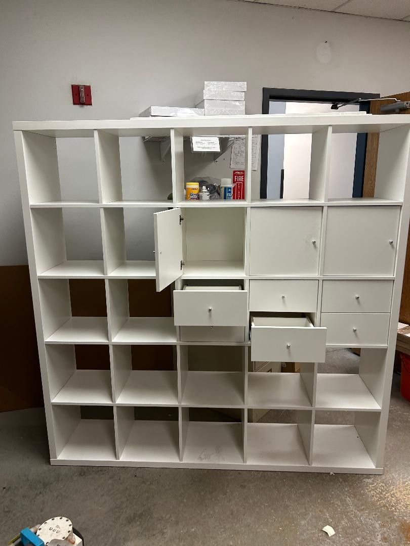 VenmoIn good condition and mostly assembled. We put together half of the doors and drawers, we do have the rest we just didn't need to put them in. It's a little dusty, some minimal wear and tear. It's only been used for about 8 months. Brand new it's $450, my workplace got new lockers to replace this and we no longer need it. It is the 71.5"x71.5" sized shelf.