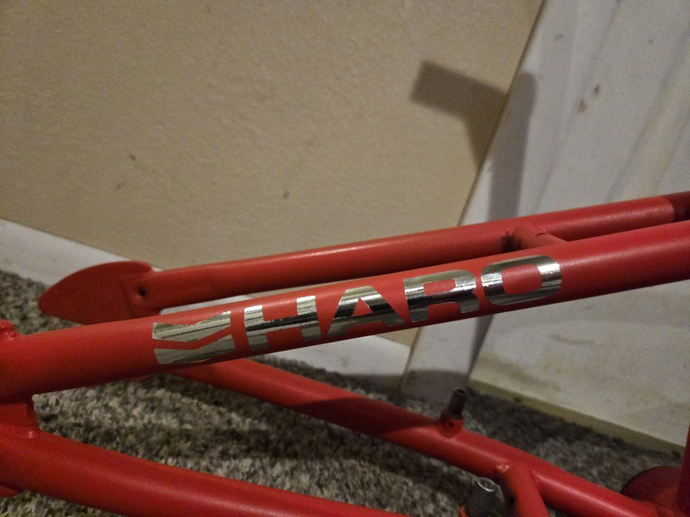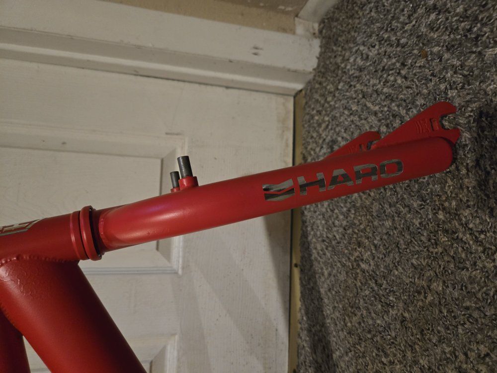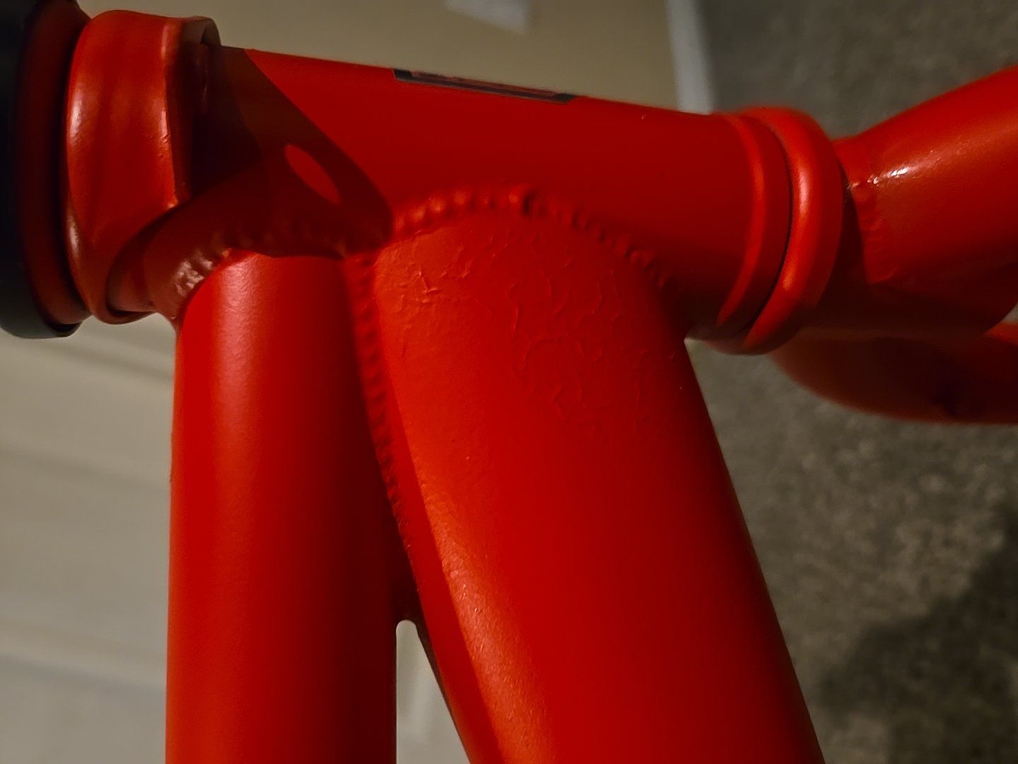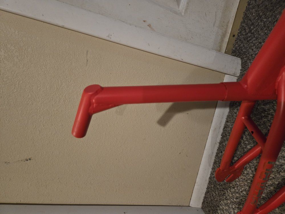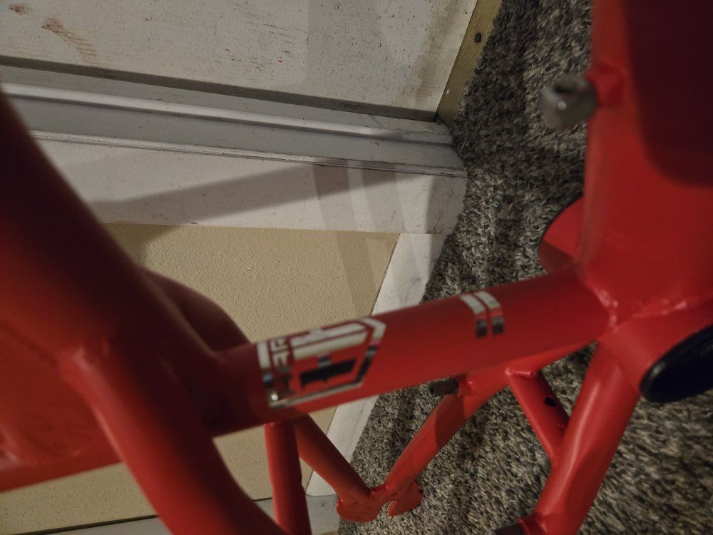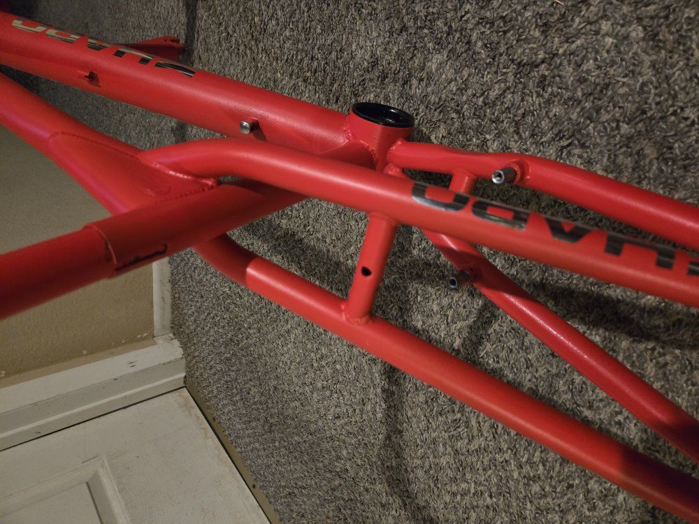 frames painted red with clear coat. its got some flaws in paint but isn't terrible. frame is solid. no cracks or dents