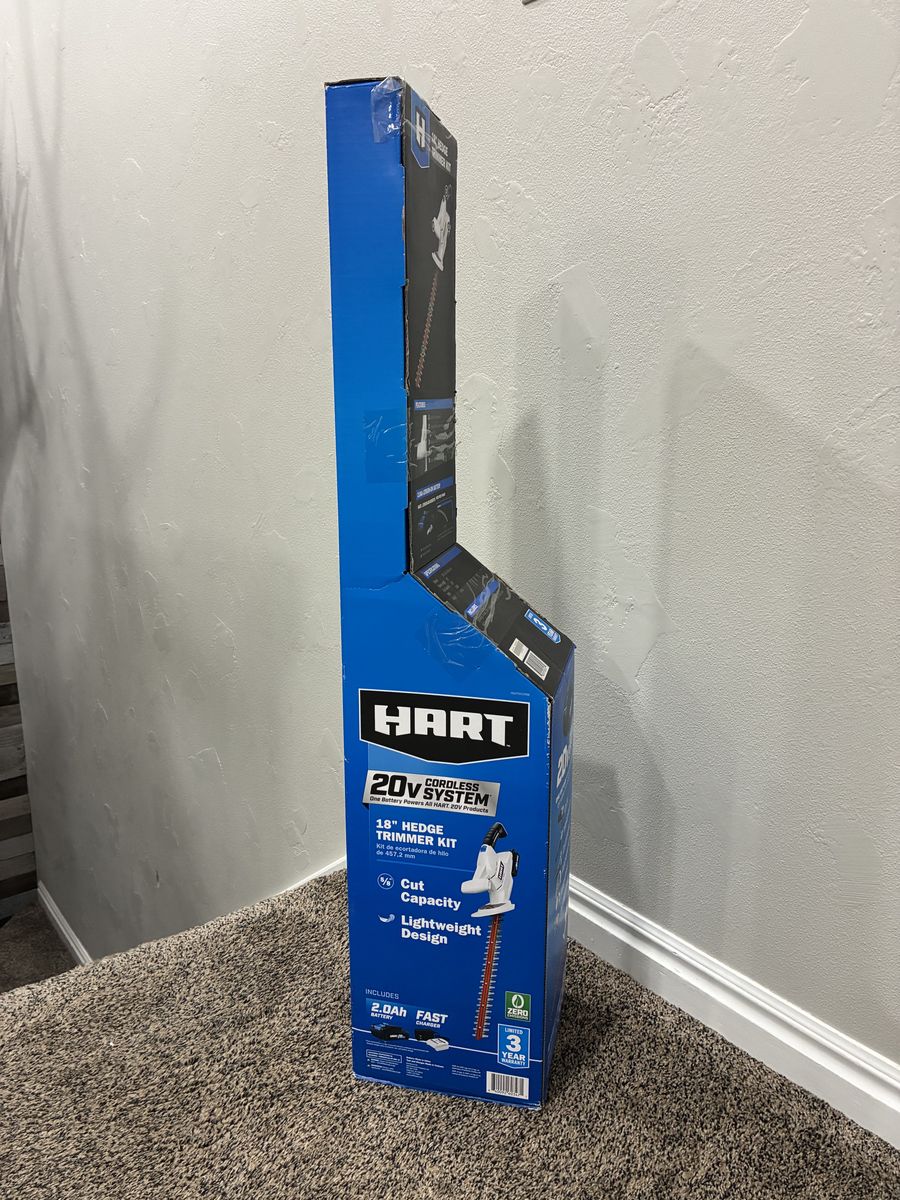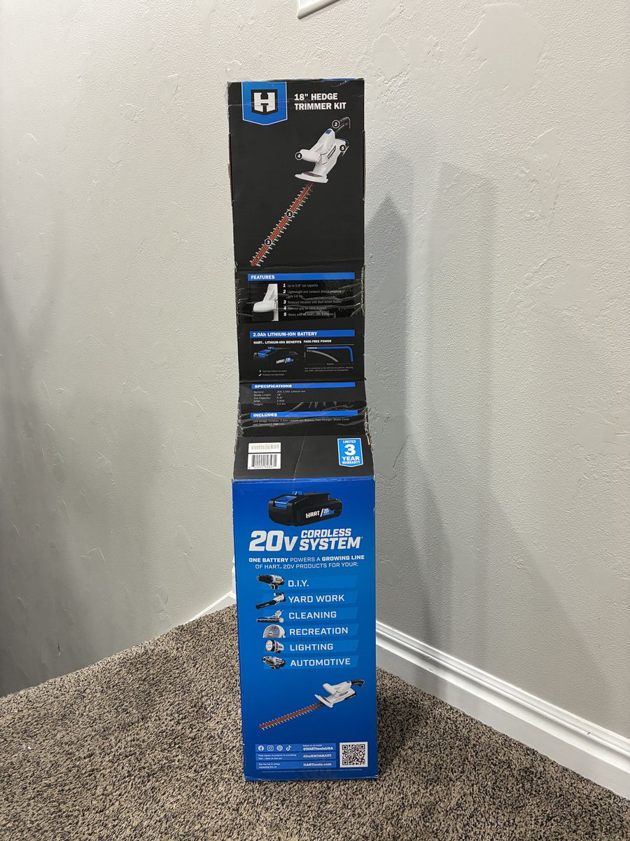 VenmoNew HART 20V Cordless 18 inch Hedge Trimmer Kit. This thing is still in the box, never opened. Comes with a 2.0Ah battery and fast charger. Super lightweight design and has a 5/8 inch cut capacity. Great for keeping your hedges looking sharp!