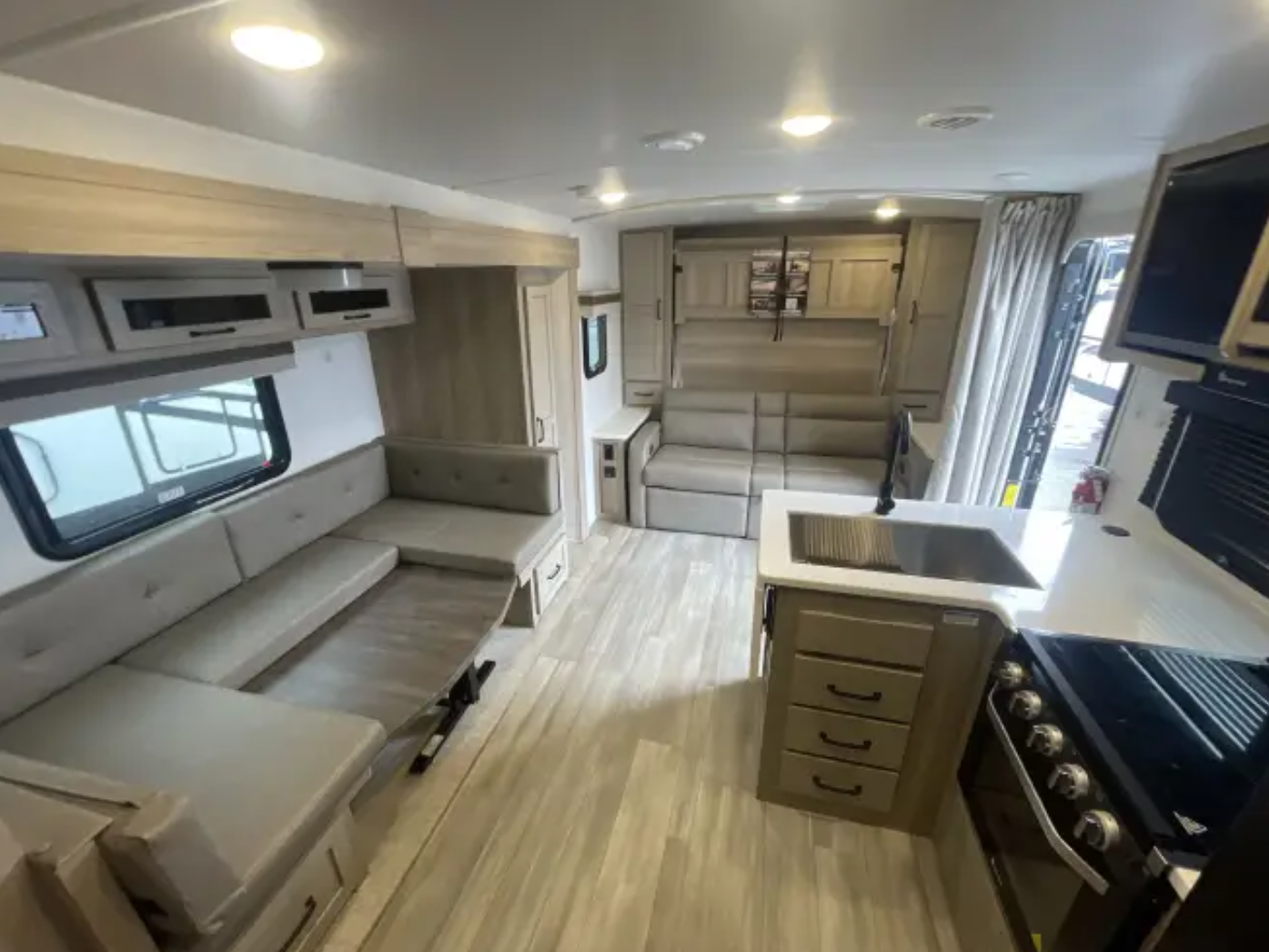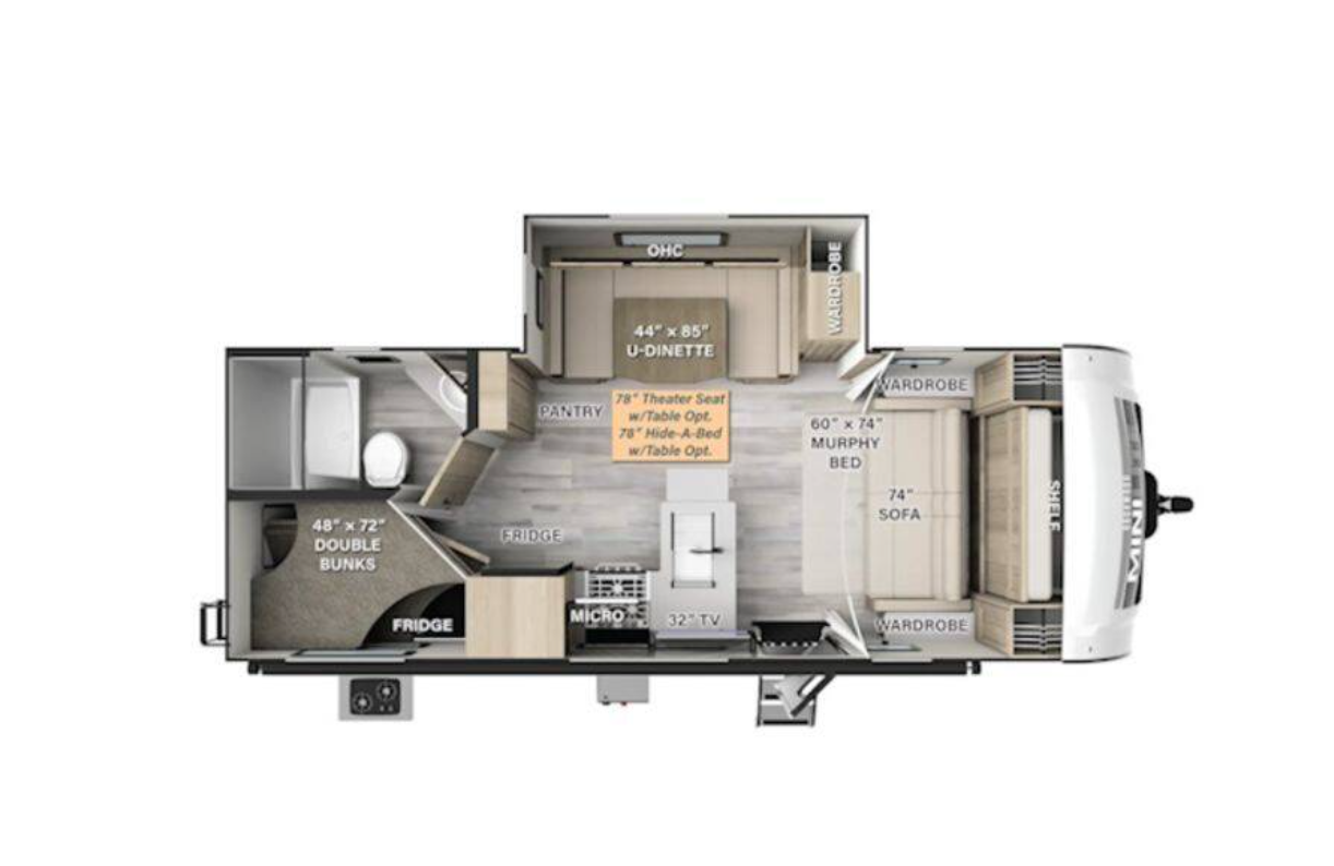 -Lightweight travel trailer, easy to tow -Approximately 26 feet long with one slide-out -Front Murphy bed with sofa -Rear double bunk beds -Convertible dinette for additional sleeping -Full kitchen with cooktop, microwave, and refrigerator -Full bathroom with shower -Power awning -Exterior storage -Outside kitchen (model dependent) -Solid step entry and modern interior finishes -Upgraded front jack