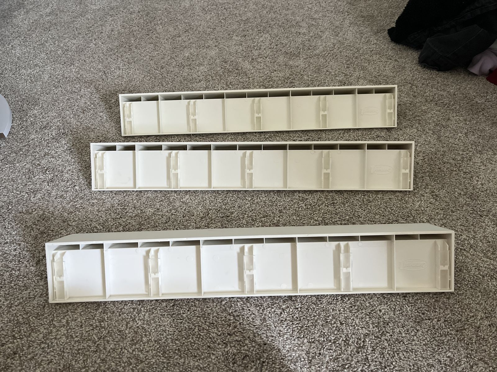 21 inches long by 3 inches wide Used but good condition! Please buy all 3 together! Thx! Does not come with the sticky tape to hang in the wall.