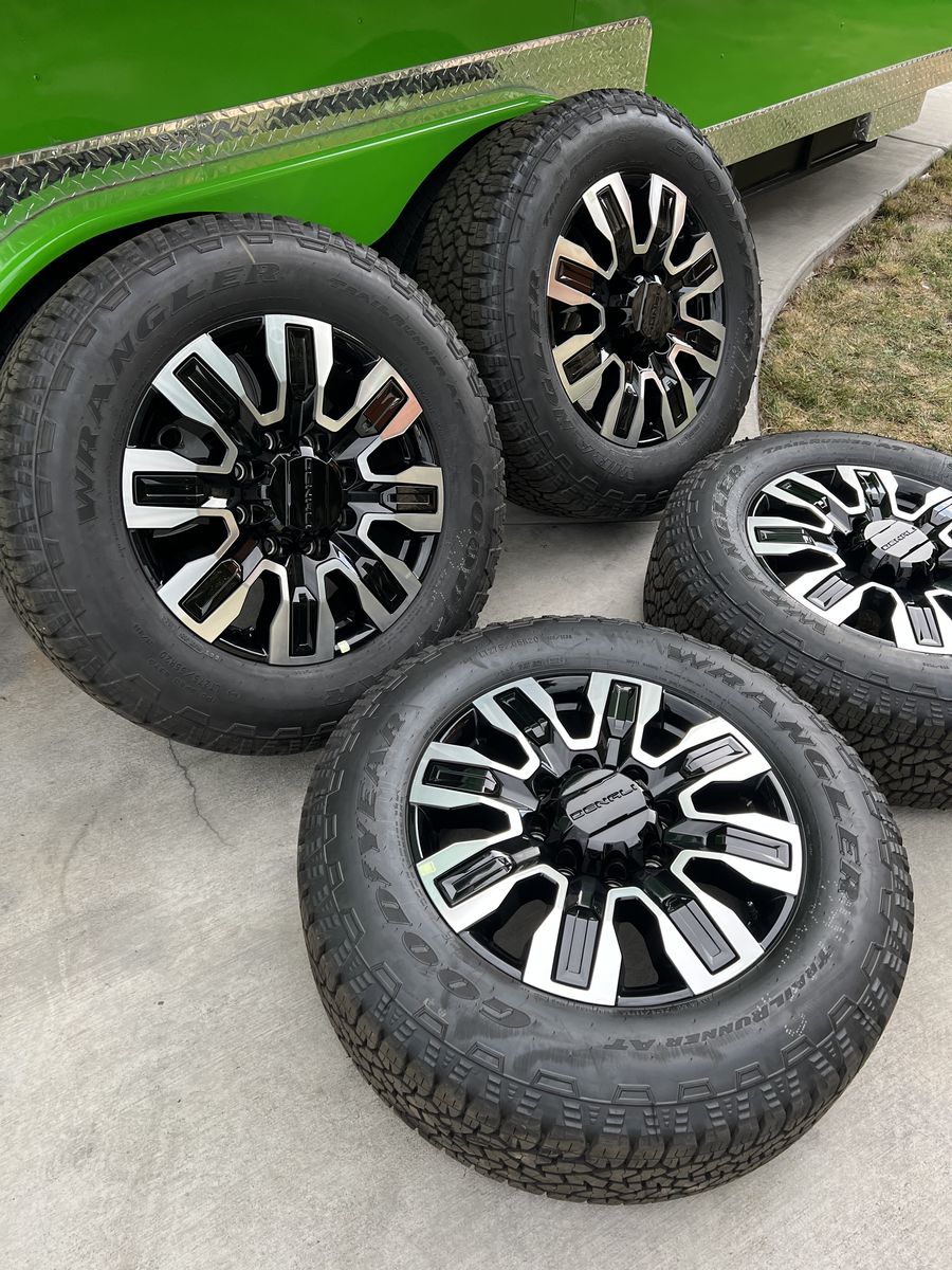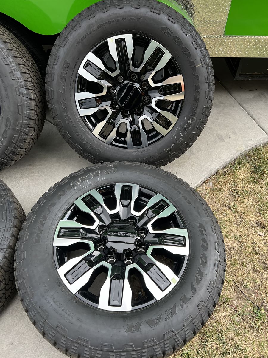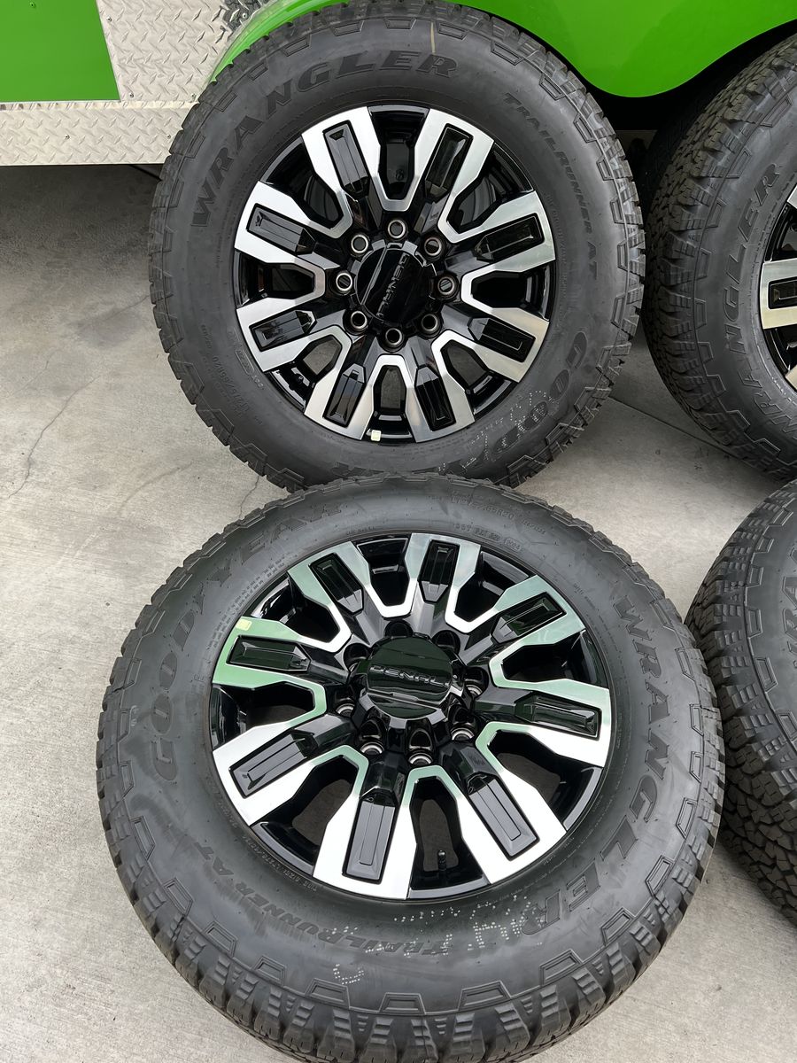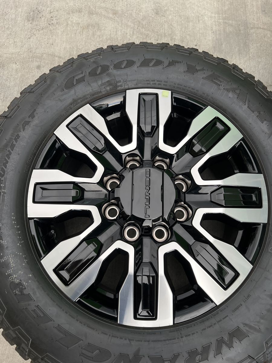 Selling my brand new gmc Denali 2500 ultimate wheels and tires only 10 miles on them tires are 275/65r20 Goodyear wrangler trail runner A/T load range E 10ply