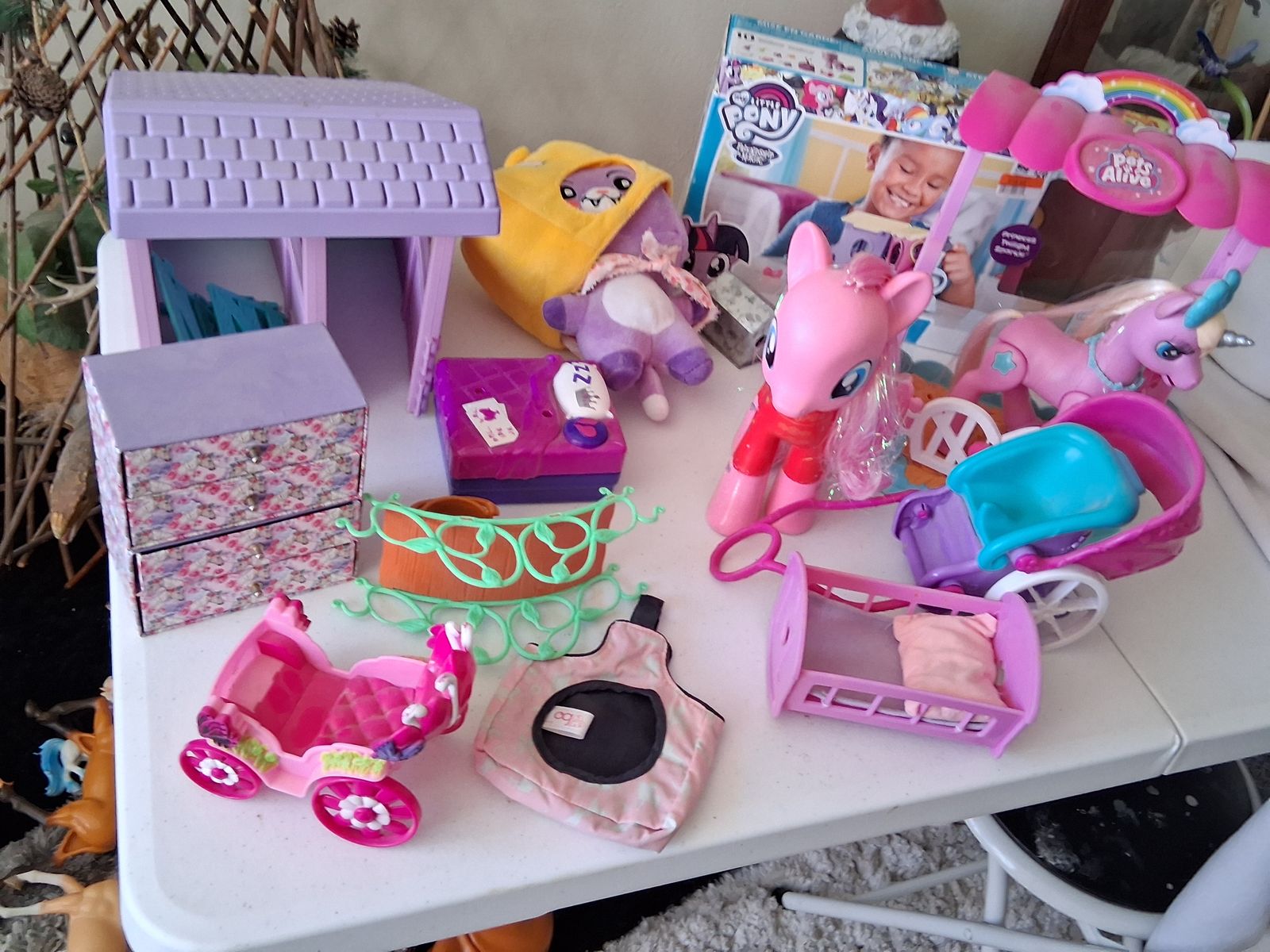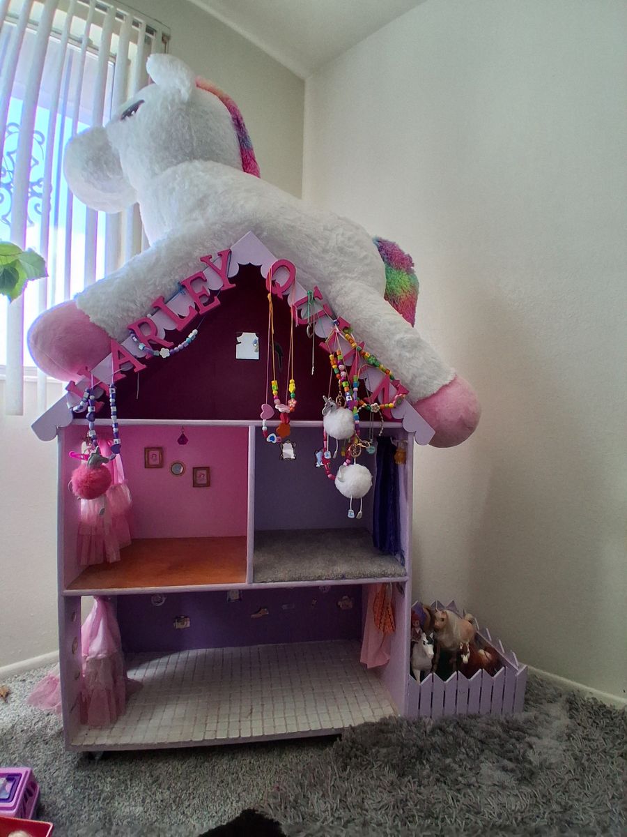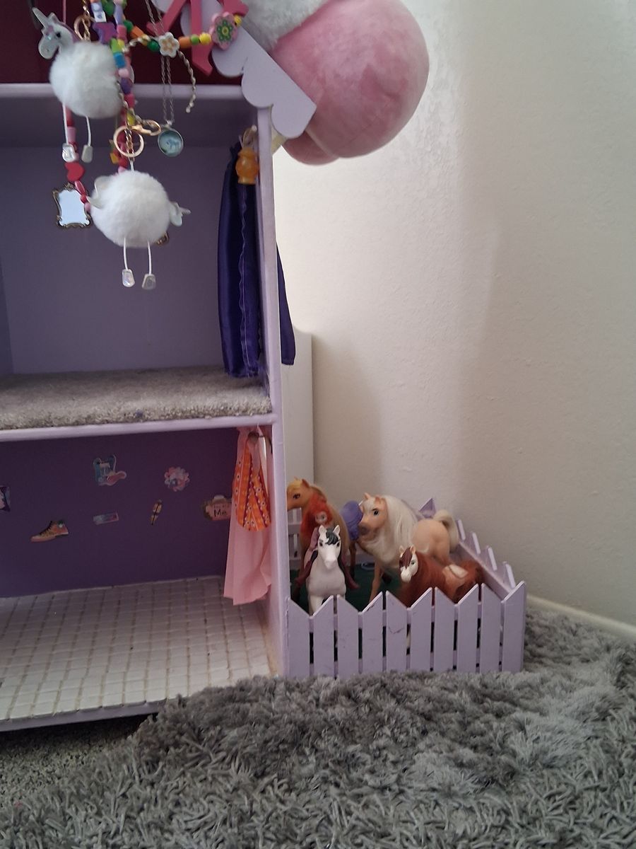 Custom built dollhouse attached is a horse yard, has rollers on it so it's movable and or portable comes with selected toys ( it's been very well taken care of she has just outgrown it)