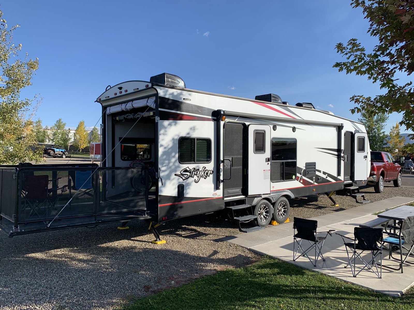Stryker ST2916 2021 model year. Everything works as it should and this one is still in good condition. The kids have grown up and we are selling this due to lack of use. Asking $39,500 but definitely open to offers. You will have to have at least a 3/4 ton truck to tow this. This one has a couple options you won’t find on other 2916’s. This one has the upgraded 5500 Onan generator from the factory. It also has the second AC unit added from the factory. Also, because it was a weird time to buy things, some won’t have the patio kit. You definitely need a second AC on this size trailer. Also, including the equalizer brand hitch. This is ready to go. It’s still winterized right now but I will be changing that soon. Currently located in St George UT. I will include a Rancher with a full price offer.