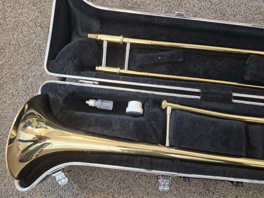 Just serviced and cleaned. In great working order and no repairs needed. Includes a sanitized mouthpiece and starting materials. I'm a musician and technician and guarantee it is ready to go or you can exchange it. All slides and valves move freely. No dents, a couple dings. If your band teacher doesn't approve you can exchange it. Feel free to call or text if you have questions.
