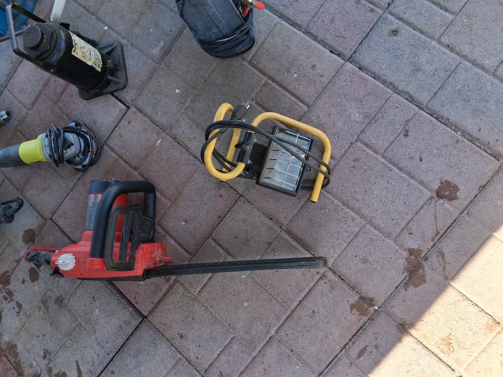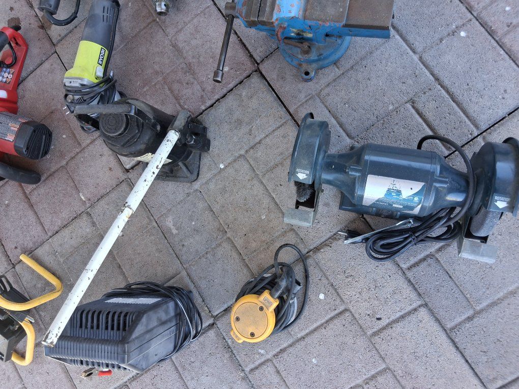 13 each assorted tools $15 each circular saw Impact gun electric chain saw flood light hydraulic jack sander grinder vise drill plug in air staple gun dewalt battery drill 2 wheel grinder battery charger