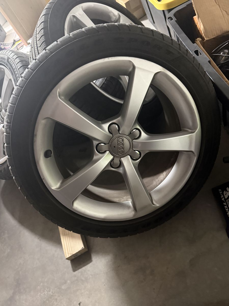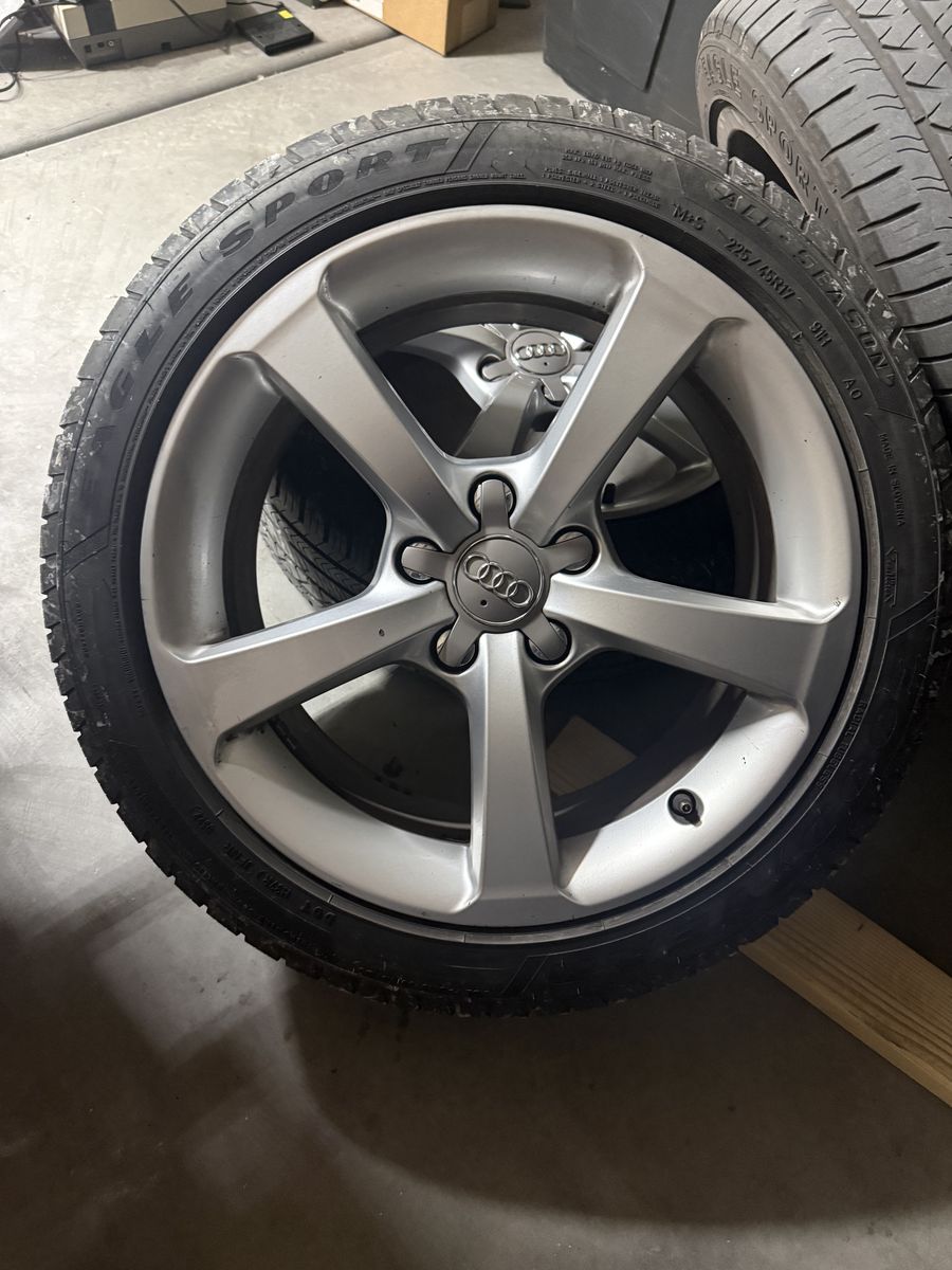 ApplePayListing Title 17" OEM Audi A3 Wheels & Goodyear Eagle Sport Tires - 5x112 (Near Perfect) Description Selling a complete set of 4 factory Audi 17-inch wheels and tires taken off a 2015 Audi A3. The wheels are in excellent condition with no curb rash or bends. The tires are premium Goodyear Eagle Sports with plenty of life left. These are a perfect upgrade for an older Audi/VW or a reliable set for winter/spare use. Wheel Specifications: • Size: 17" x 7.5" • Offset: ET43 • Bolt Pattern: 5x112 (Fits most modern Audi, VW, and some Mercedes) • Hub Bore: 57.1mm • Condition: Perfect condition, includes all 4 OEM Audi center caps. Tire Specifications: • Model: Goodyear Eagle Sport All-Season • Size: 225/45R17 91H • Designation: AO (Audi Original Equipment) • Tread Depth: 8/32" remaining (Measured with gauge) • Treadwear Rating: 560 (High-mileage, durable compound) Fitment Note: These will fit a variety of Audi A3/S3/A4 models, as well as VW Golf, GTI, Jetta, and Passat platforms. Please verify your hub bore and offset requirements before purchasing. Price: $600 Location: St. George, UT Local pickup only. No trades.