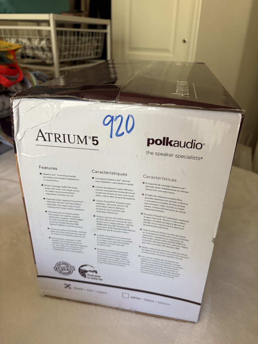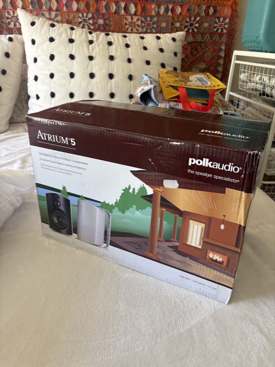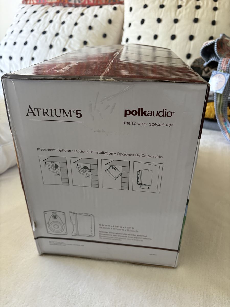 Venmoall-weather enclosure 5" woofer, 3/4" aluminum dome tweeter frequency response 60-25,000 Hz sensitivity 90 dB 8-ohm impedance handles up to 100 watts