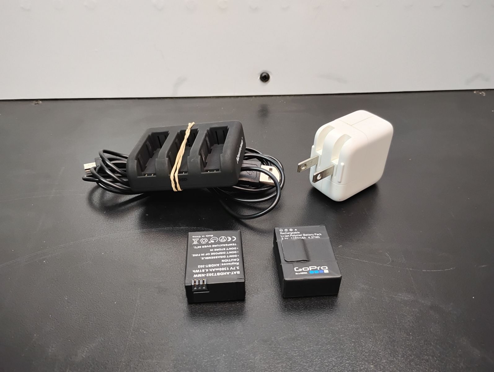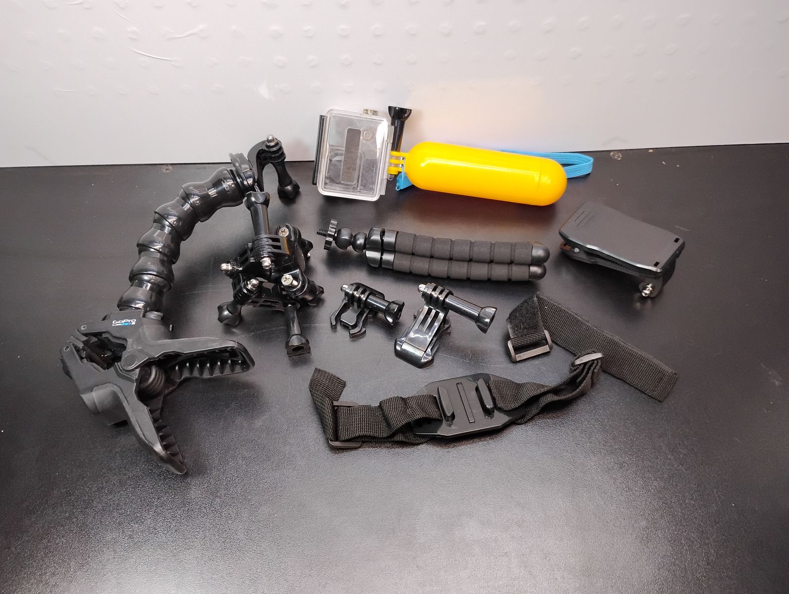 This GoPro camera kit comes with a charger and 3 batteries and storage bag. Multiple mounting hardware included with the kit.