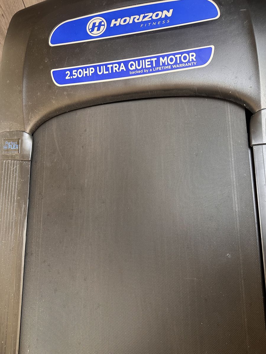 Horizon Fitness treadmill. Treadmill folds up to save on space. 2.50 HP/Ultra Quiet Motor. This is in great condition and gently used.