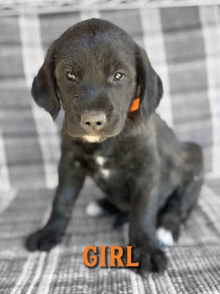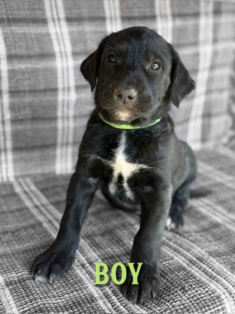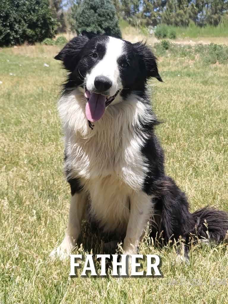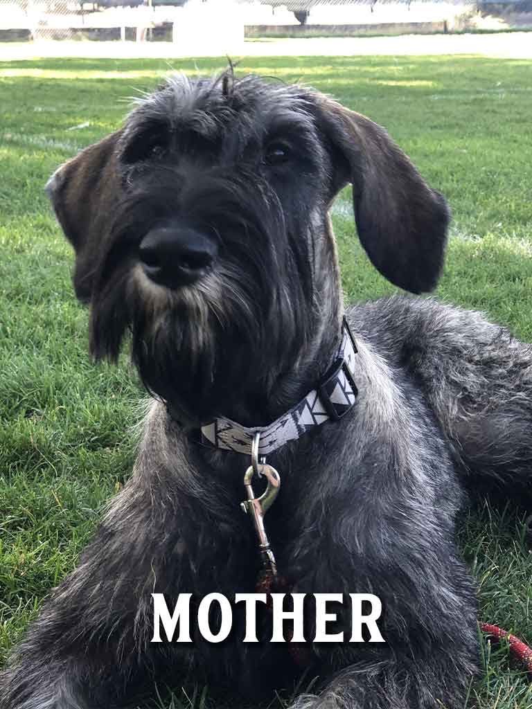 Mother is a purebred Giant Schnauzer (salt and pepper brown tones) and the father is a purebred Border Collie (black and white). Our dogs have been raised with our kids and around farm animals including cats. They are good family companions and are true Velcro dogs that love their people. Your Giant Border Schlollie will be an all around easy going dog with energy to burn.