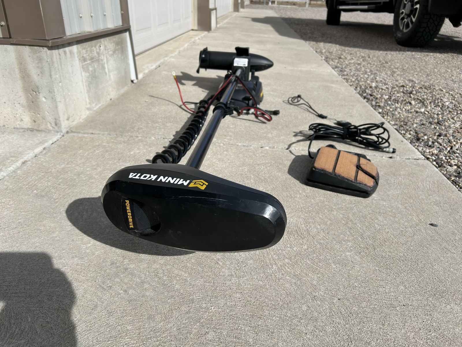 2022 Minn Kota Power drive motor for sale. 55 Lbs of thrust, 12 Volt system, 54" shaft, copilot with wireless remote control, foot pedal control. $695.00 cash only. Call or text Mike 208-681-1451