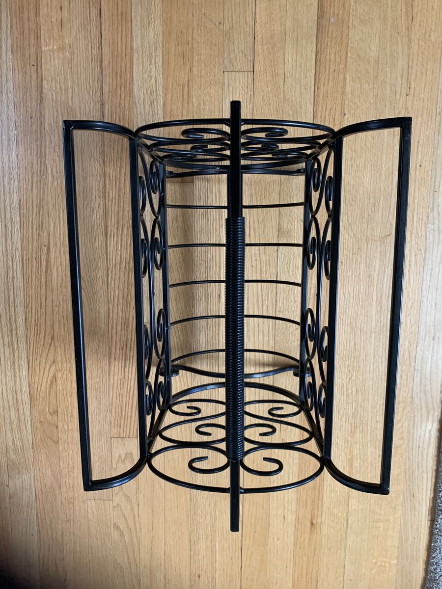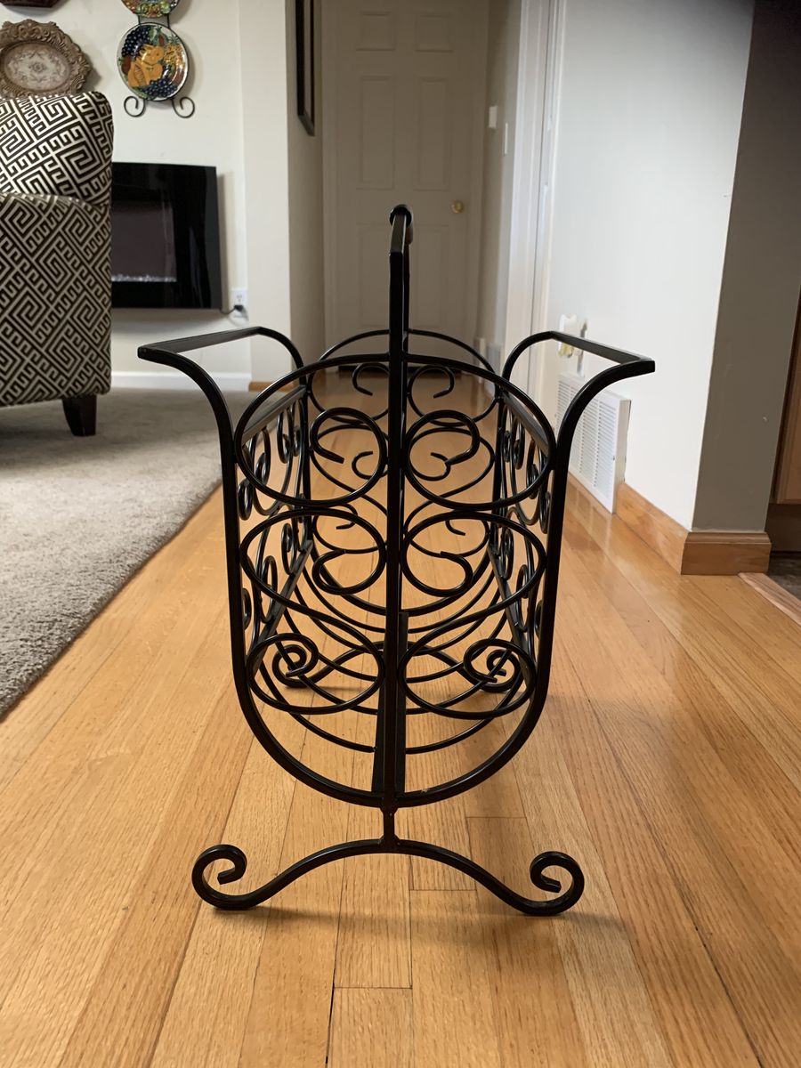 VenmoBlack iron with a gold tone. With its convenient handle, you can move it around and access your magazines, books or crafts easily. 15 1/2” H x 14”W. Heavy so does not tip. Clean. Venmo to hold. Non-smoking/No pet home