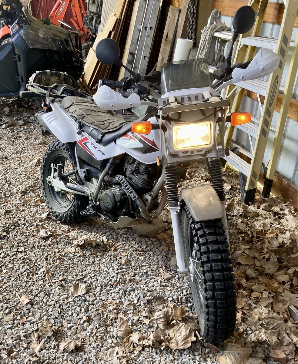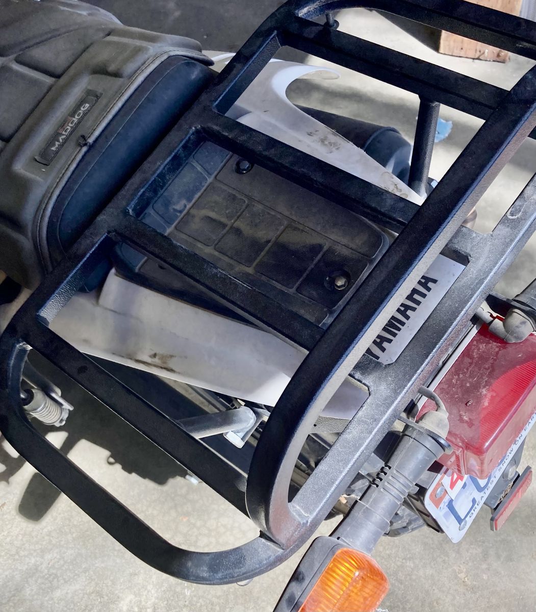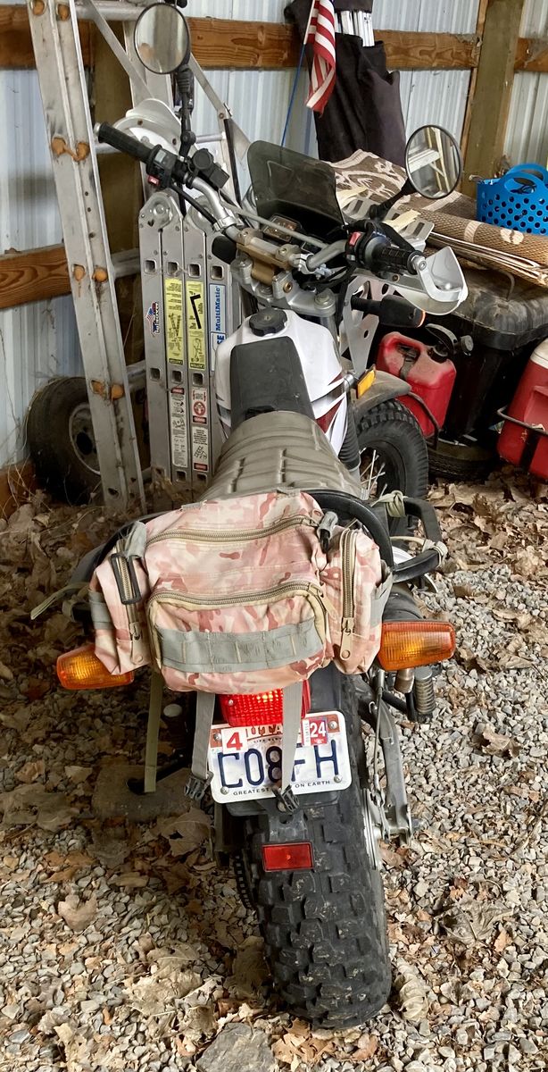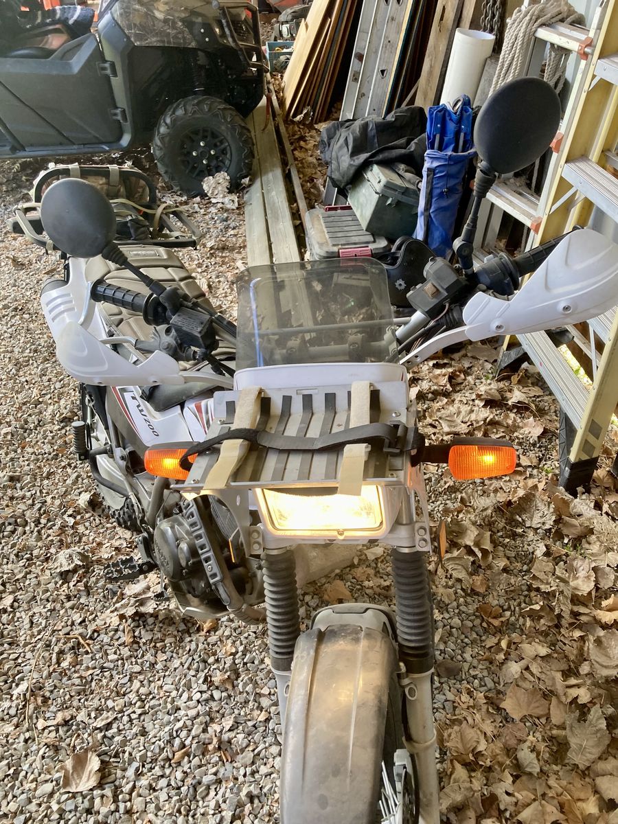 My old man scooter, this thing will haul your beefy butt up to some places you probably shouldn't go. New front tire, front rack, rear rack,ricoche skid plate, knuckle guards, grown up foot pegs. And some other stuff.