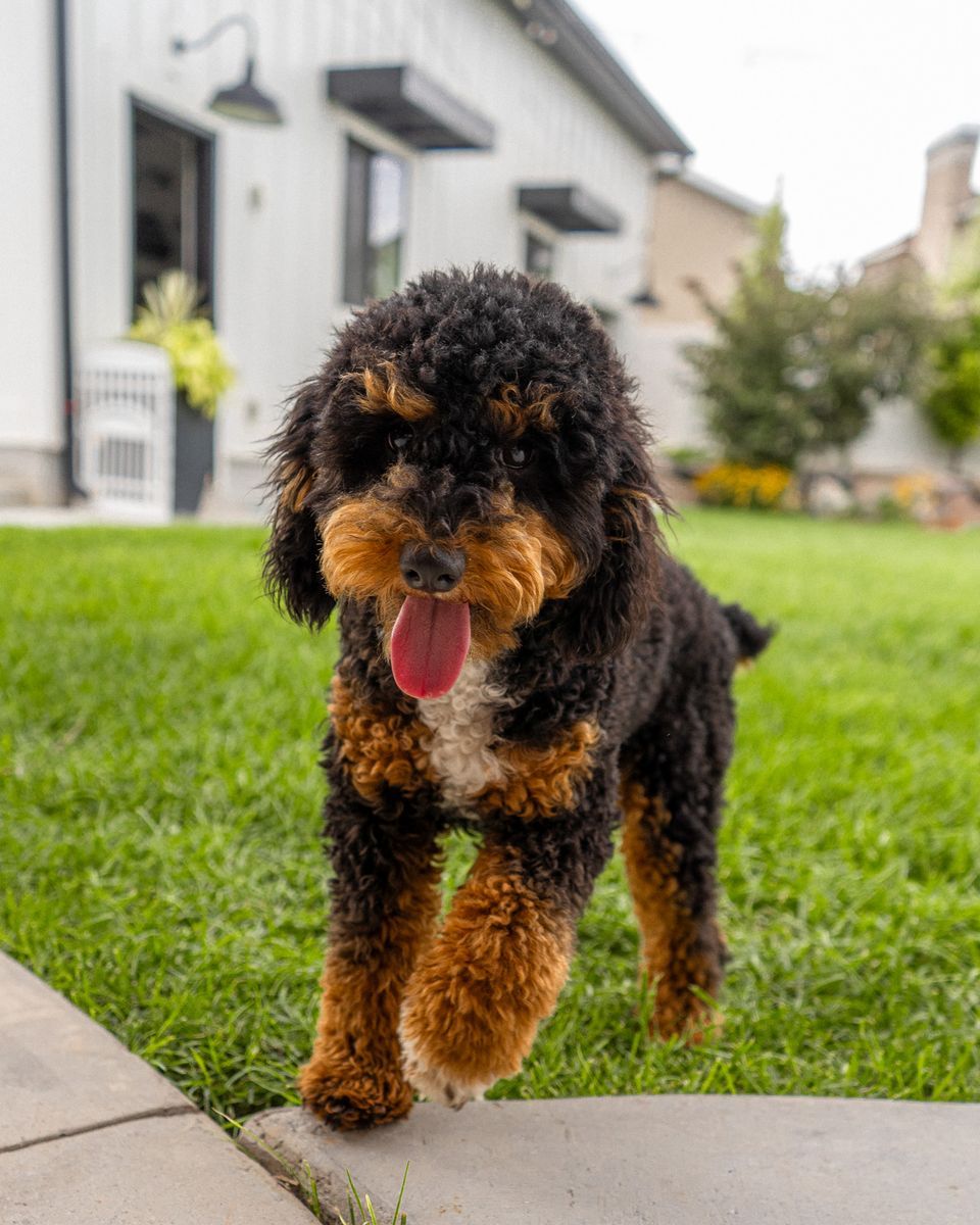 Bobo is the sweetest Miniature Poodle. He is calm, affectionate, and has beautiful markings with perfect tri-color genetics. His coat that passes down to his offsprings has a bold white tuxedo chest, outlined by warm brown tones and rich copper tan points above his eyes and on his legs.