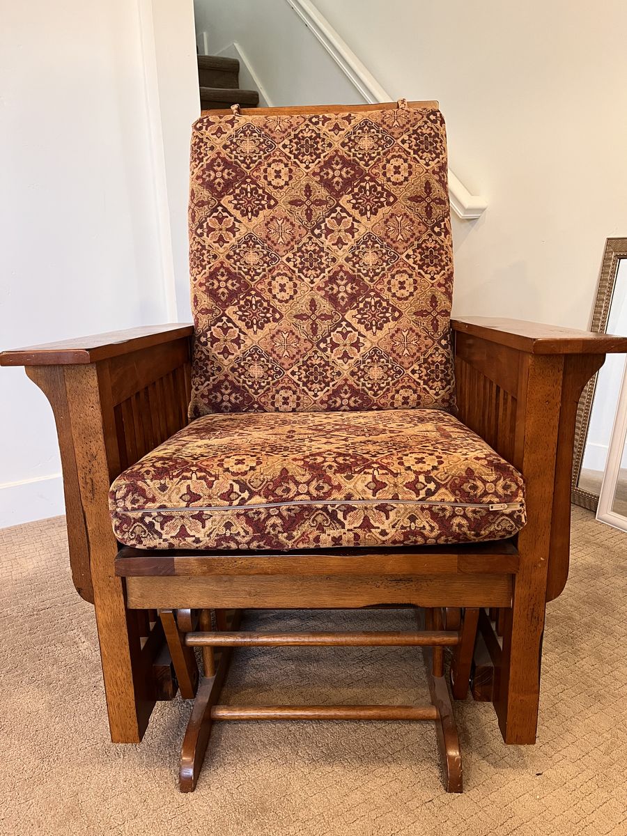 Solid wood modern glider style rocking chair. Good working condition with recently replaced glider bearings. Non smoking/pet.