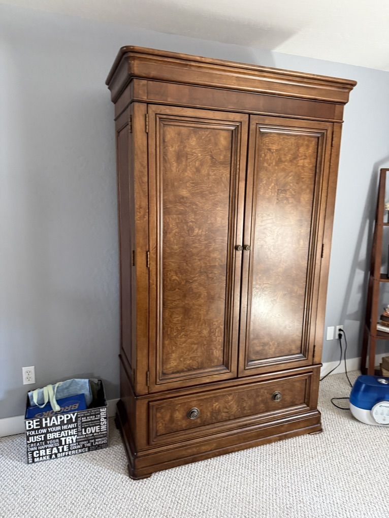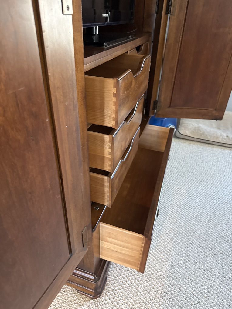 VenmoThis is beautifully made & in perfect condition. They simply don’t make furniture like this anymore. Solid wood drawers, all dovetailed & slide like butter. There are also 2 shelves if you prefer to not use it for a TV too. It also comes apart into 2 pieces for moving.