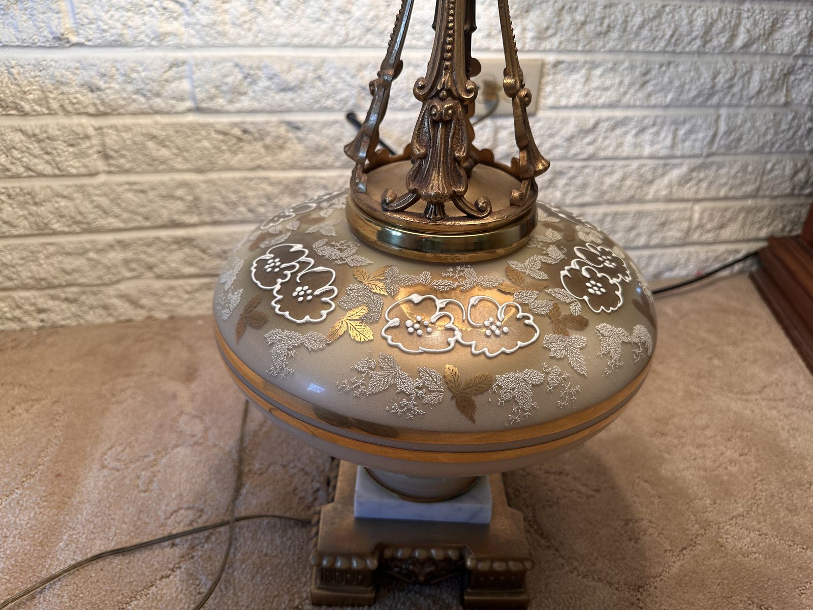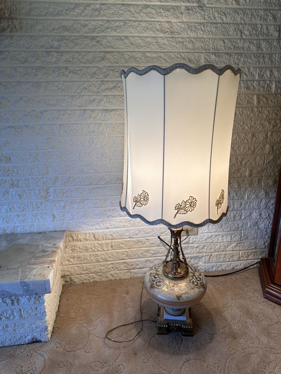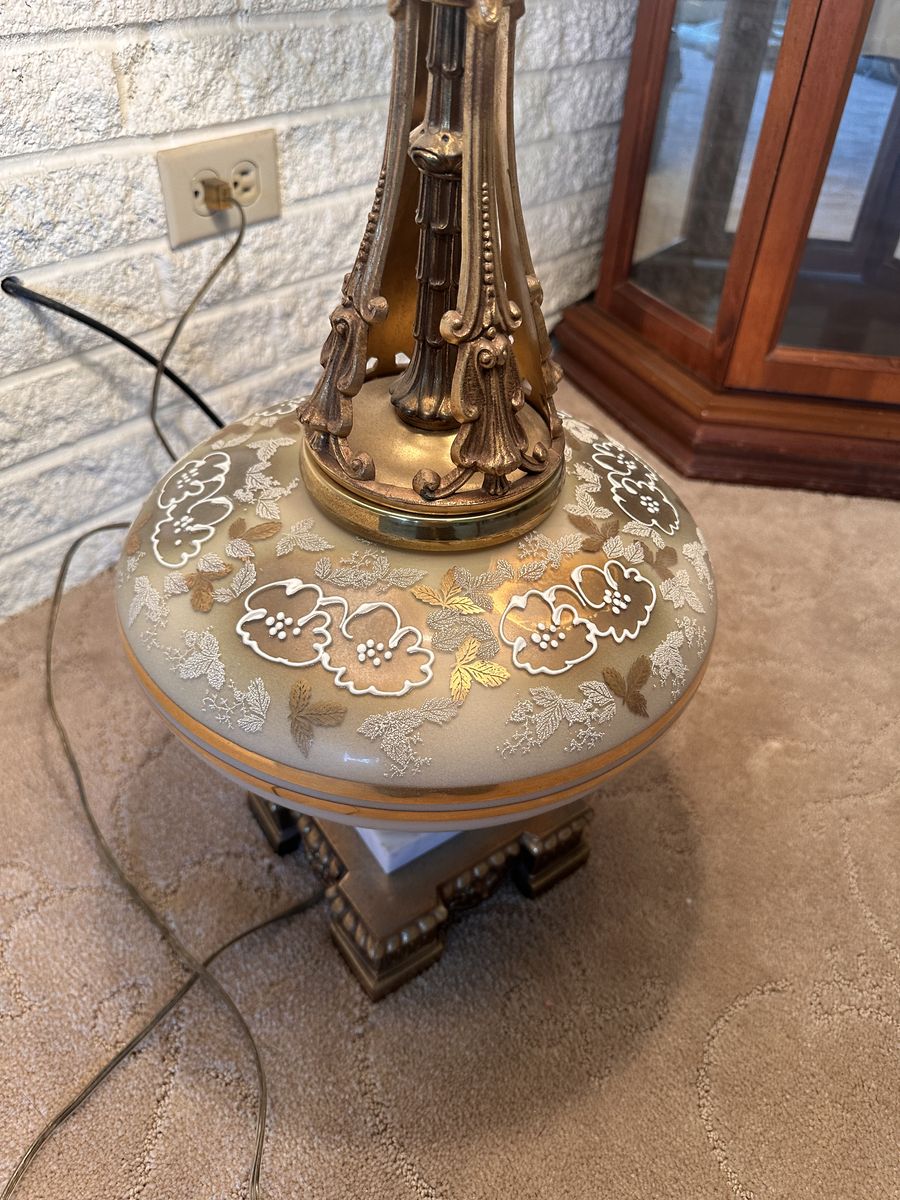 Fair vintage condition. The lampshade has a large rip and shows some wear, along with minor age-related wear on the lamp itself. Still displays nicely and works as it should.