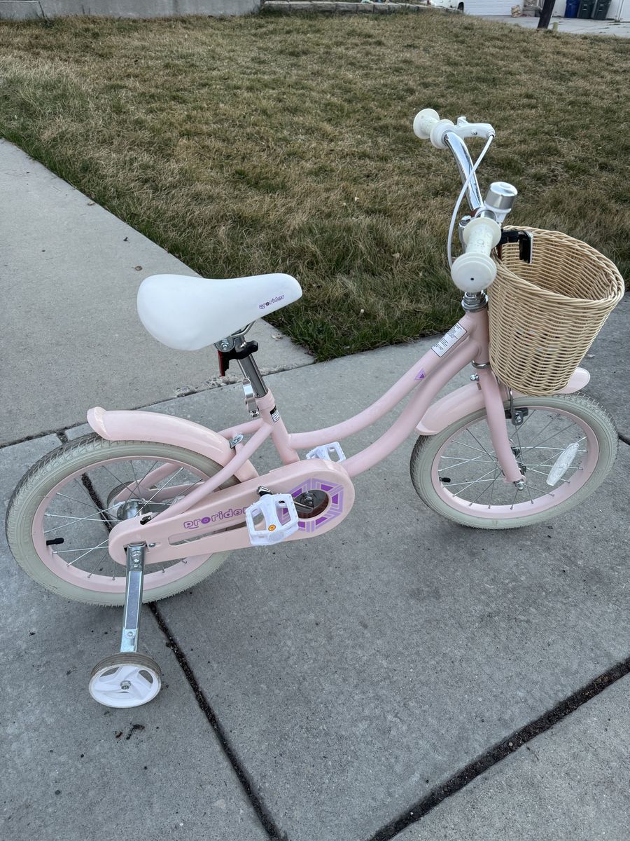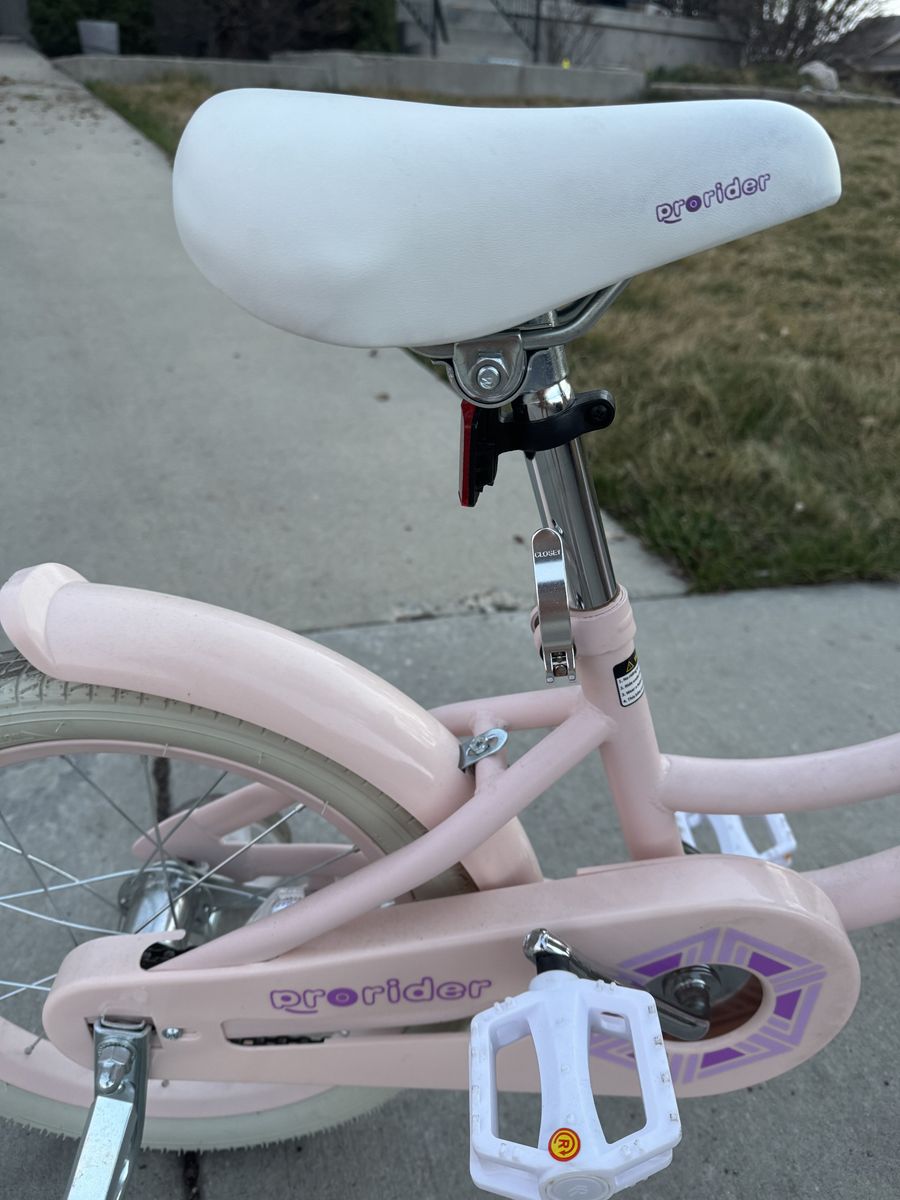 Prorider 16” Kids bike with training wheels and adjustable handle bar seat handbreak pink. Bike was used only a few times. Excellent condition. No scrapes, great tires and kept in the garage for storage.